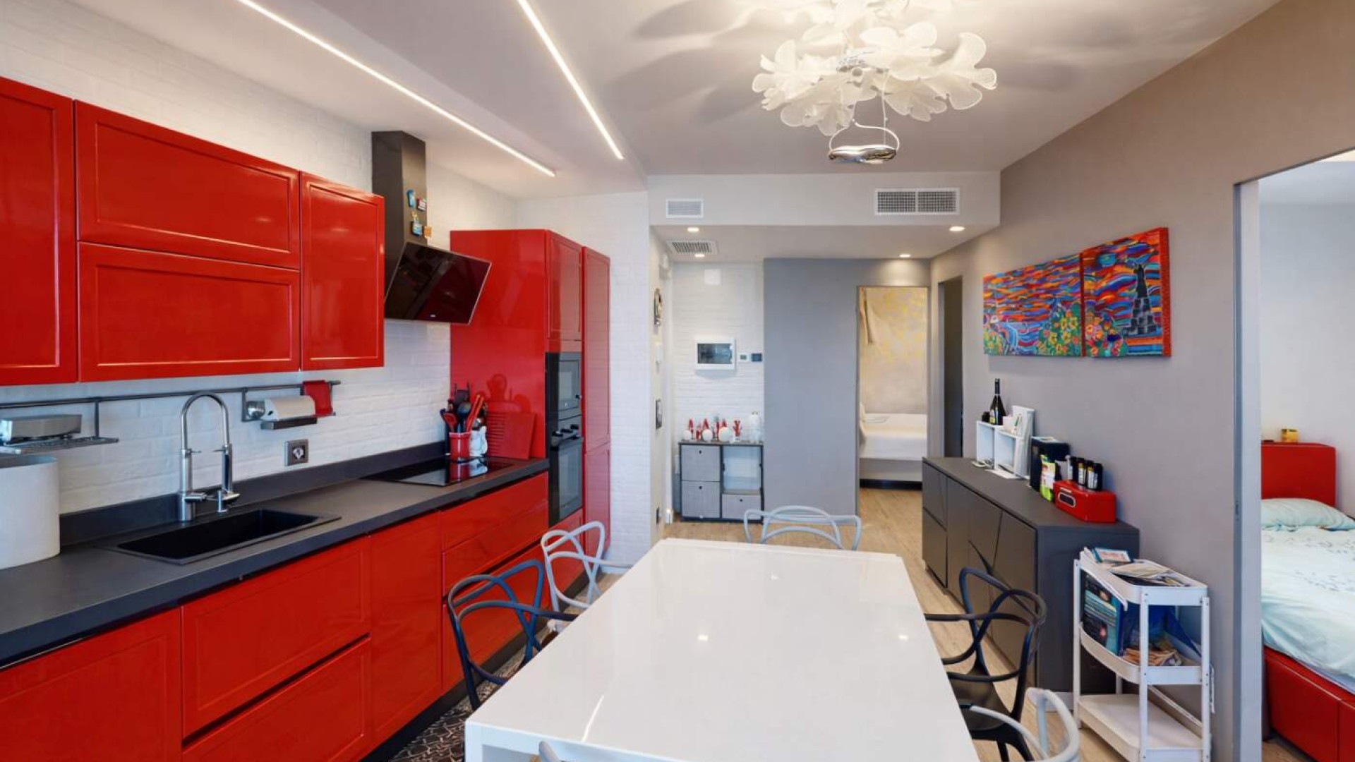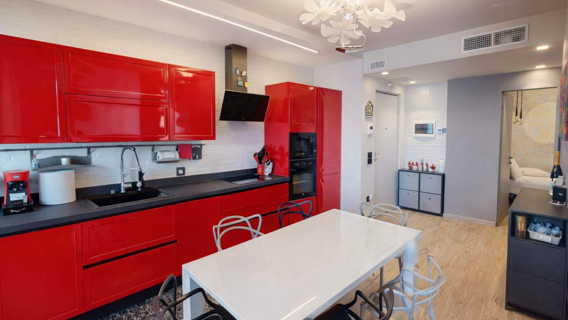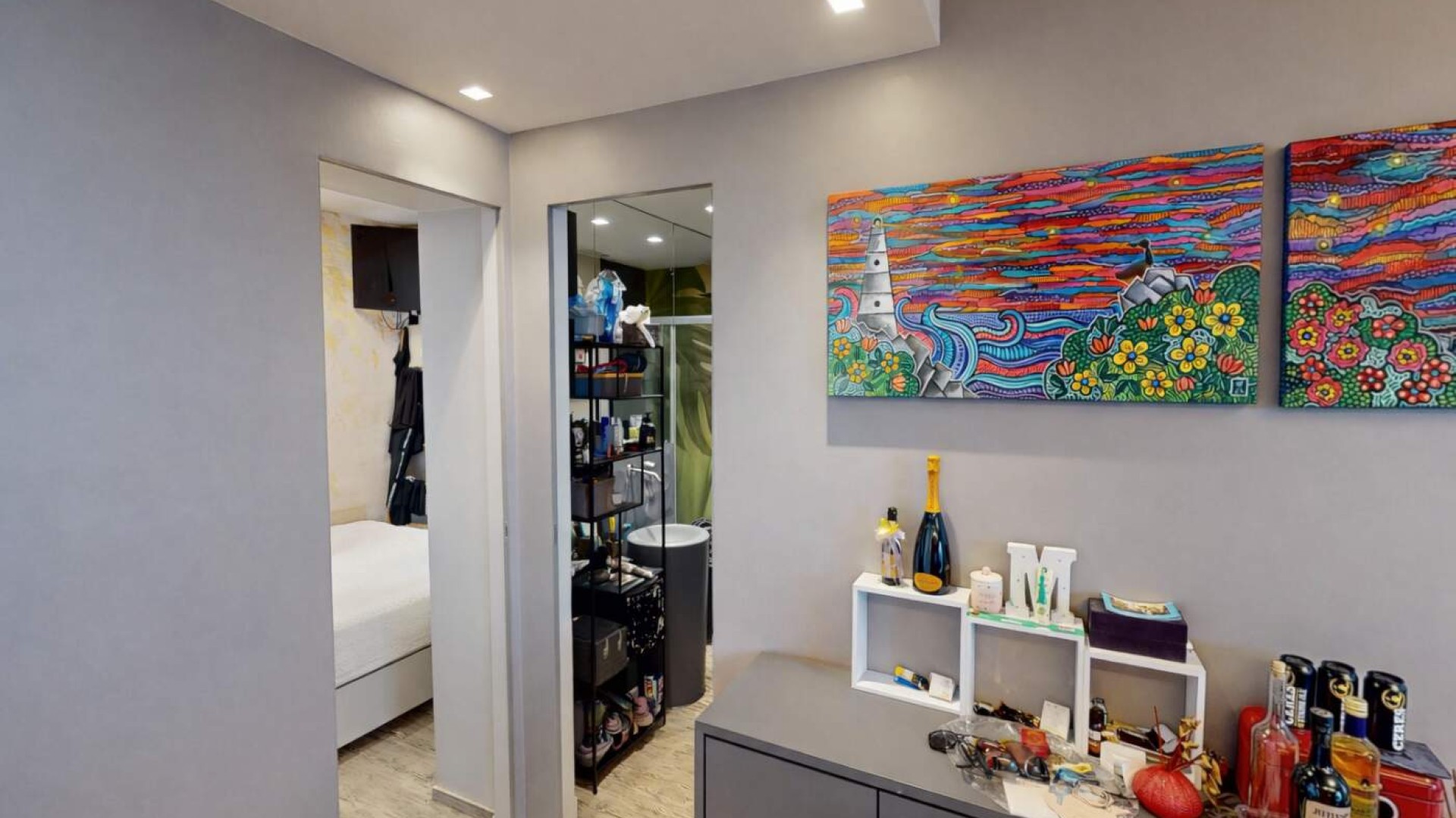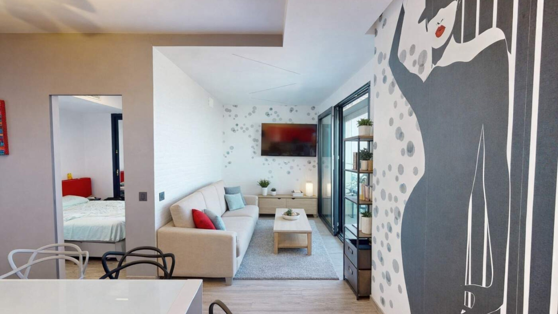 L’ingresso si apre su una zona giorno luminosa, dove il soggiorno con cucina a vista crea un ambiente moderno e conviviale, ideale per vivere appieno ogni momento della giornata.