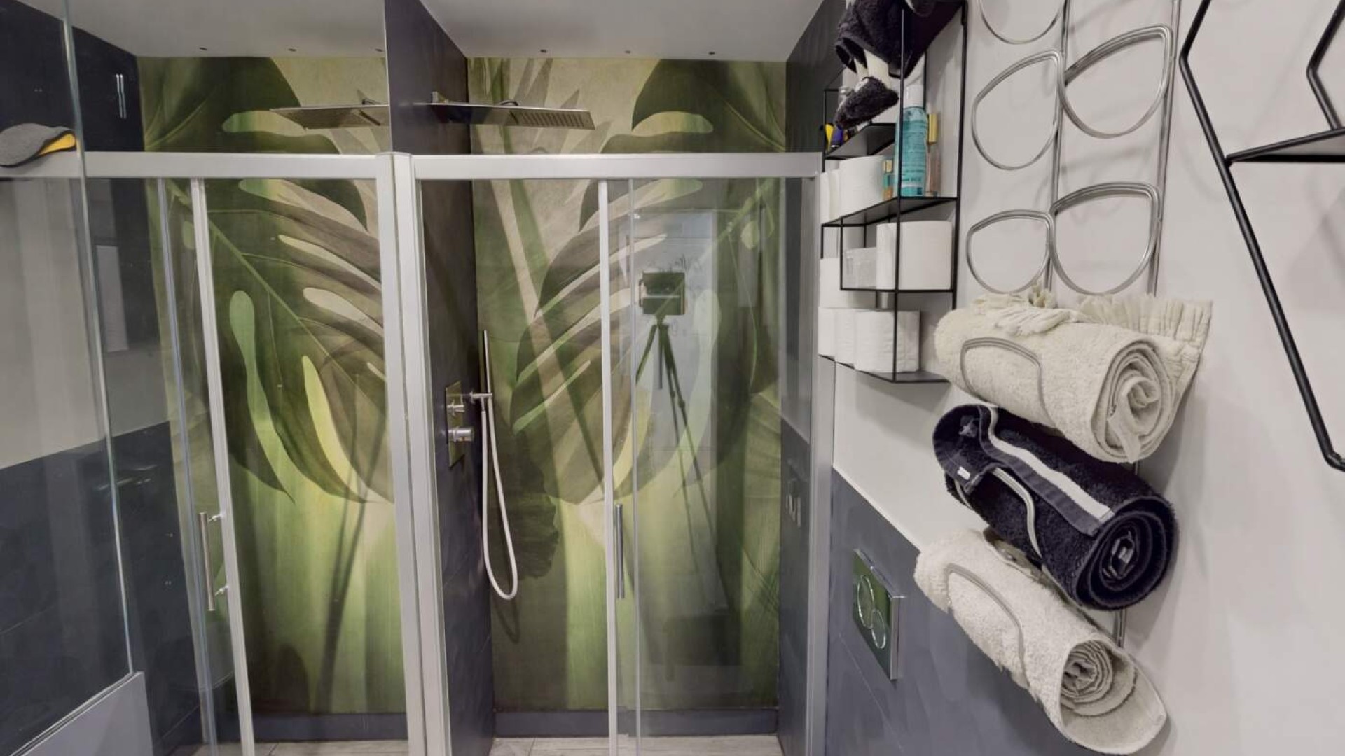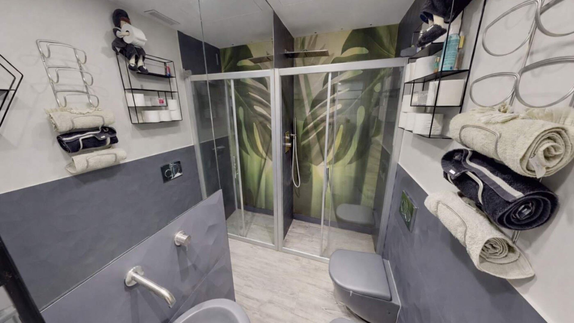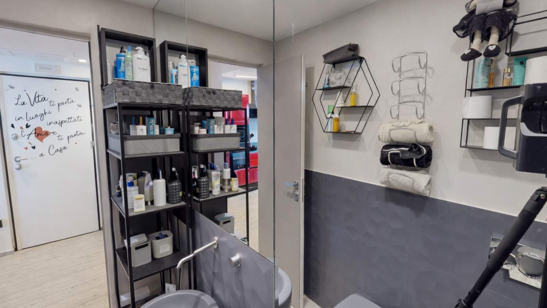 Il bagno, curato nei dettagli, è dotato di box doccia e sistema di aerazione forzata, garantendo funzionalità e comfort.