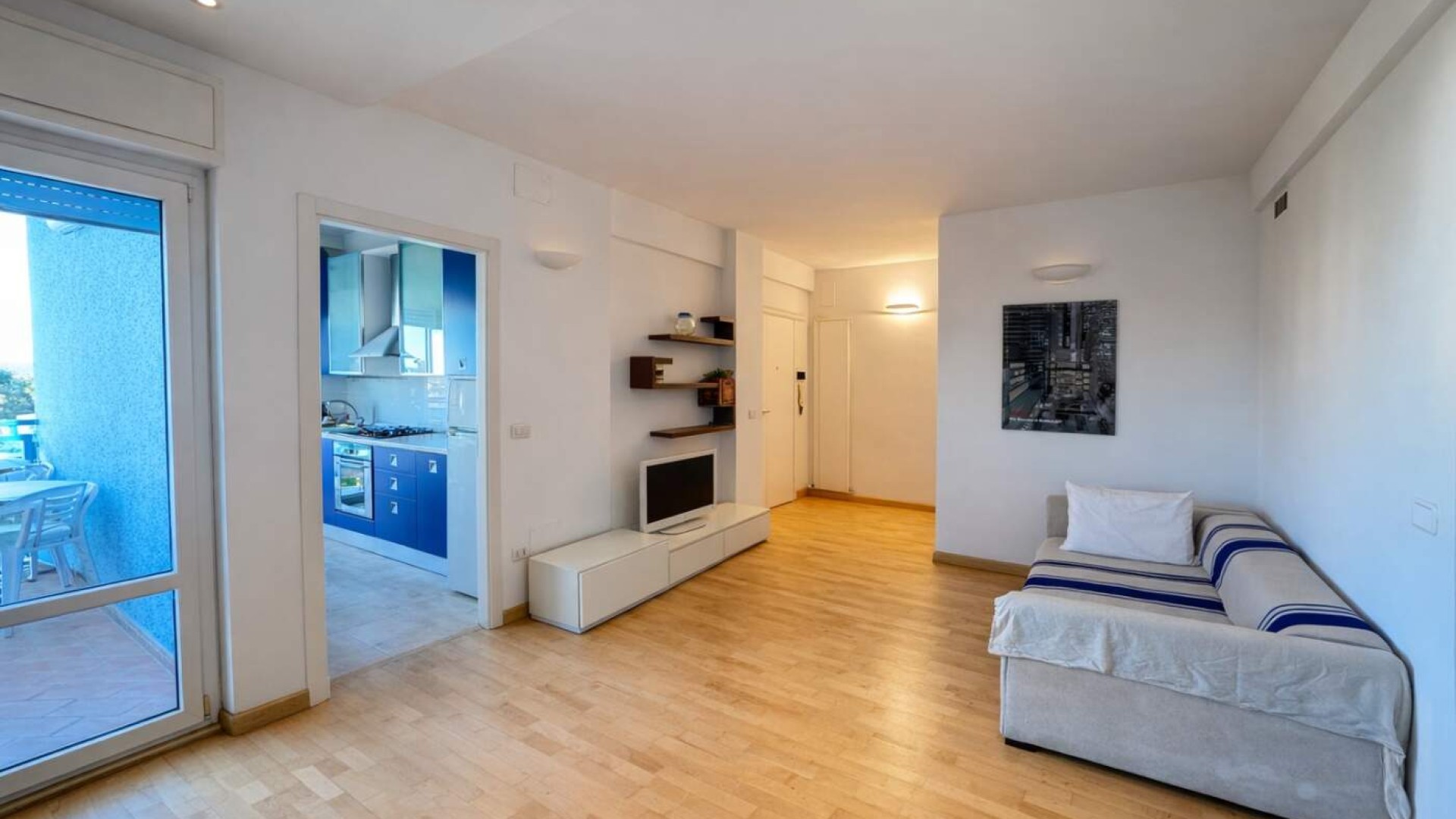 Il soggiorno, ampio e accogliente, è inondato di luce naturale e si affaccia su un terrazzo abitabile con vista mare, uno spazio perfetto per momenti di relax all’aria aperta, pranzi estivi o semplicemente per godere della brezza marina.