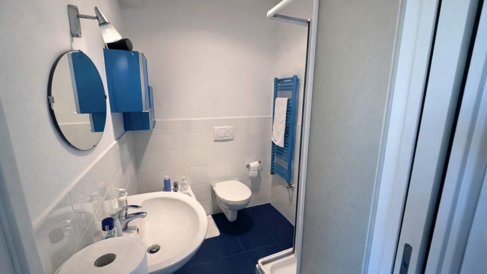 Il bagno, é dotato di sistema di aerazione, è rifinito con gusto contemporaneo e completo di box doccia.