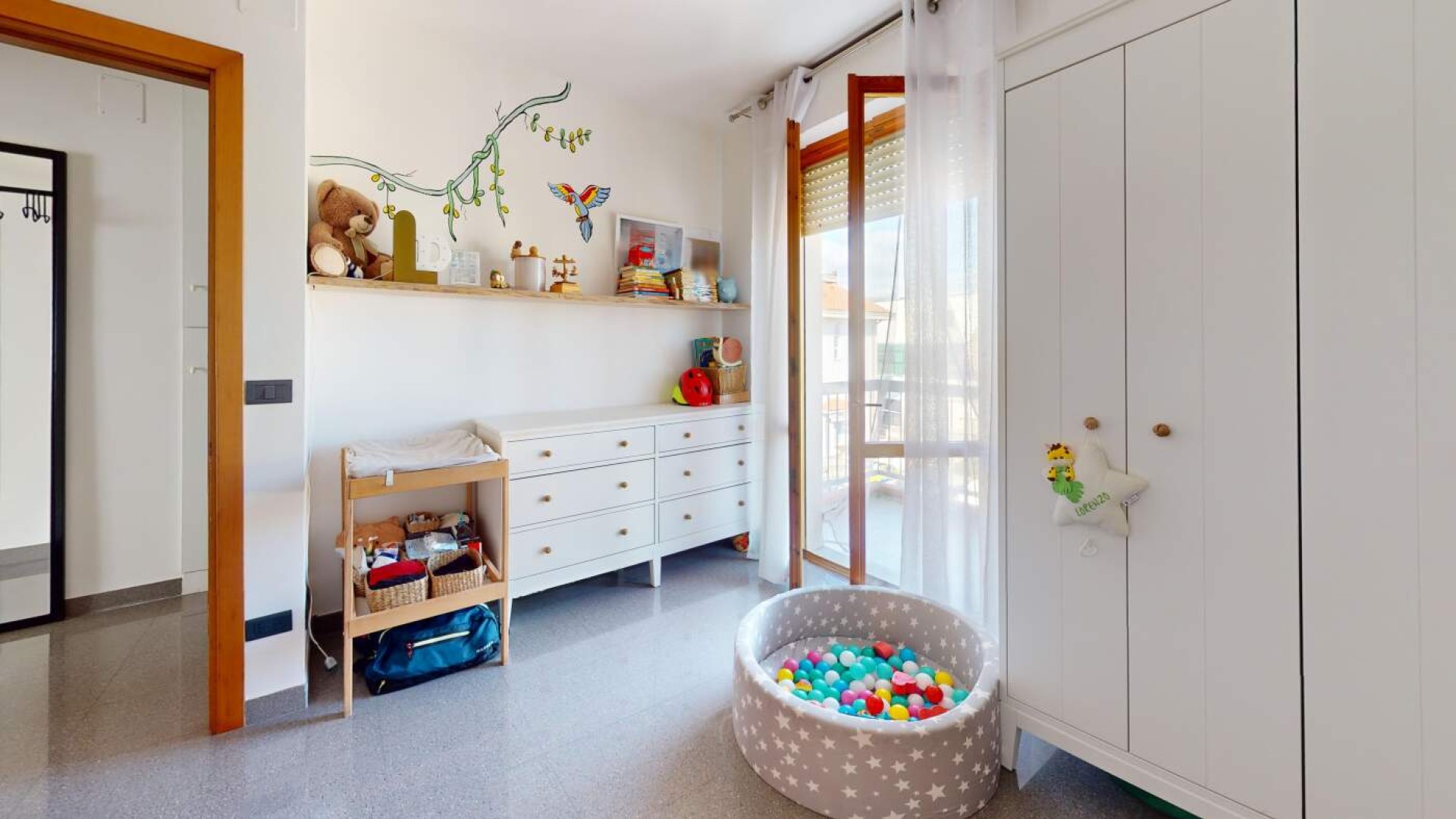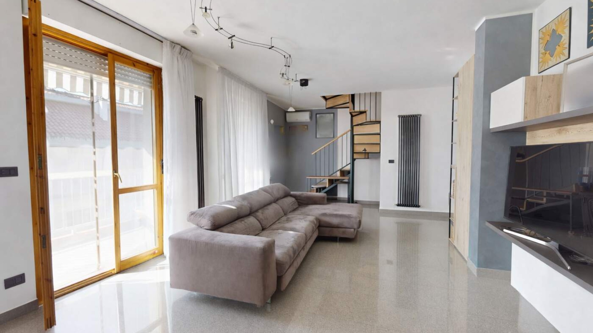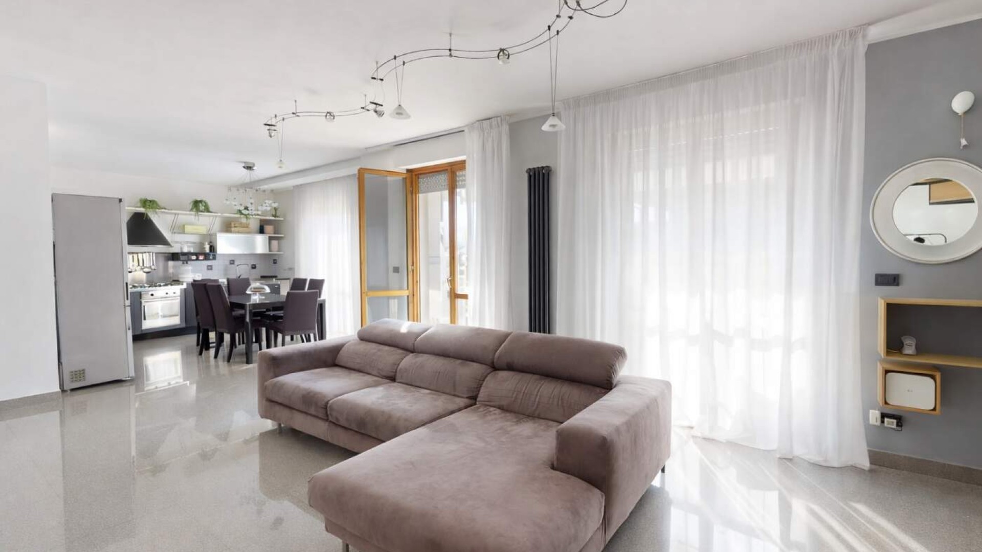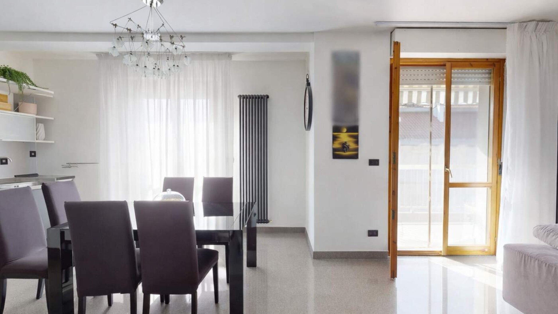 L’ingresso introduce in un ampio soggiorno, accogliente e ben proporzionato, impreziosito da aperture che conducono al balcone e creano una piacevole continuità tra interno ed esterno.