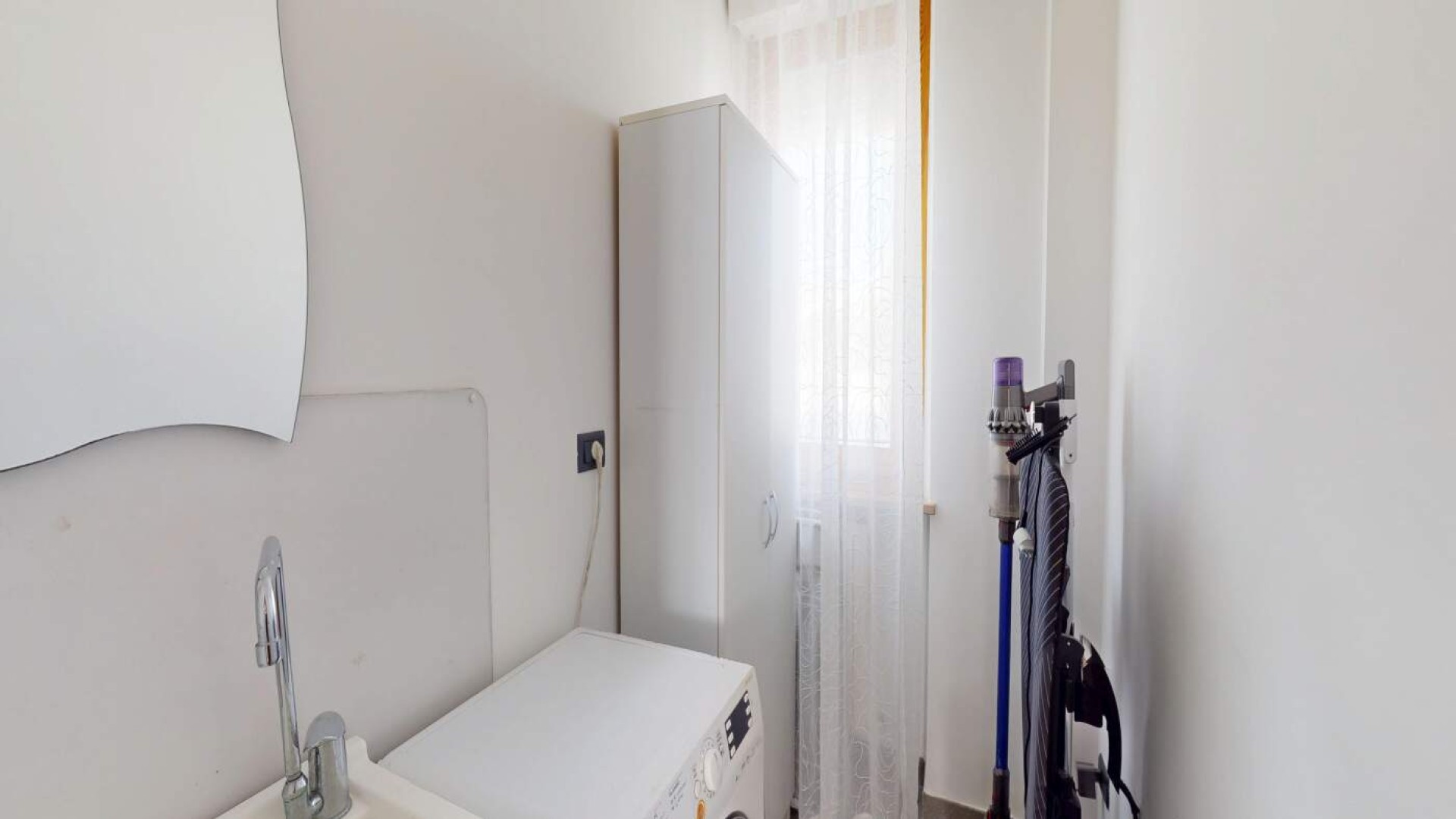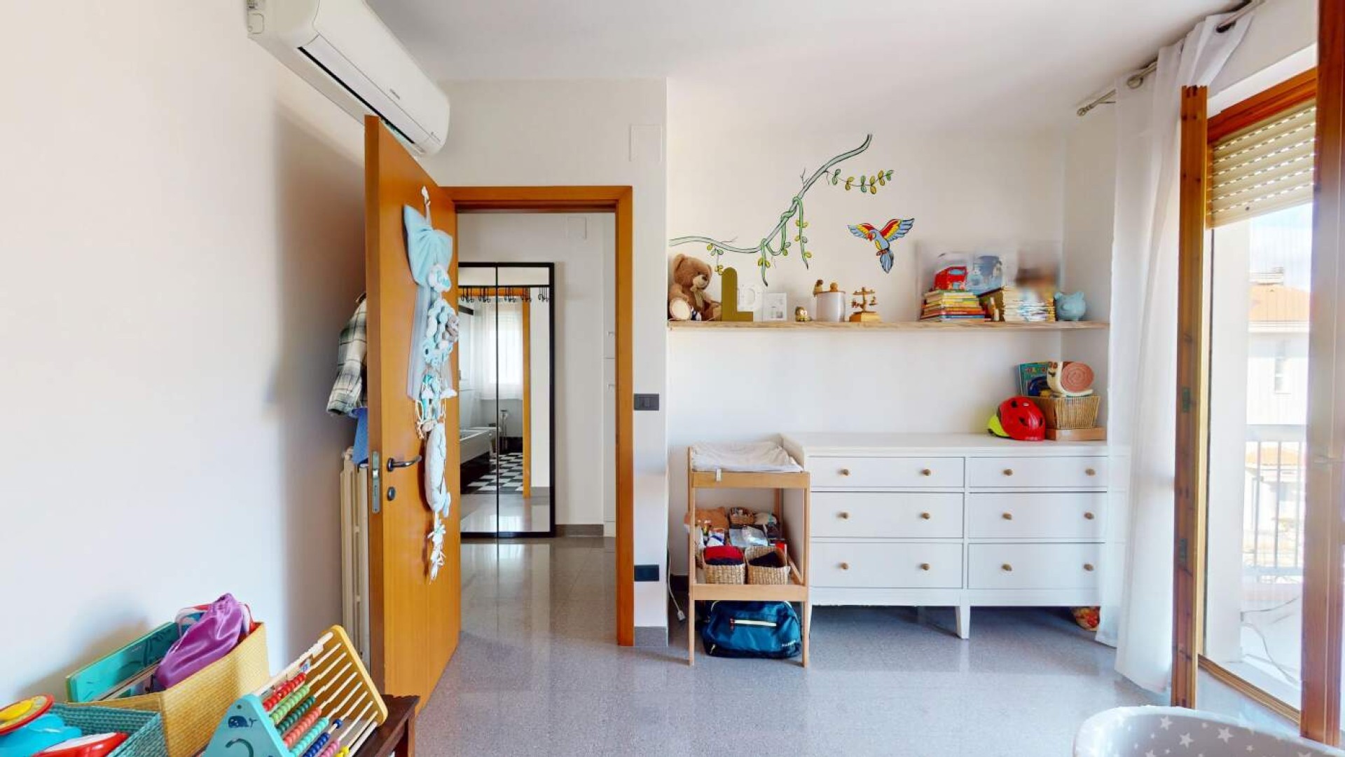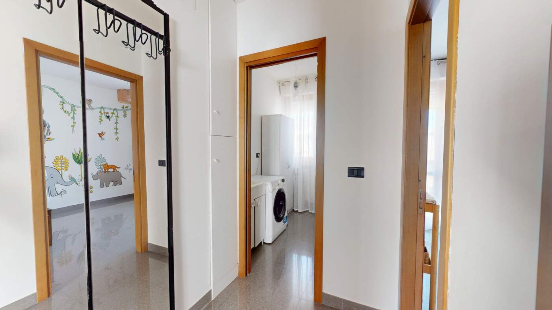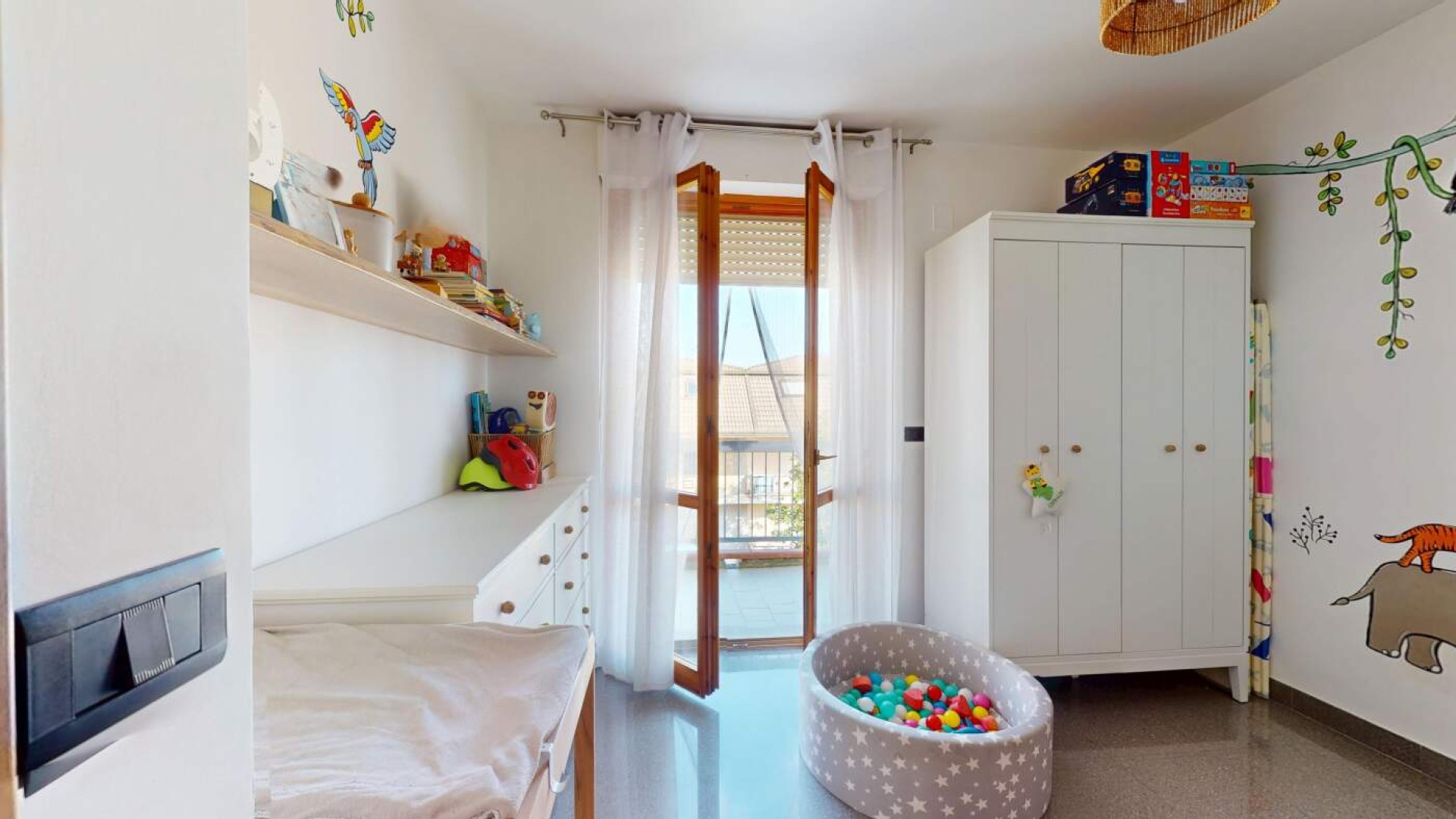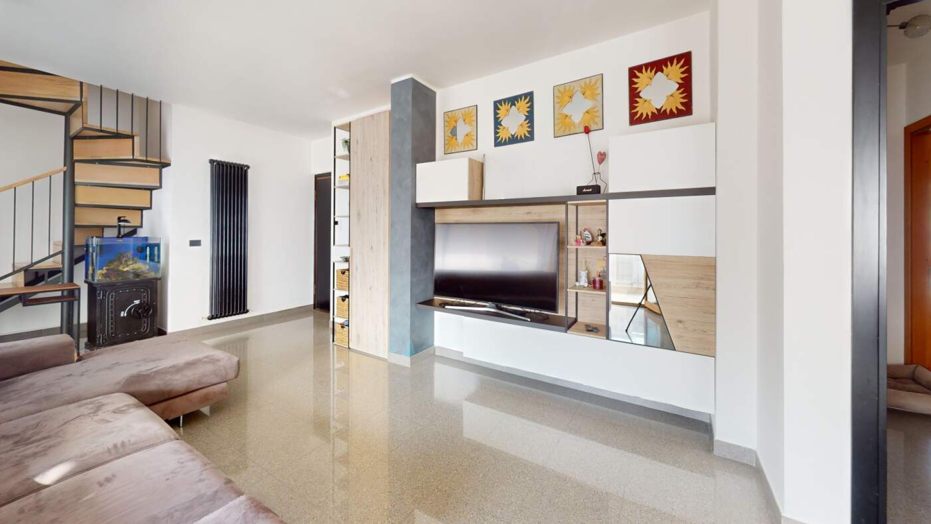 L’ingresso introduce in un ampio soggiorno, accogliente e ben proporzionato, impreziosito da aperture che conducono al balcone e creano una piacevole continuità tra interno ed esterno.