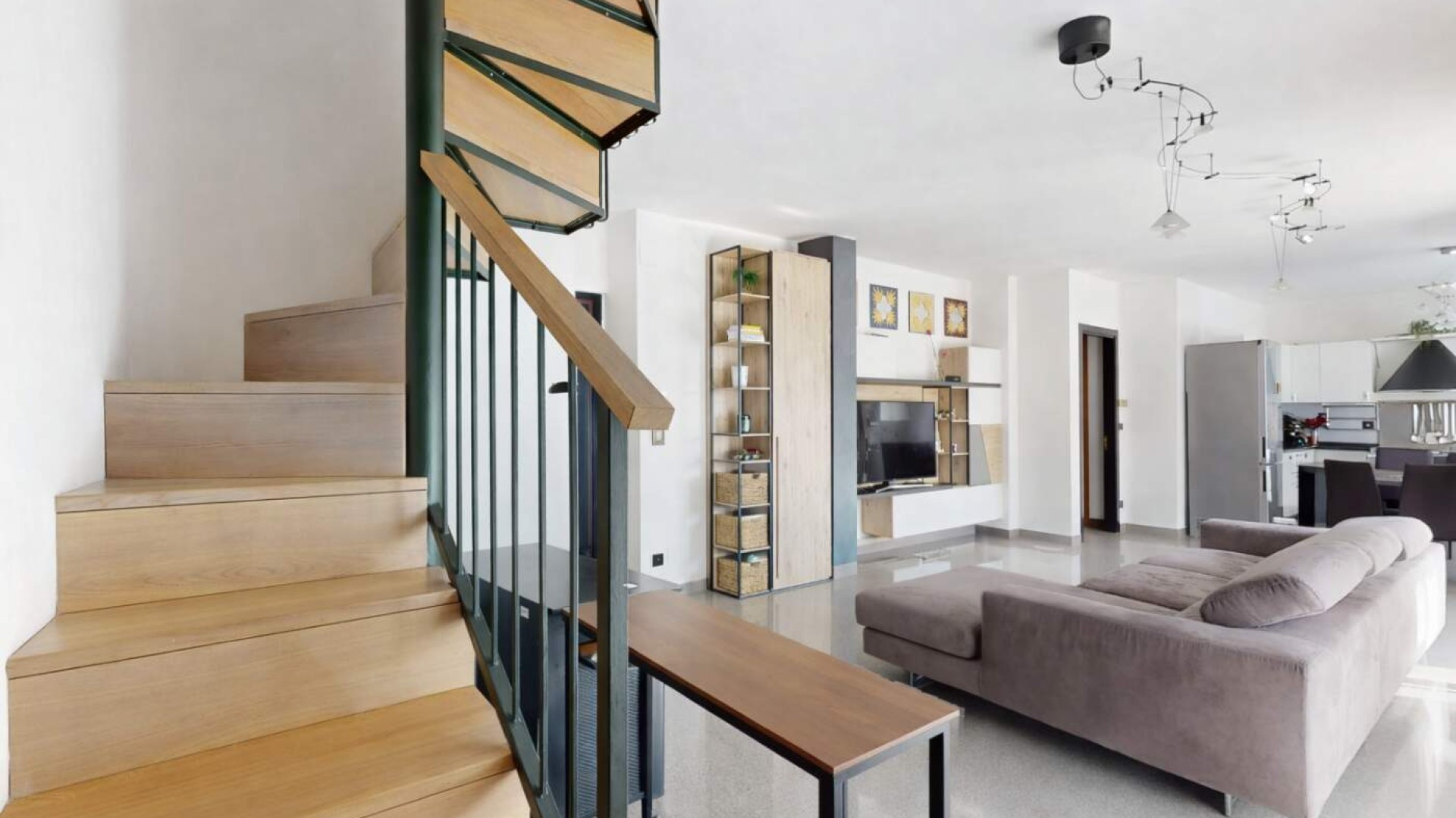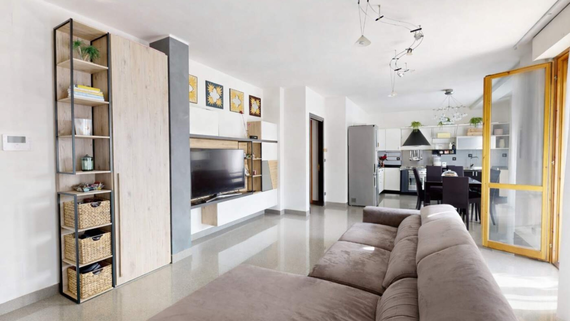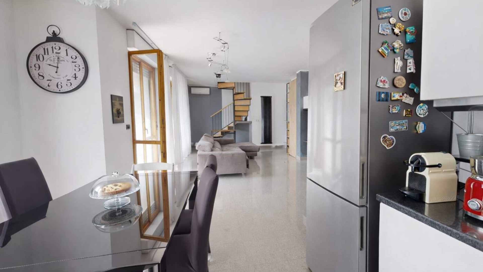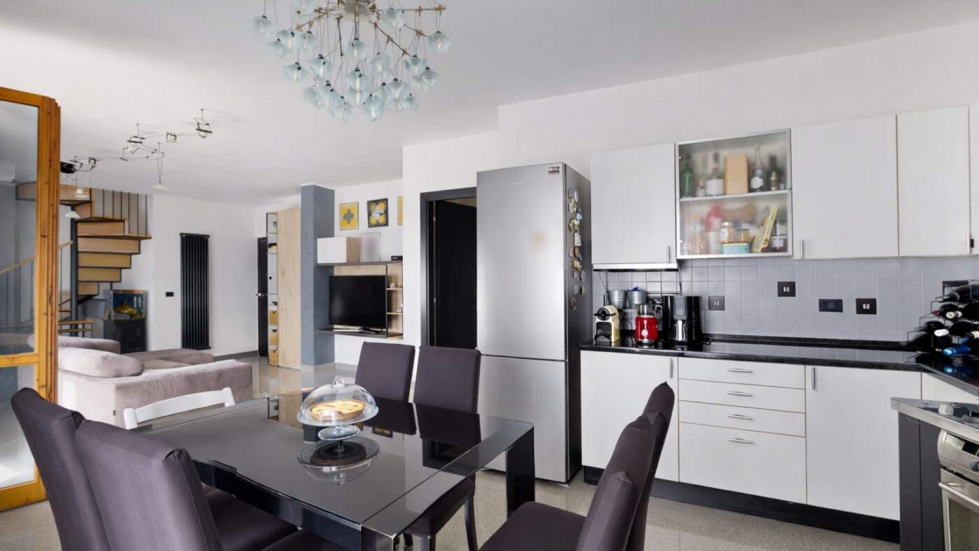 La cucina a vista, armoniosamente integrata nella zona living, dispone anch’essa di accesso a un balconcino, rendendo l’ambiente funzionale e particolarmente arioso.