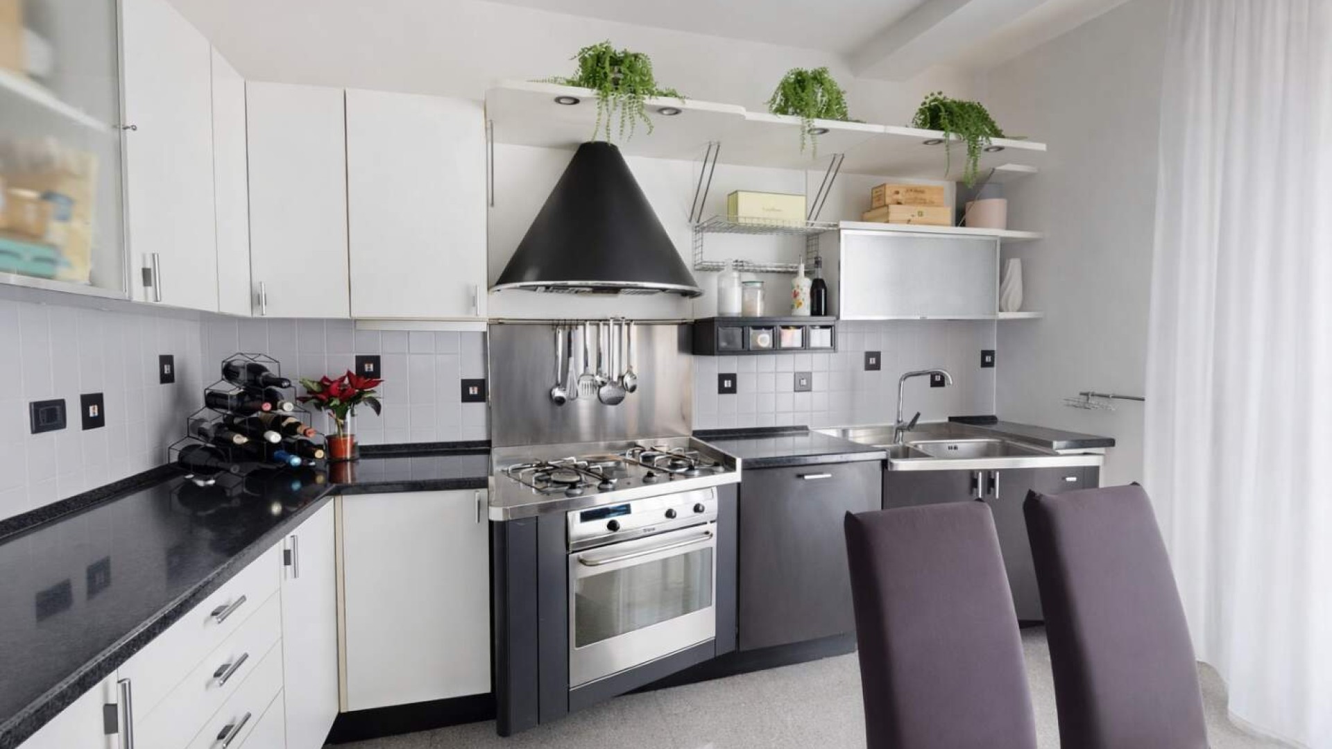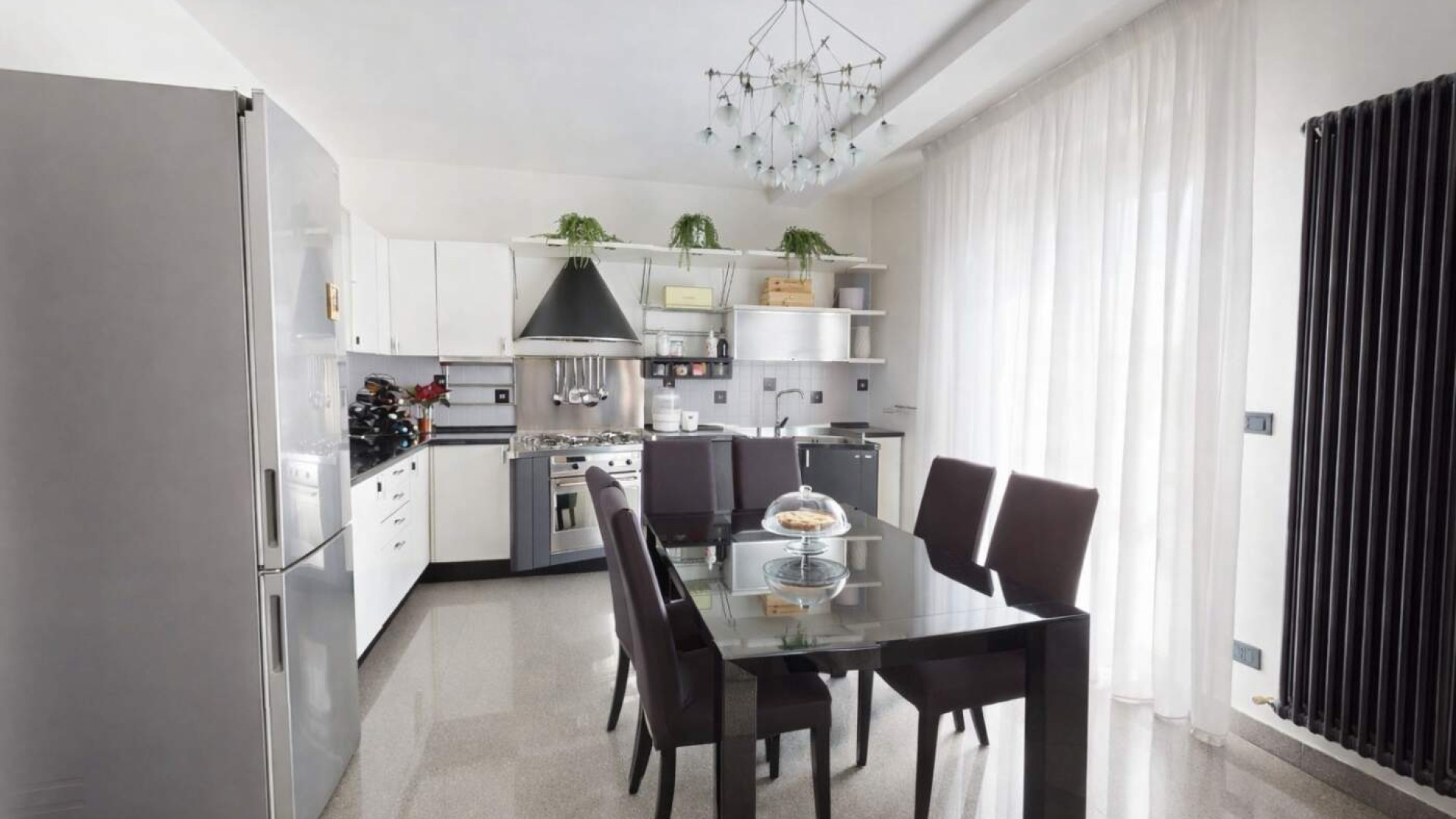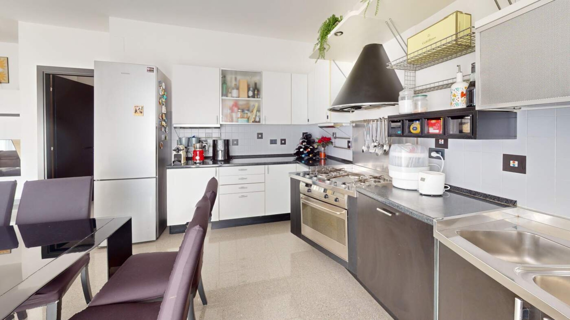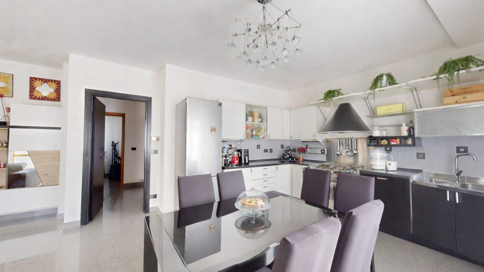 La cucina a vista, armoniosamente integrata nella zona living, dispone anch’essa di accesso a un balconcino, rendendo l’ambiente funzionale e particolarmente arioso.