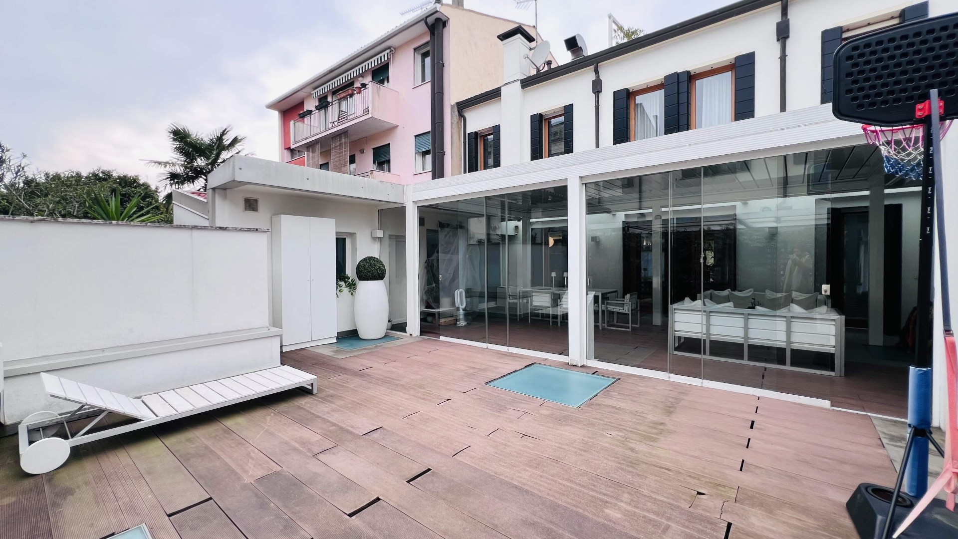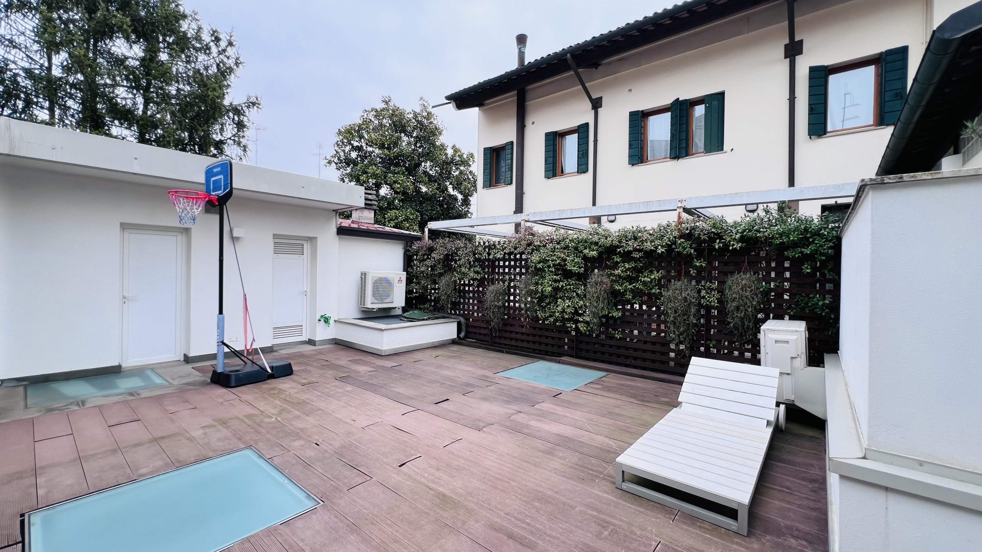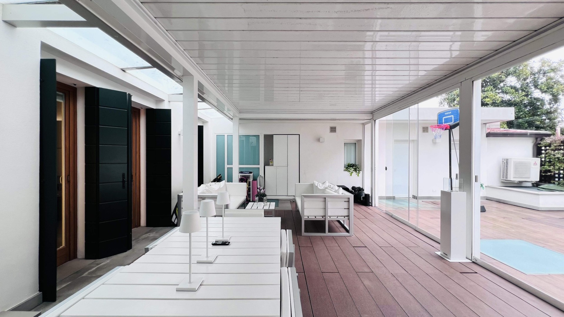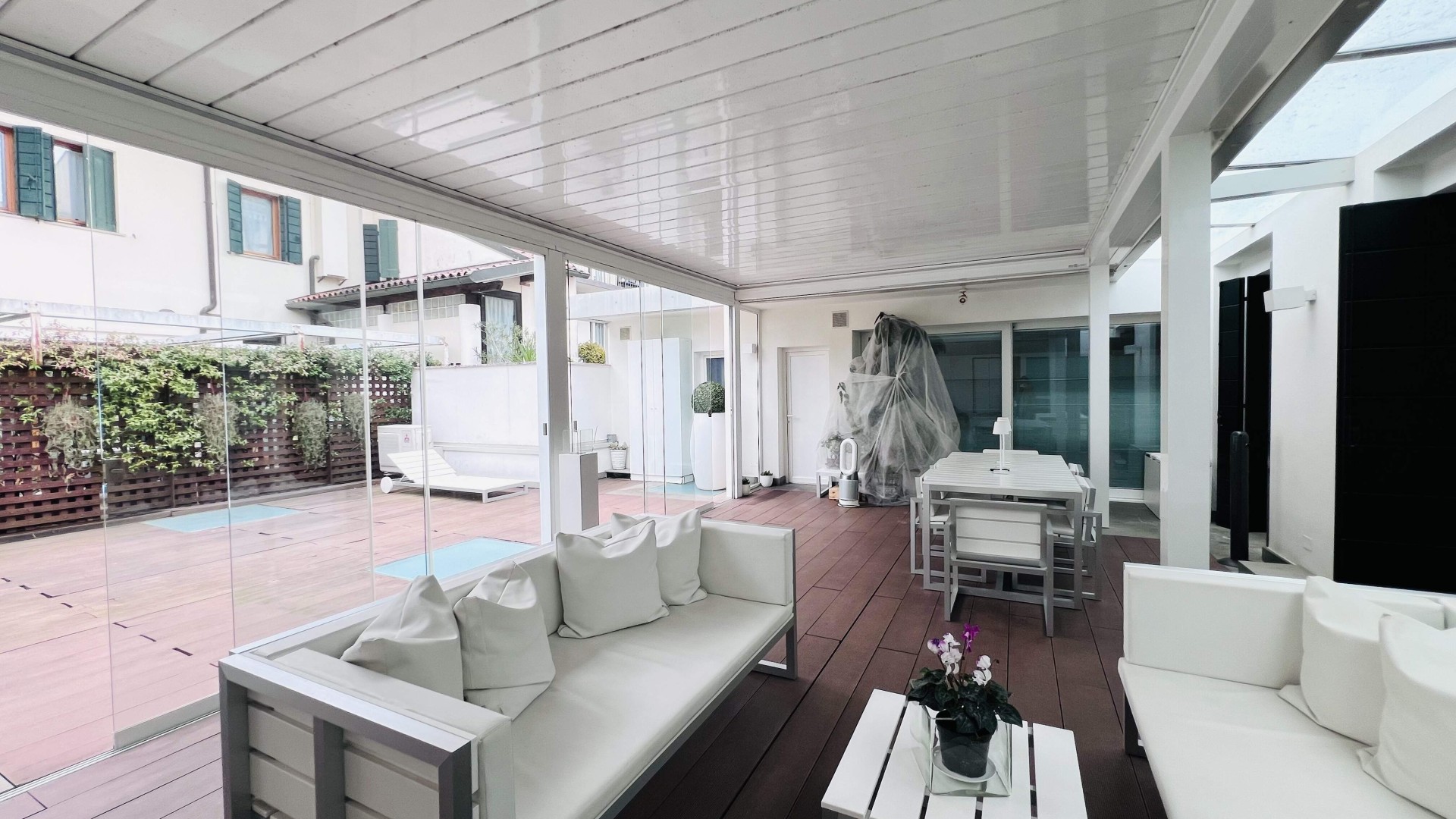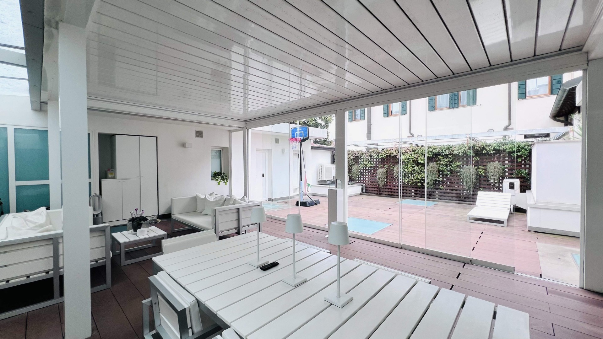 Lo spazio esterno di ca. 92 mq è composto da una zona con la pergotenda ed una scoperta.