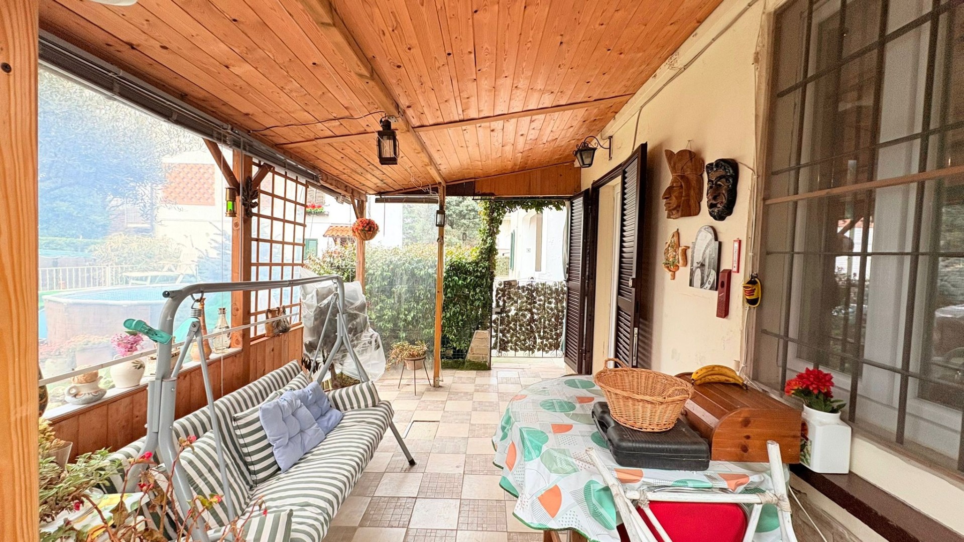 Prima dell’ingresso si trova una comoda e caratteristica area soppalcata esterna, perfetta come spazio di accoglienza o zona relax, attrezzata con griglia ideale per momenti conviviali all’aperto.