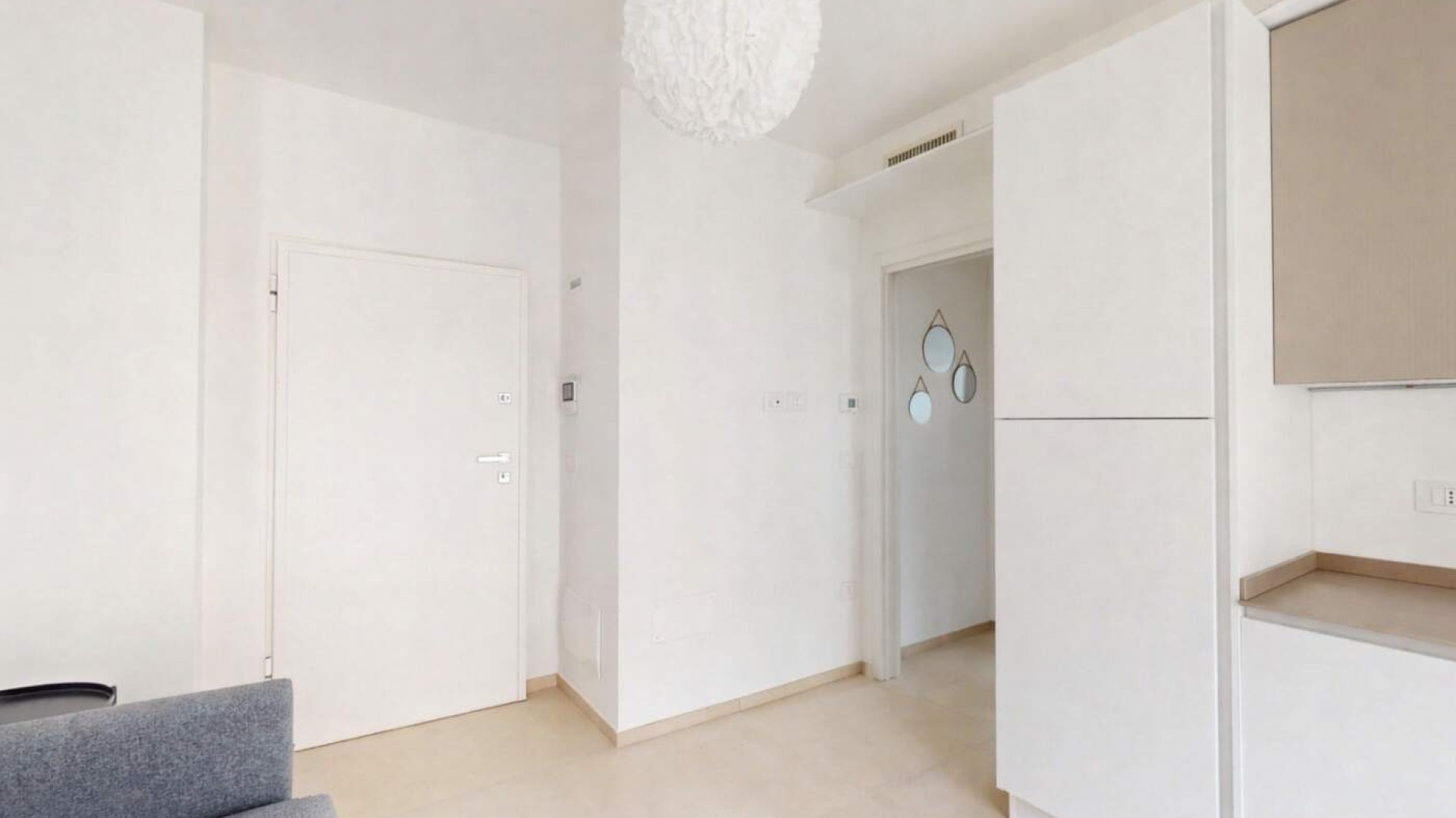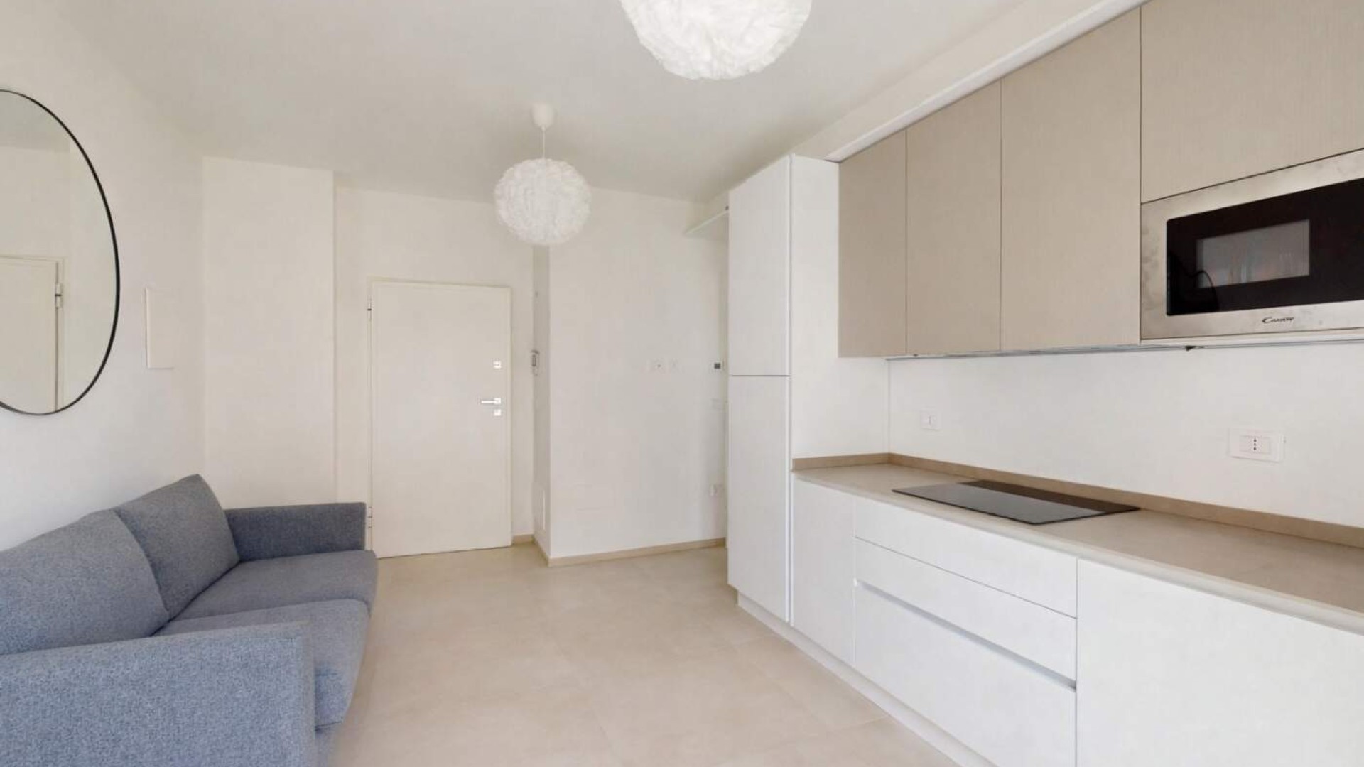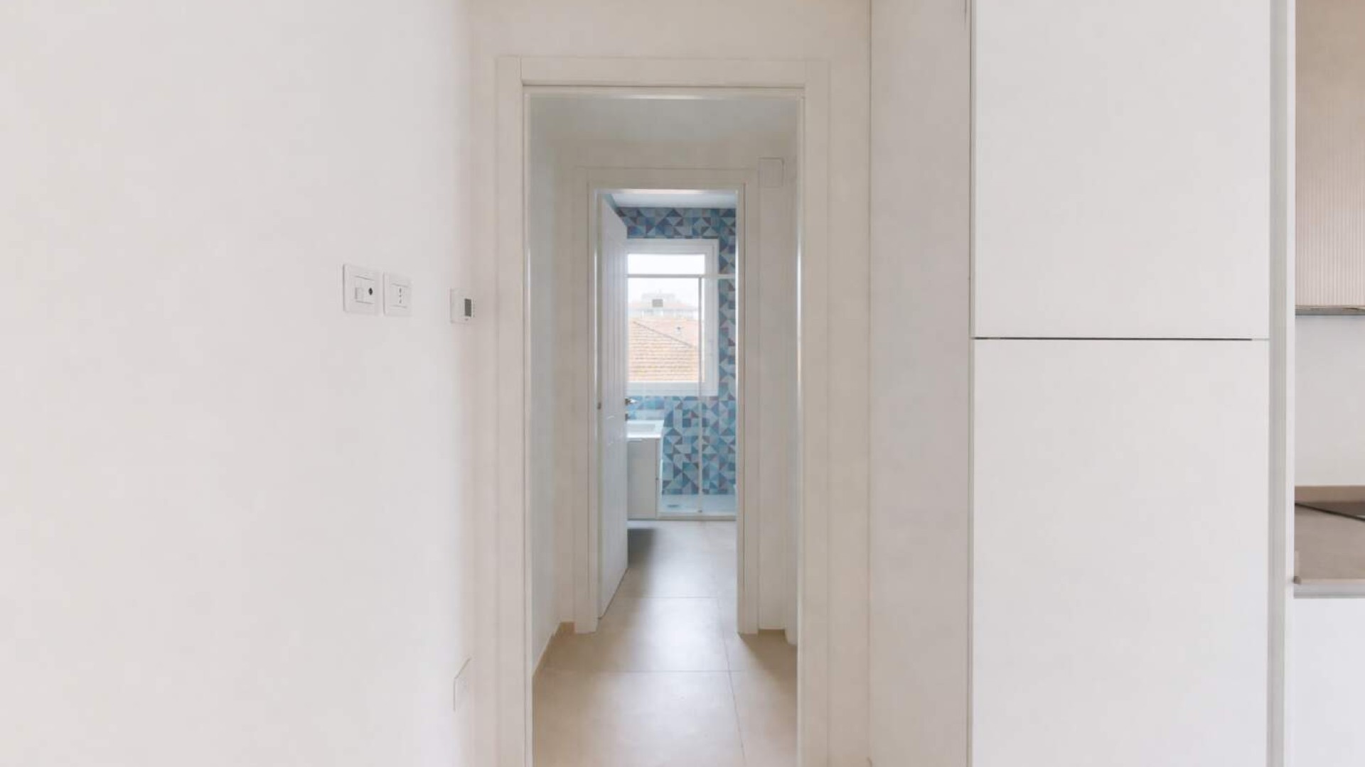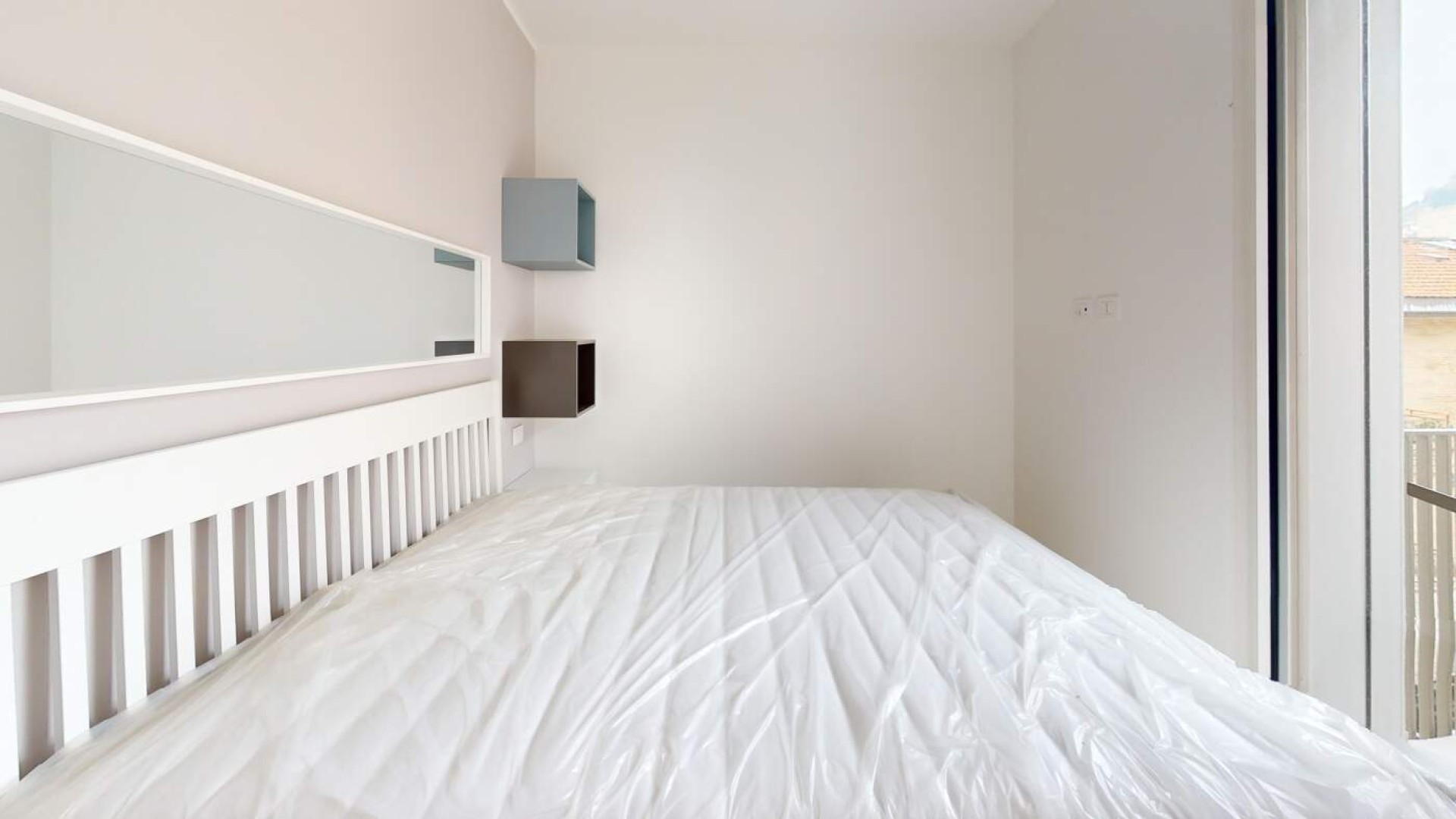 L’ingresso si apre su un accogliente soggiorno con angolo cottura e balcone alla francese, proseguendo verso il disimpegno che conduce al bagno finestrato con box doccia e alla camera matrimoniale anch’essa dotata di balcone alla francese.