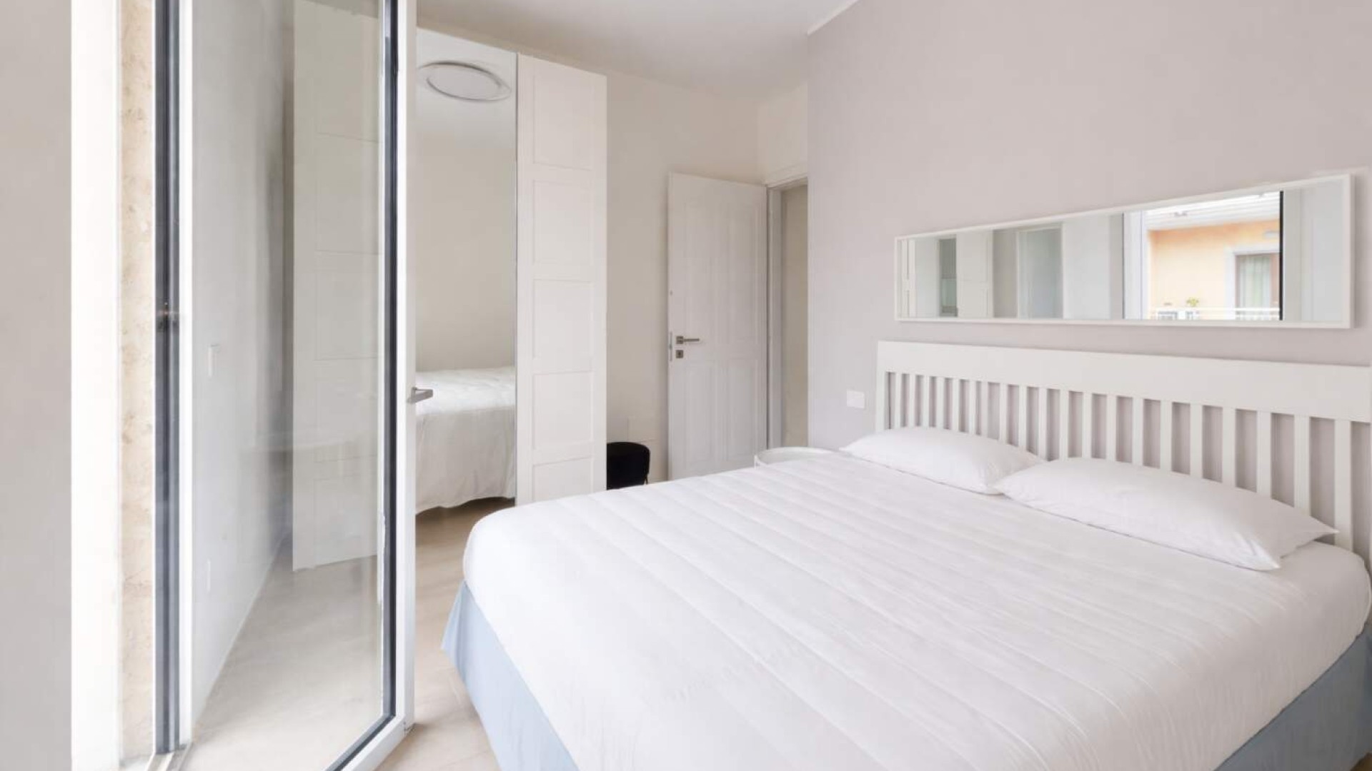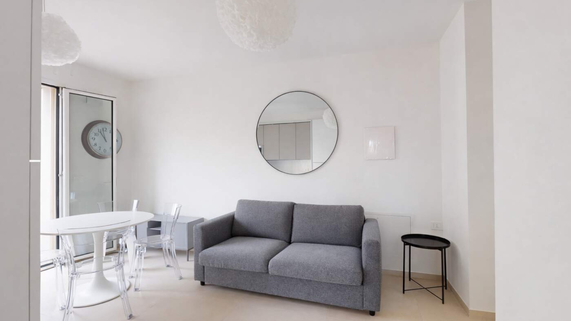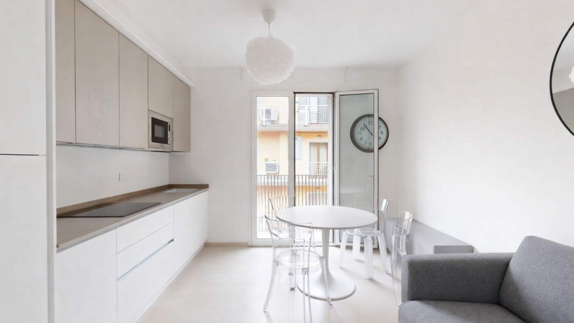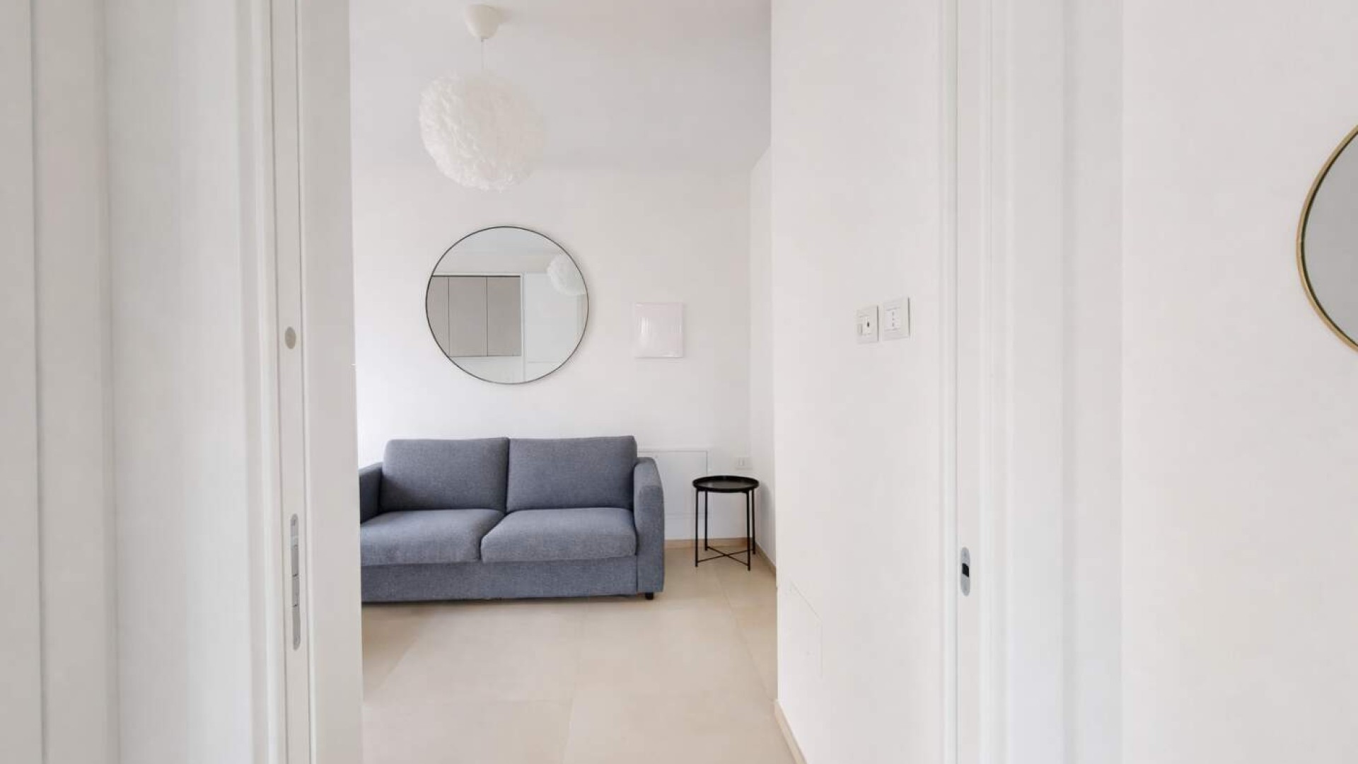 L’ingresso si apre su un accogliente soggiorno con angolo cottura e balcone alla francese, proseguendo verso il disimpegno che conduce al bagno finestrato con box doccia e alla camera matrimoniale anch’essa dotata di balcone alla francese.