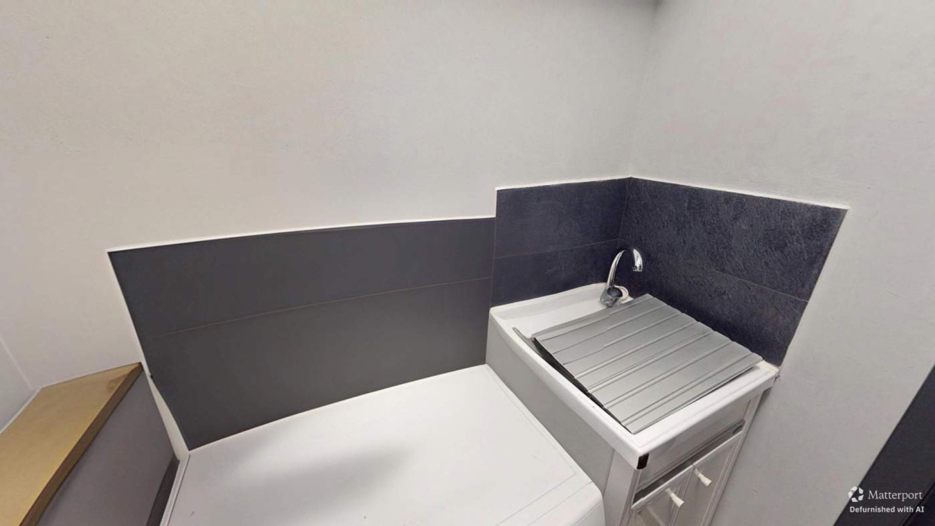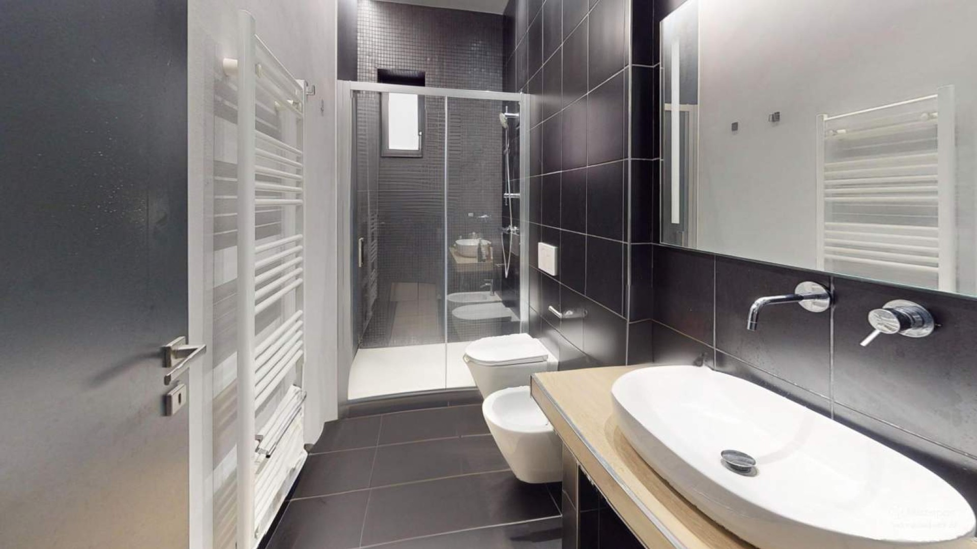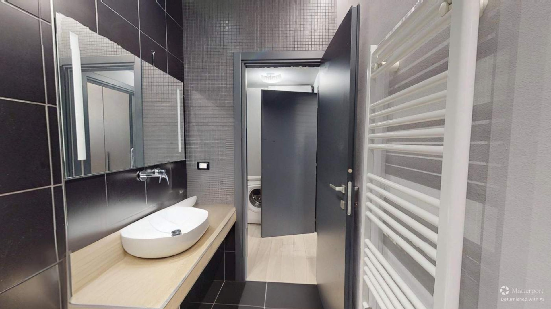 Un disimpegno conduce alla zona lavanderia, dotata di ripostiglio a soffitto, e al bagno finestrato, completamente ristrutturato e rifinito con box doccia, rivestimento in mosaico Bisazza, per il massimo comfort.