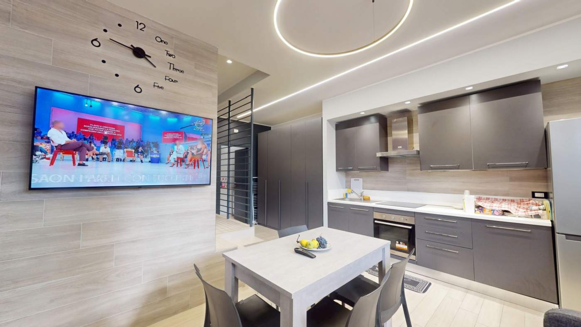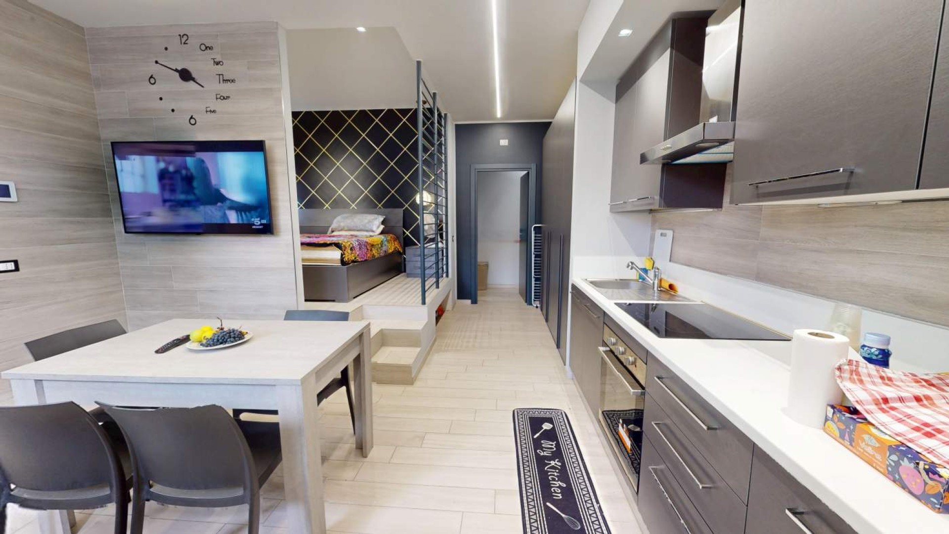 L’ingresso conduce in un luminoso soggiorno con cucina a vista perfettamente integrata nello spazio, pensata per coniugare praticità ed eleganza.