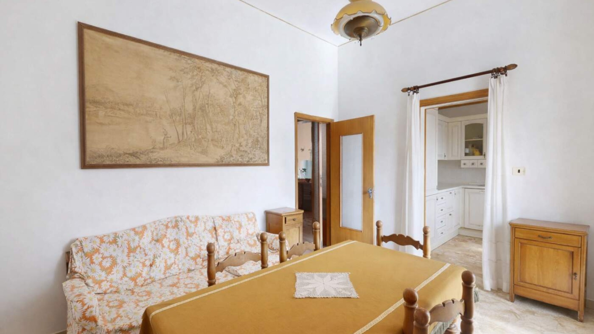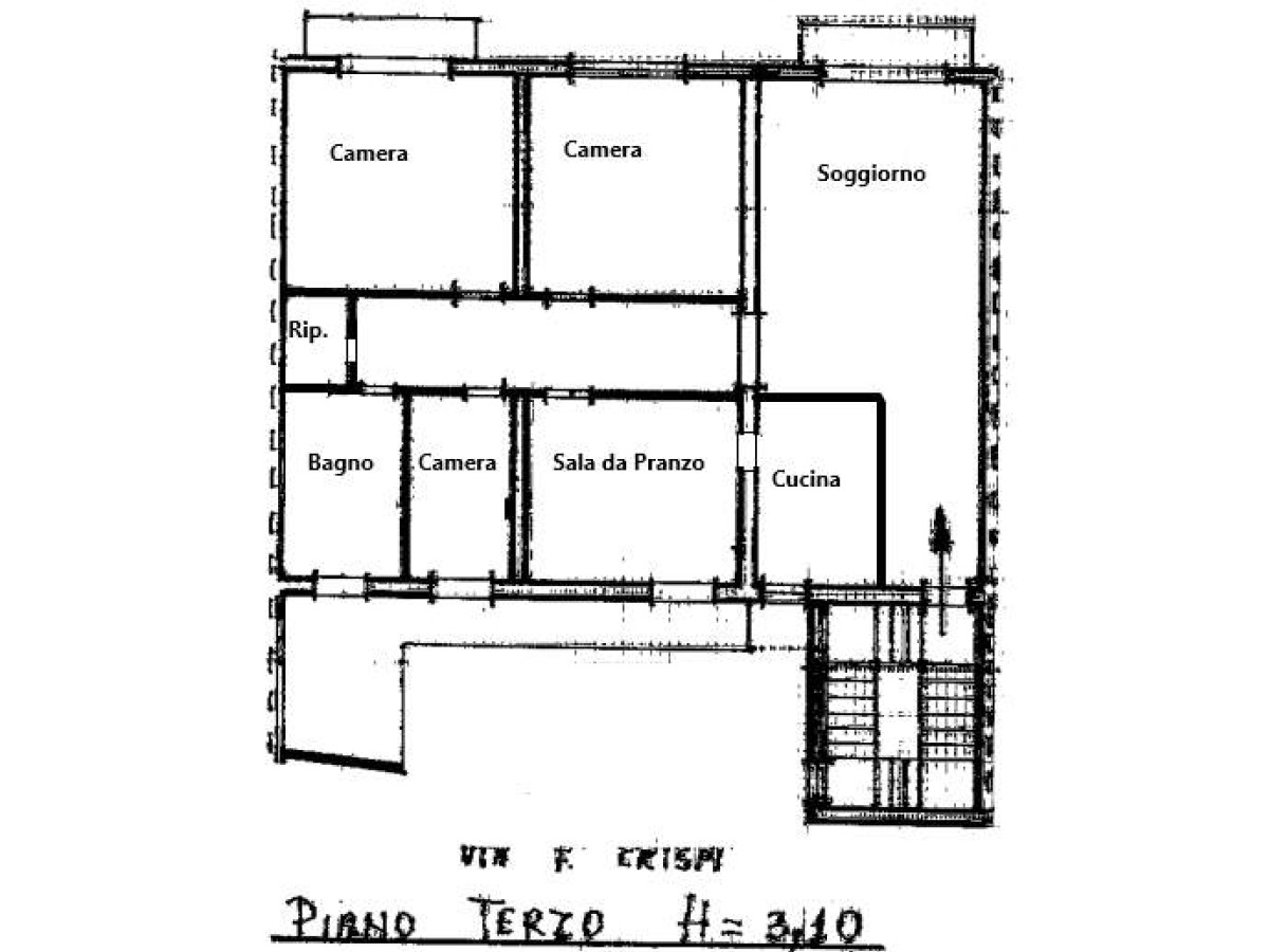 Proseguendo troviamo una sala da pranzo separata, anch’essa dotata di balcone con affaccio su Via Francesco Crispi, collegata alla cucina indipendente, uno spazio funzionale che può essere reinterpretato secondo le esigenze abitative moderne.