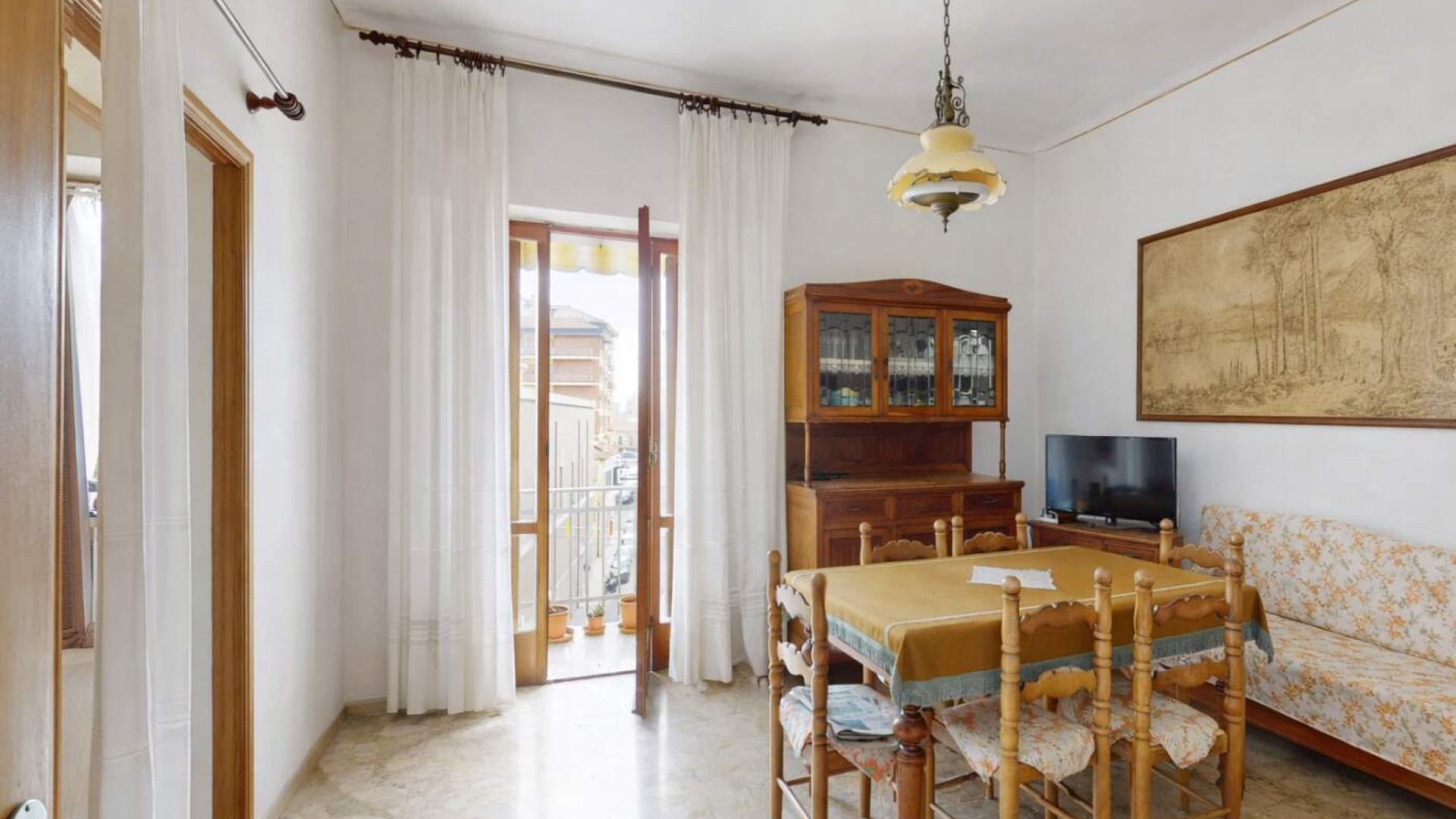 L’ingresso accoglie in un comodo disimpegno che conduce verso un ampio e luminoso soggiorno, arricchito dalla presenza di un balcone con affaccio su Via XX Settembre, che garantisce una piacevole apertura verso l’esterno e una buona luminosità naturale durante la giornata.