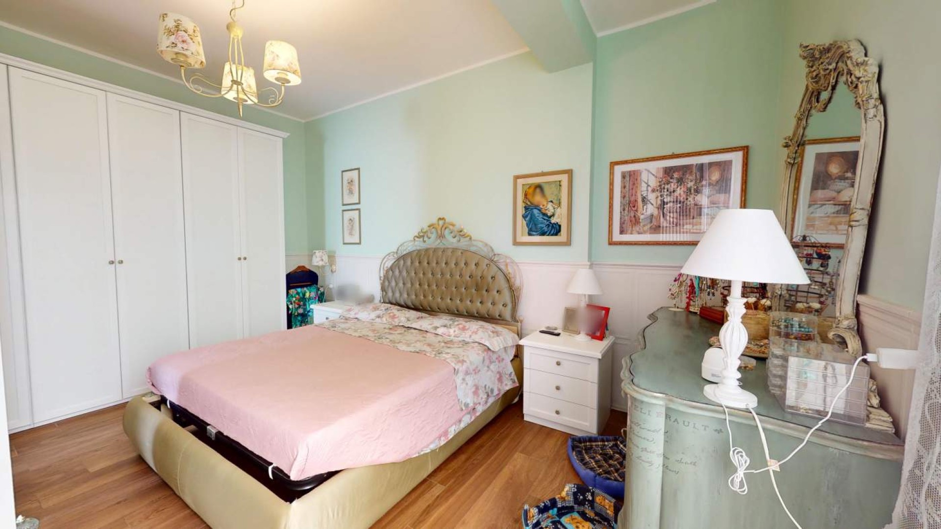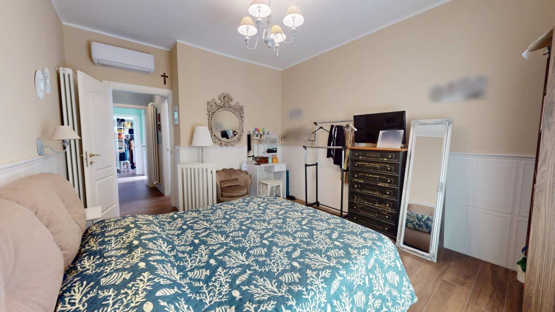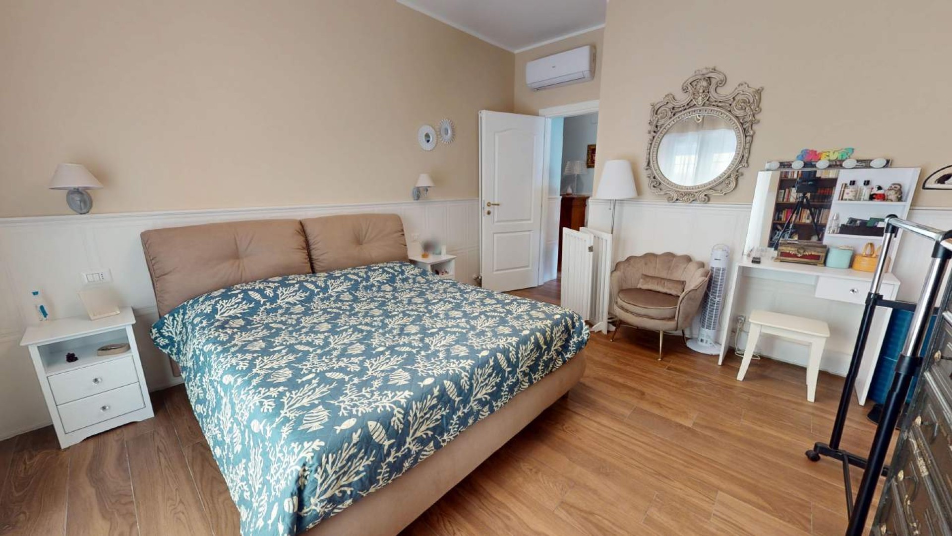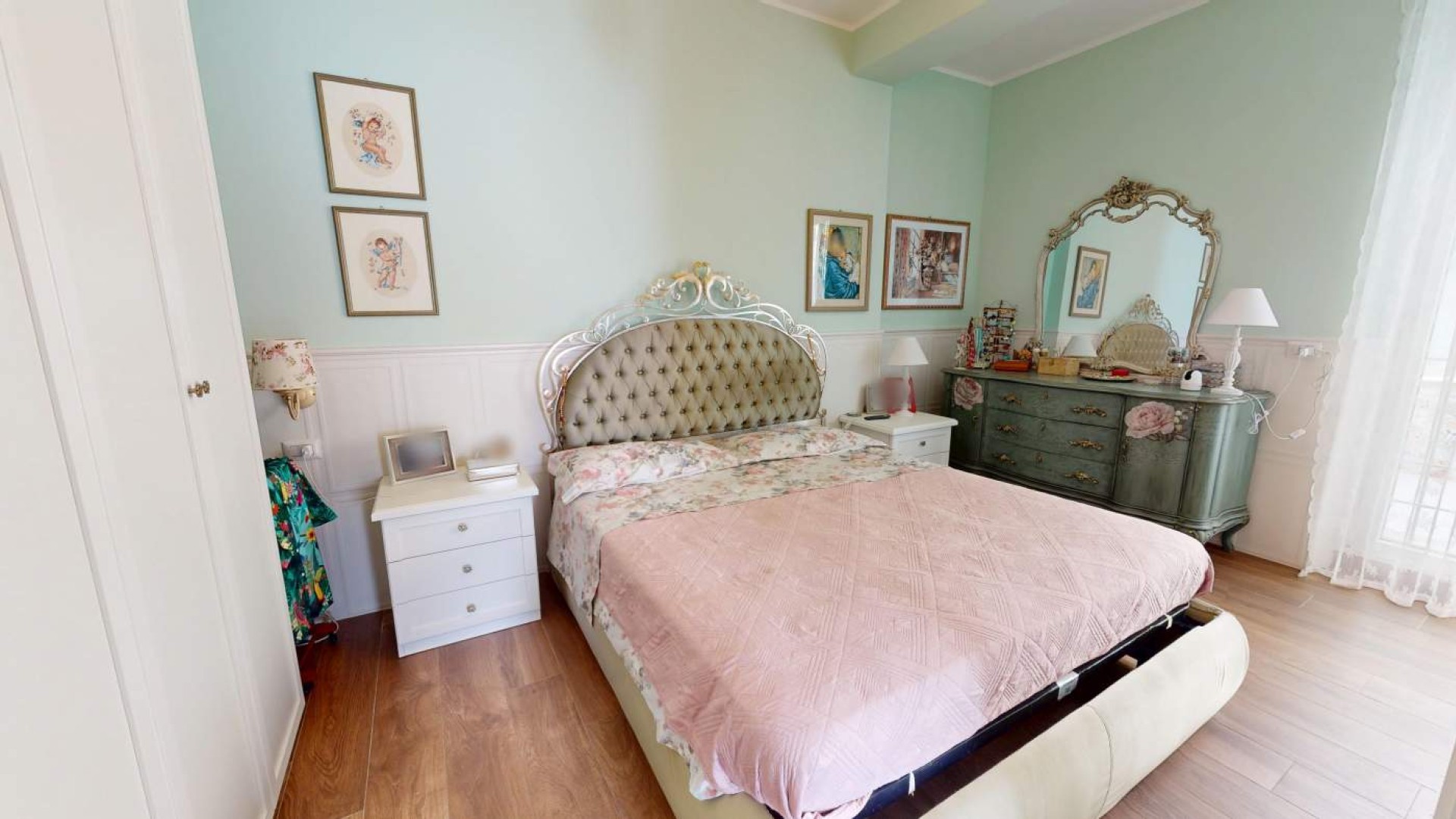 La zona notte, ben separata dalla zona giorno, comprende due spaziose camere matrimoniali con affaccio sul terrazzo e una terza stanza attualmente adibita a cabina armadio, ma facilmente utilizzabile come cameretta o studio.
