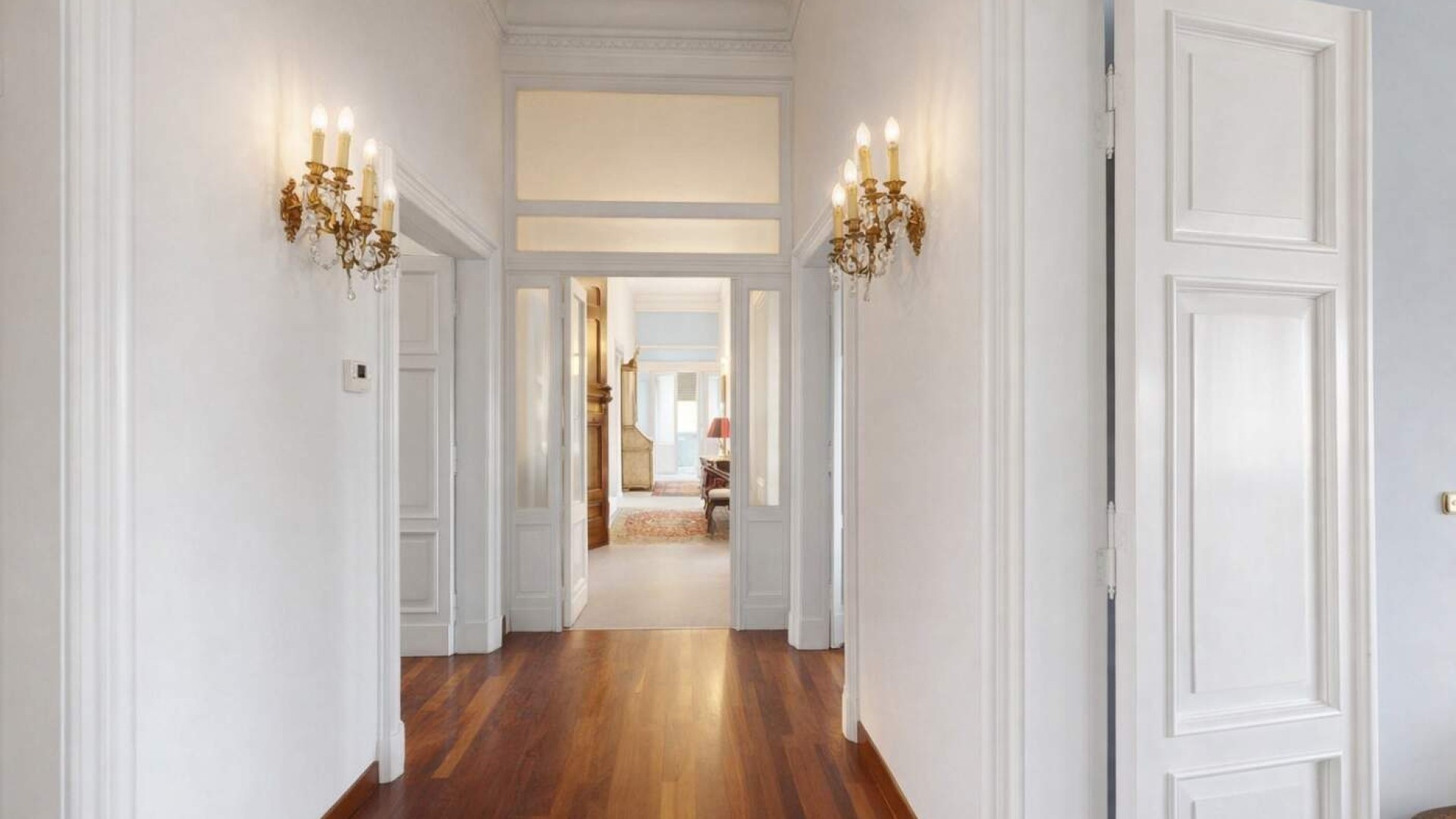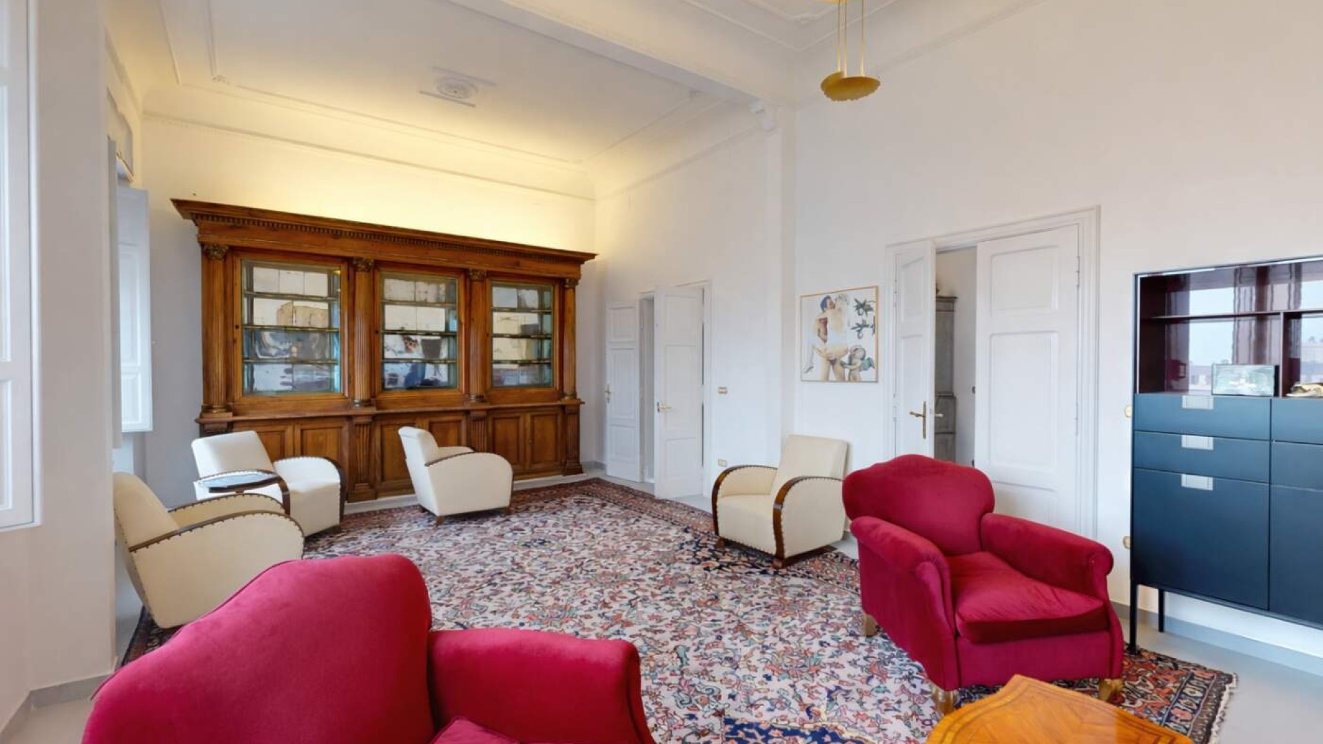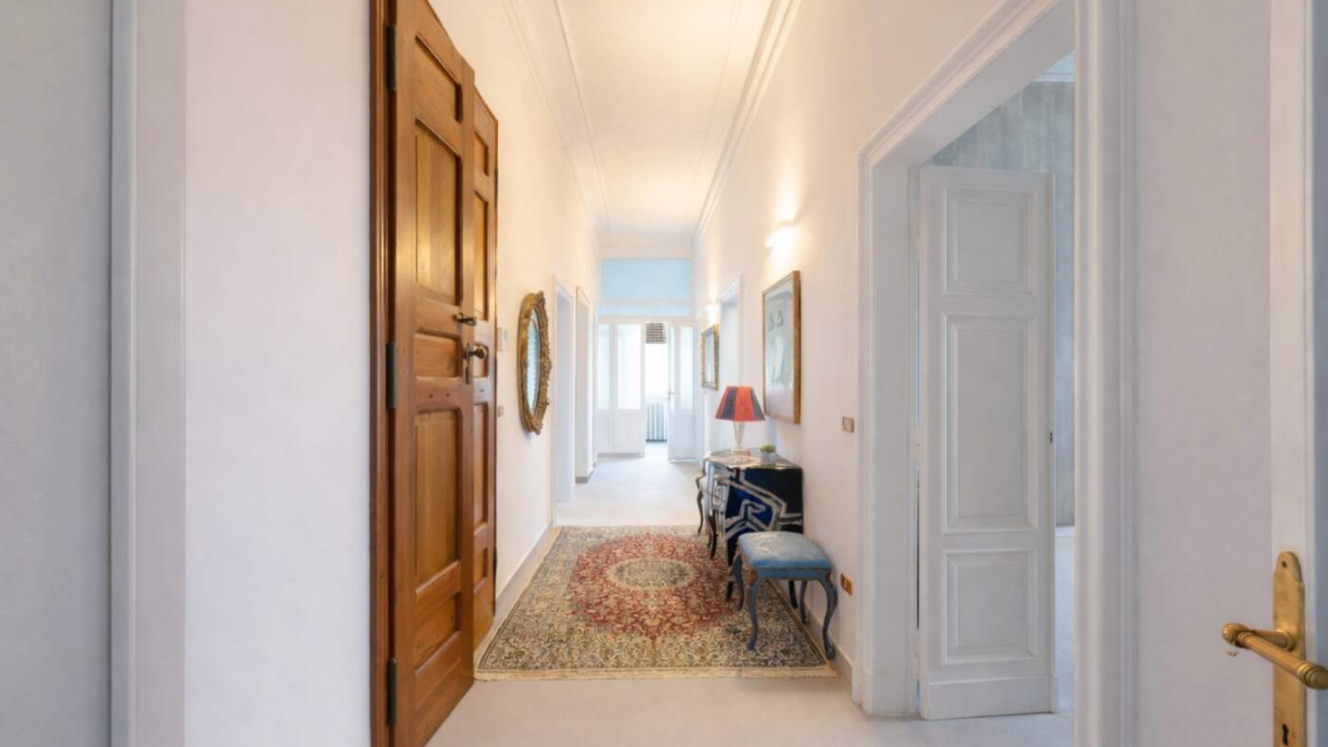 L’ingresso introduce in un ampio disimpegno di circa 18 mq, impreziosito da soffitti monumentali alti circa 4 metri, arricchiti da decori storici originali che conferiscono all’ambiente un’atmosfera nobile e senza tempo.