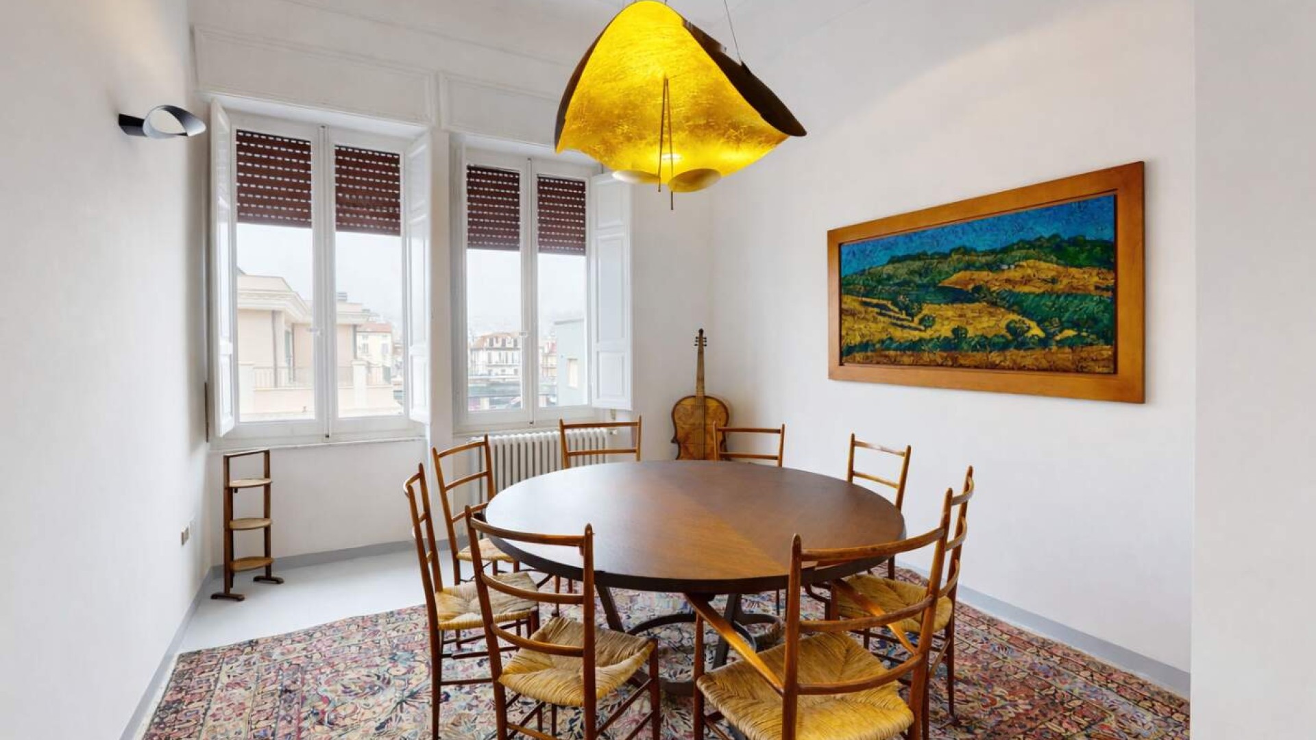 La zona giorno prosegue con una cucina di design abitabile e separata, con vista su Via Luigi Dari, e una sala da pranzo indipendente con camino, ideale per momenti conviviali e di rappresentanza.