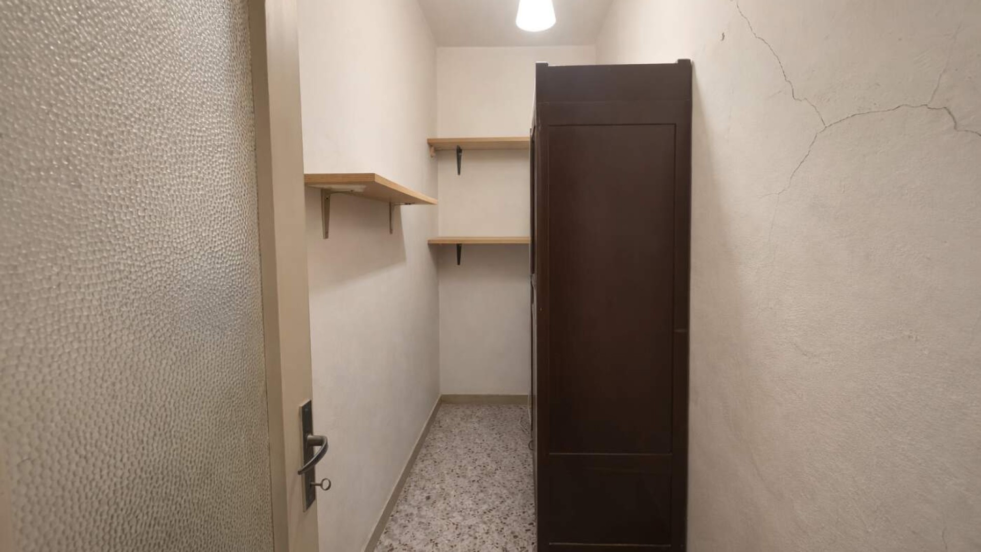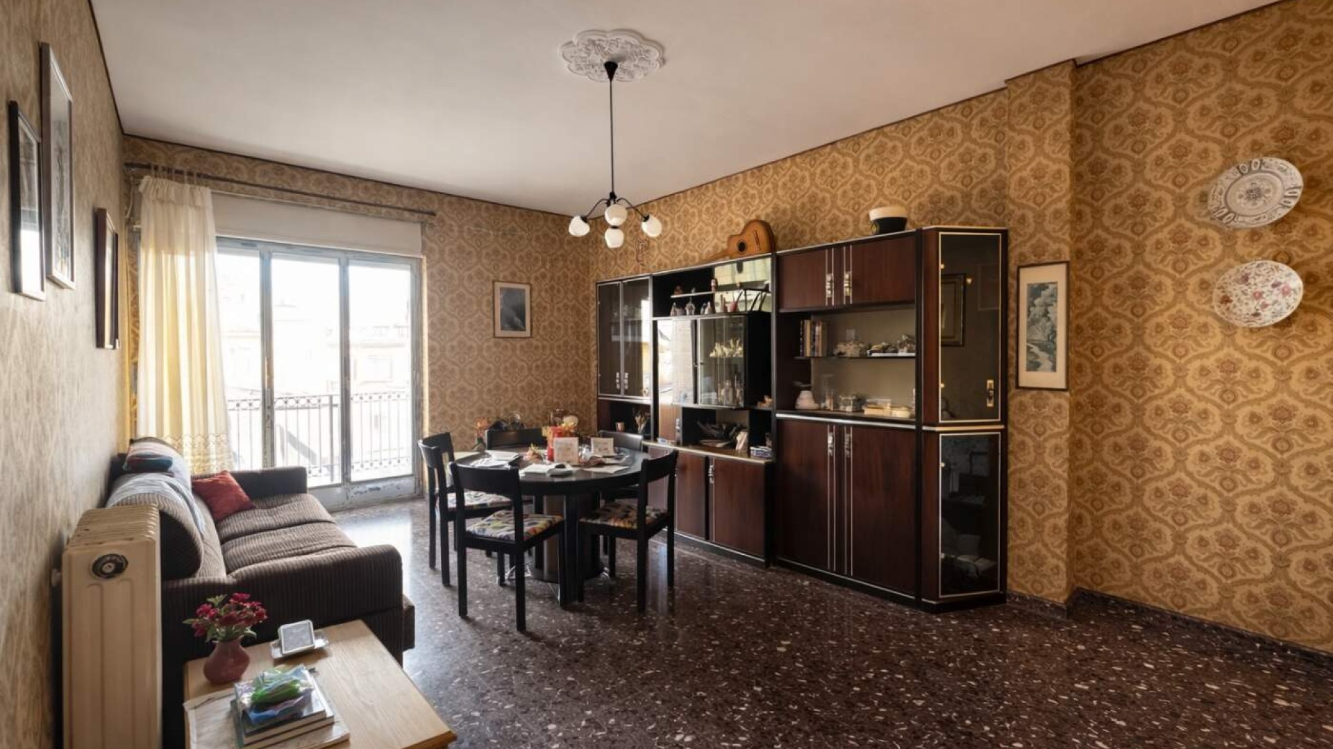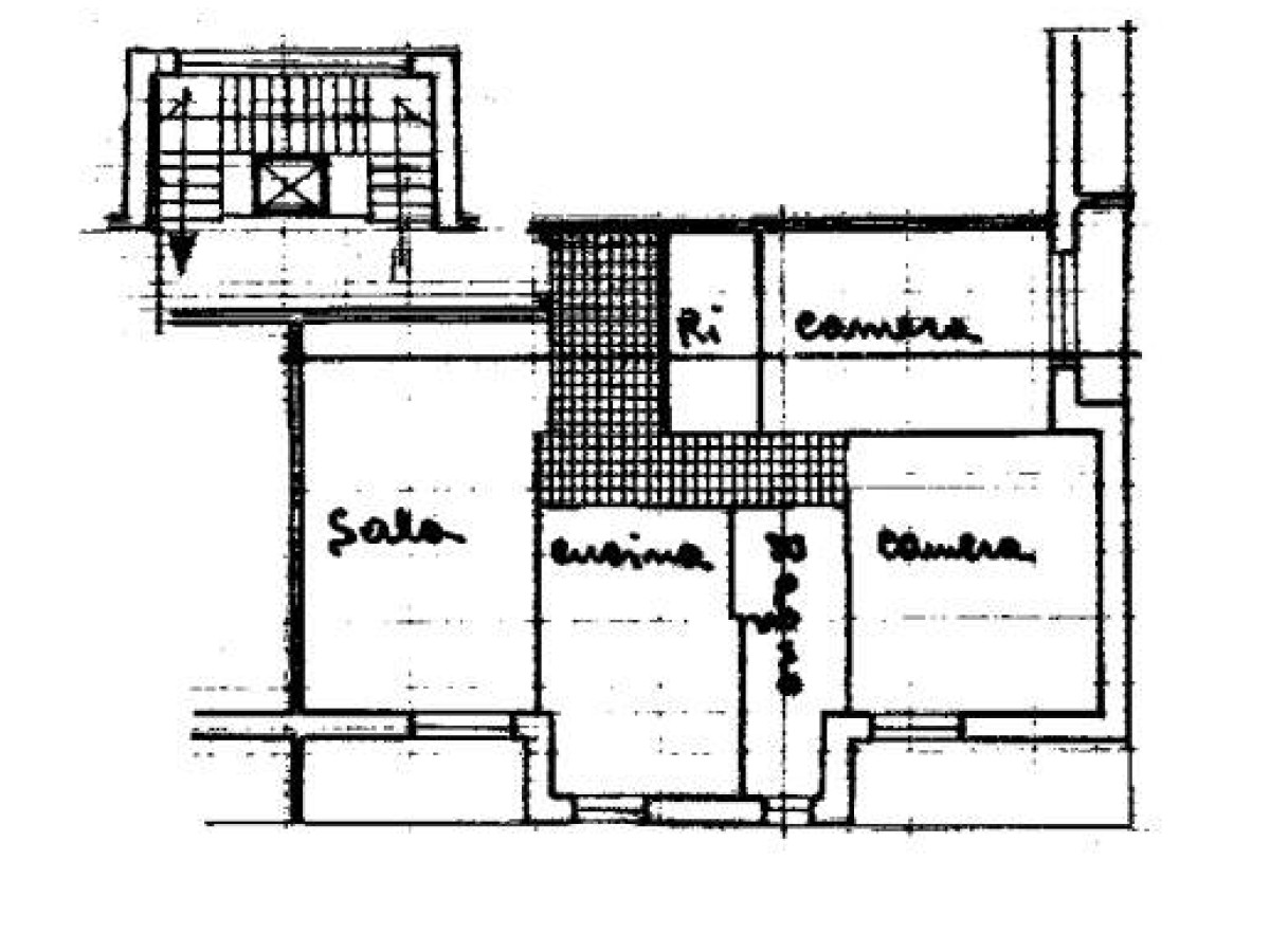 La soluzione si presenta abitabile, con finiture originali che includono pavimentazione in granito uniforme, infissi in legno con vetro singolo e riscaldamento autonomo.