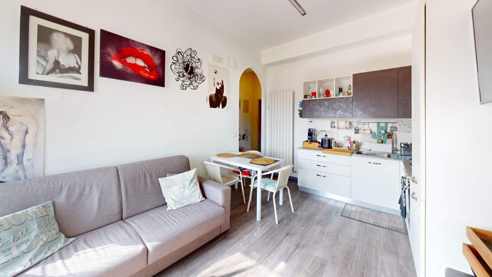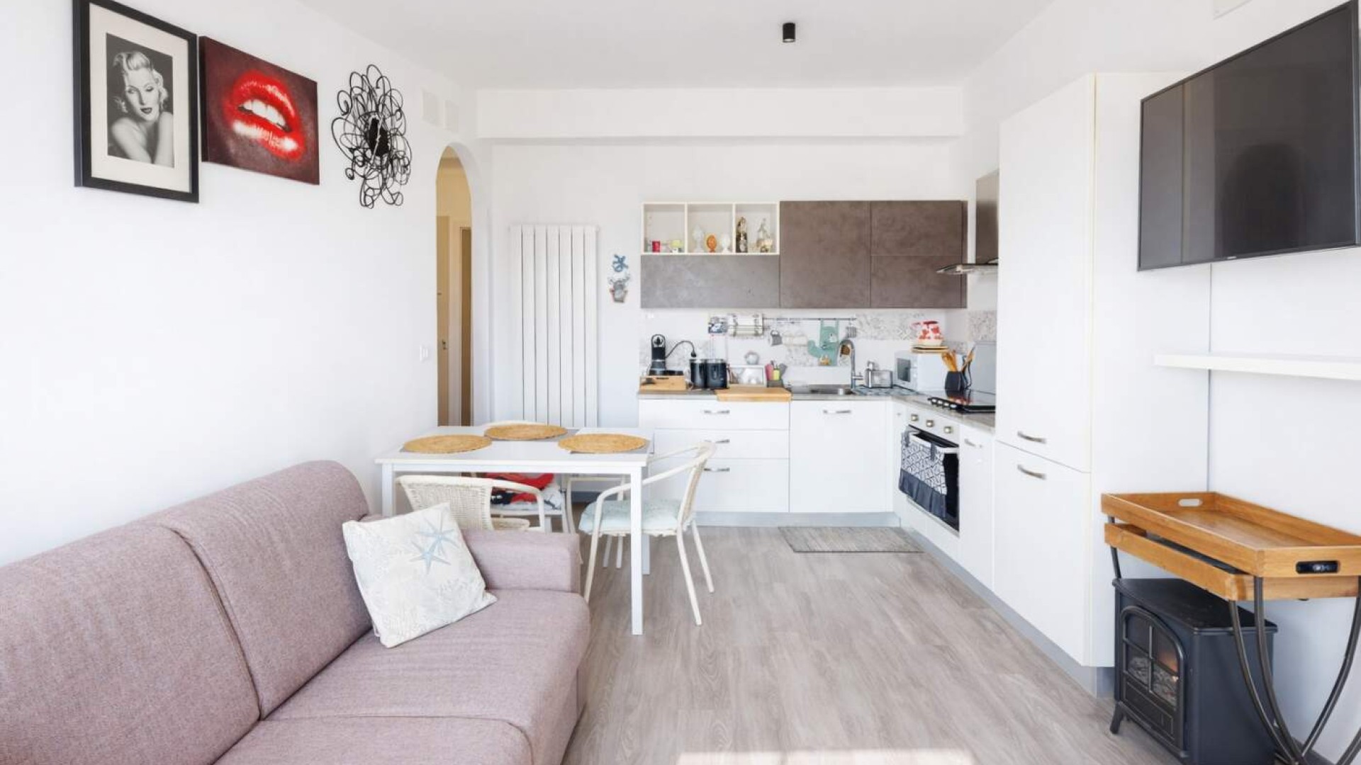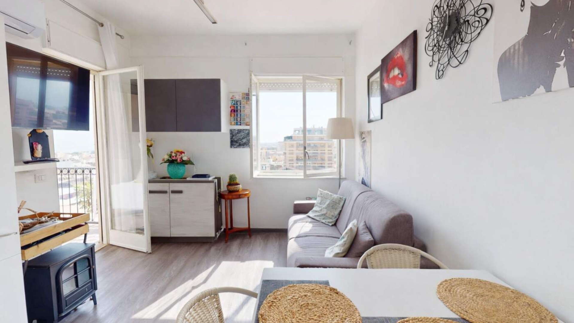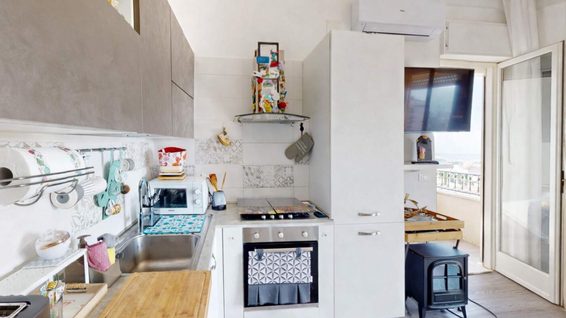 Il soggiorno con cucina a vista rappresenta il cuore dell’abitazione: Uno spazio conviviale, accogliente e perfetto per la vita quotidiana, con accesso diretto al terrazzino, dove è stata ricavata anche una pratica zona lavanderia.