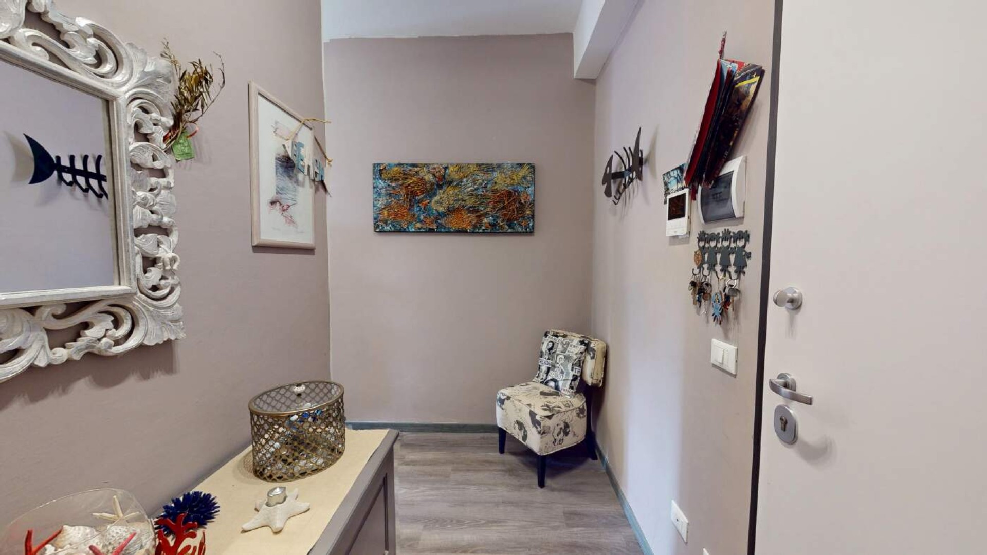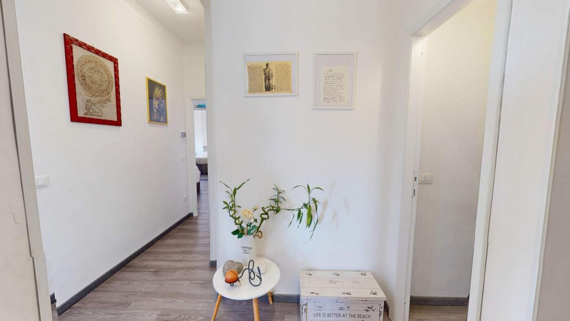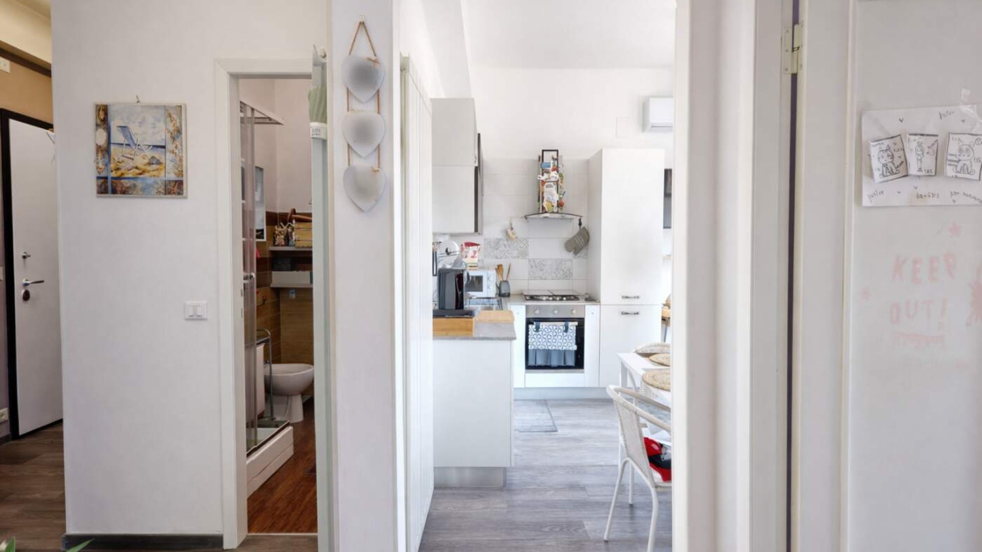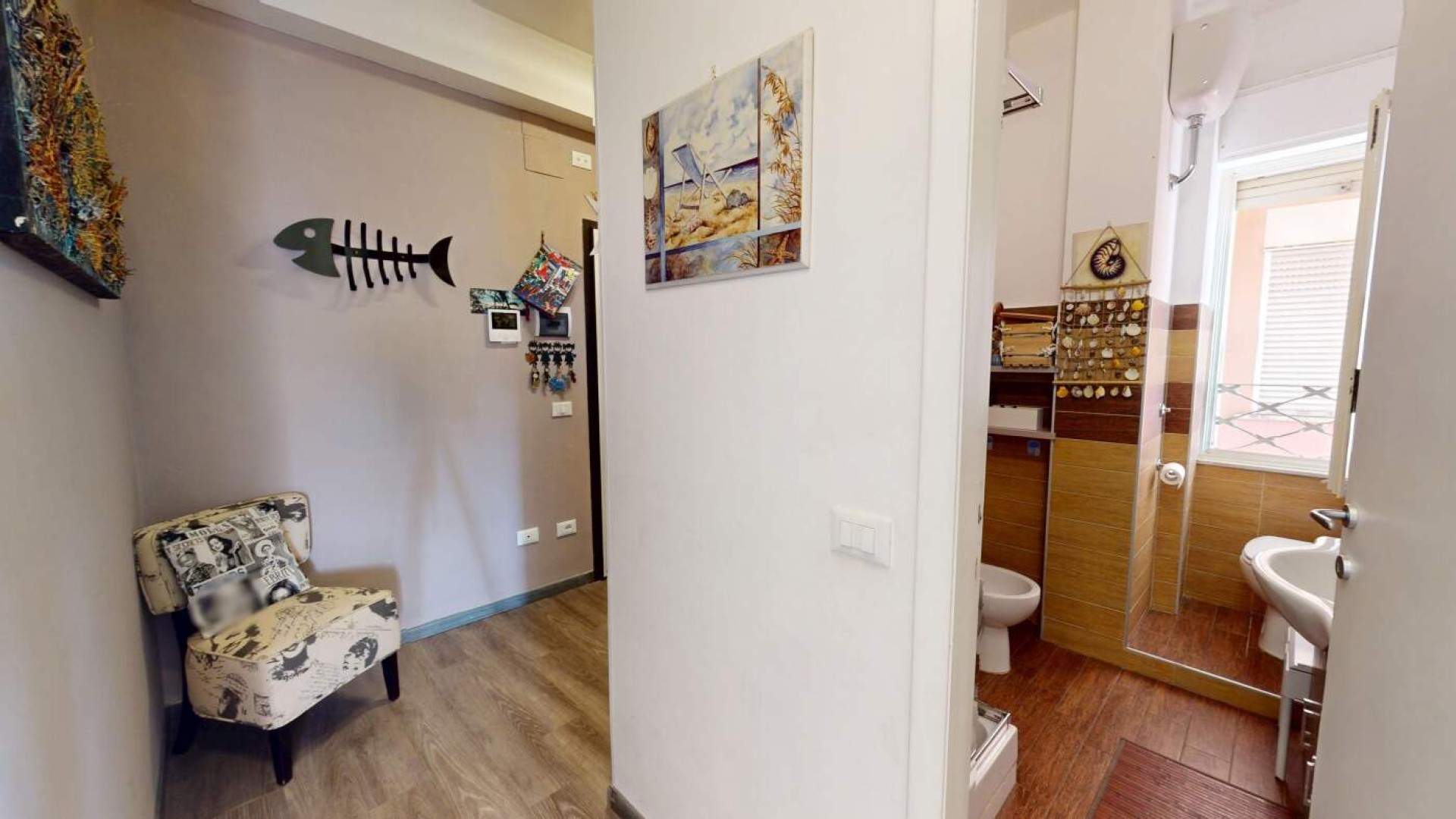L’appartamento, di circa 80 mq, accoglie con un ingresso su disimpegno che accompagna armoniosamente verso gli ambienti principali della casa, caratterizzati da una distribuzione funzionale e da una naturale luminosità che valorizza ogni spazio.