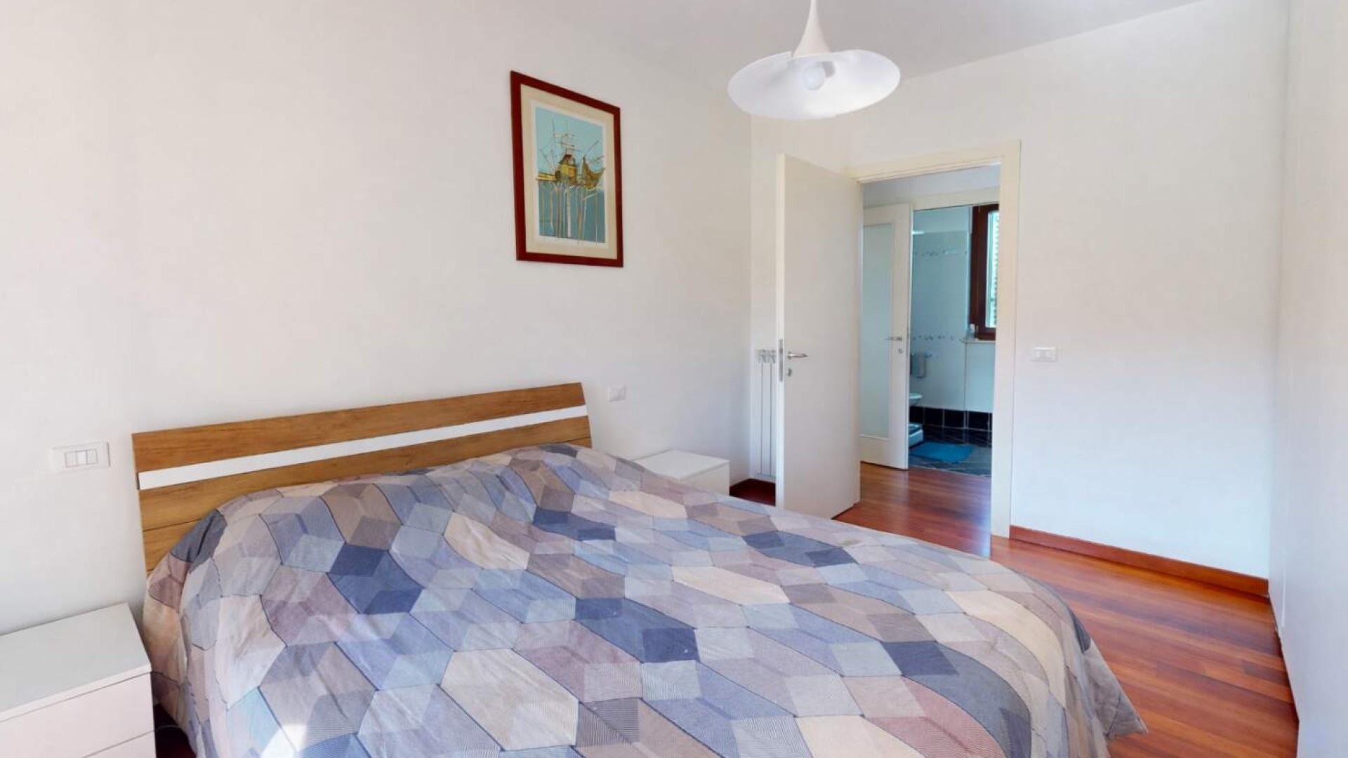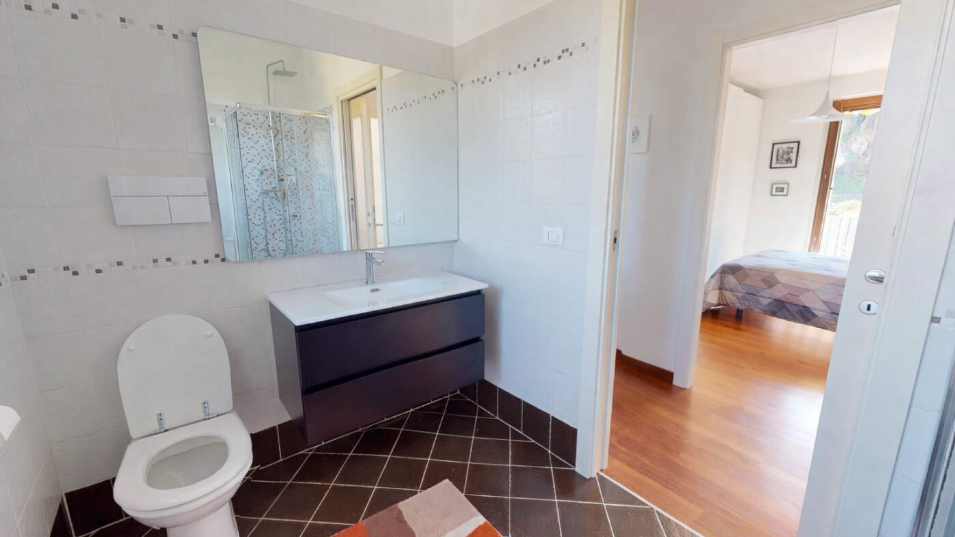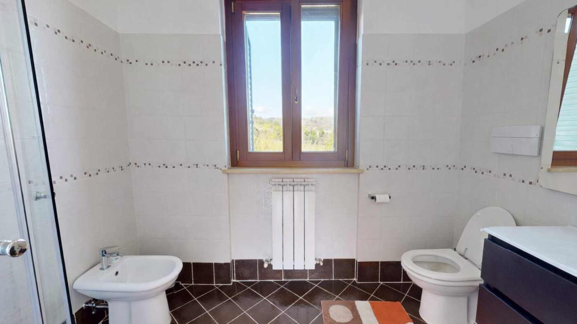 Il bagno, finestrato e rifinito con cura, è completo di box doccia e si presenta in ottime condizioni.