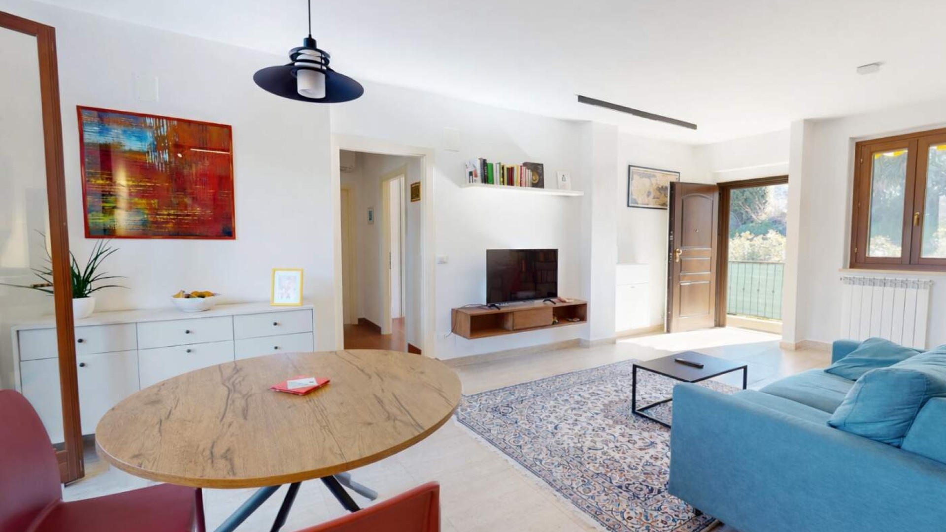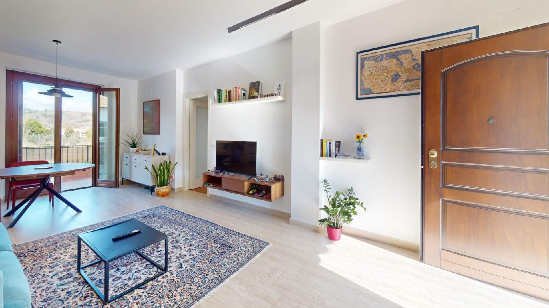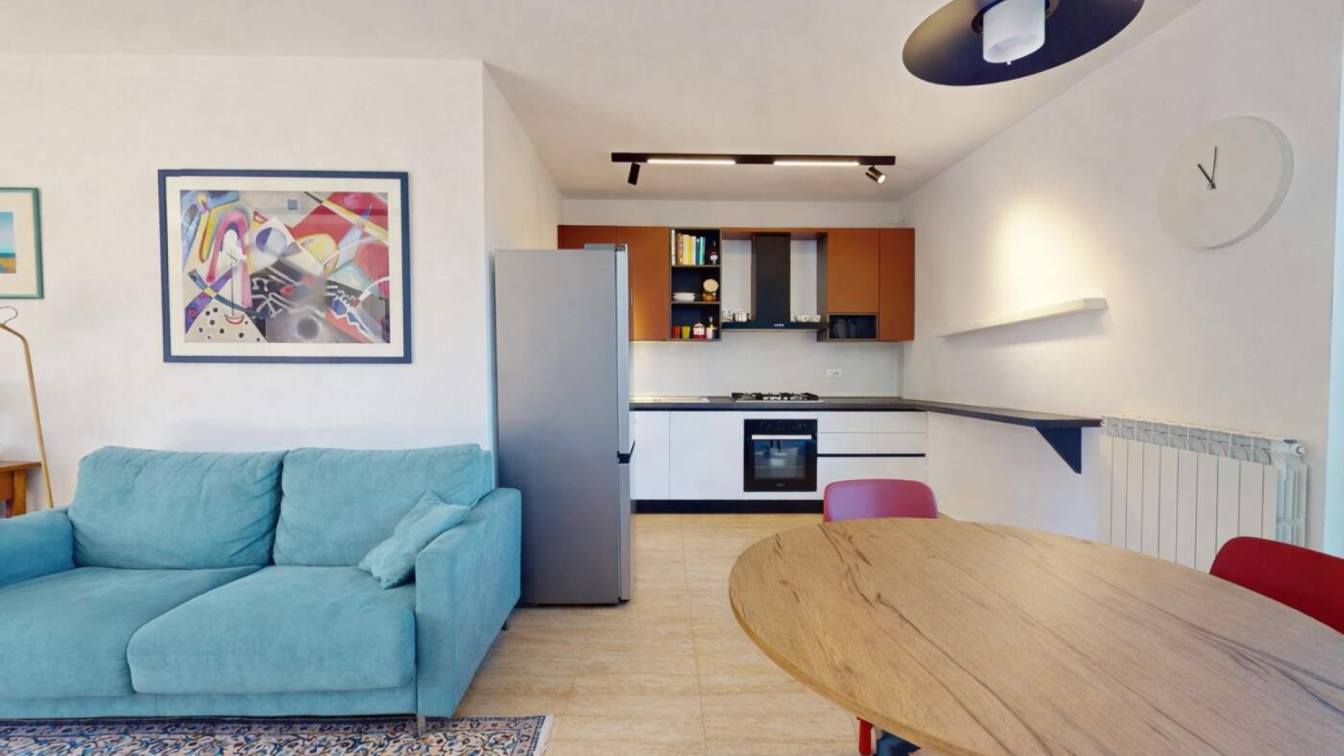 Varcata la porta blindata si apre un ampio e luminoso soggiorno con cucina a vista, uno spazio arioso e funzionale, ideale per vivere la quotidianità e accogliere ospiti.