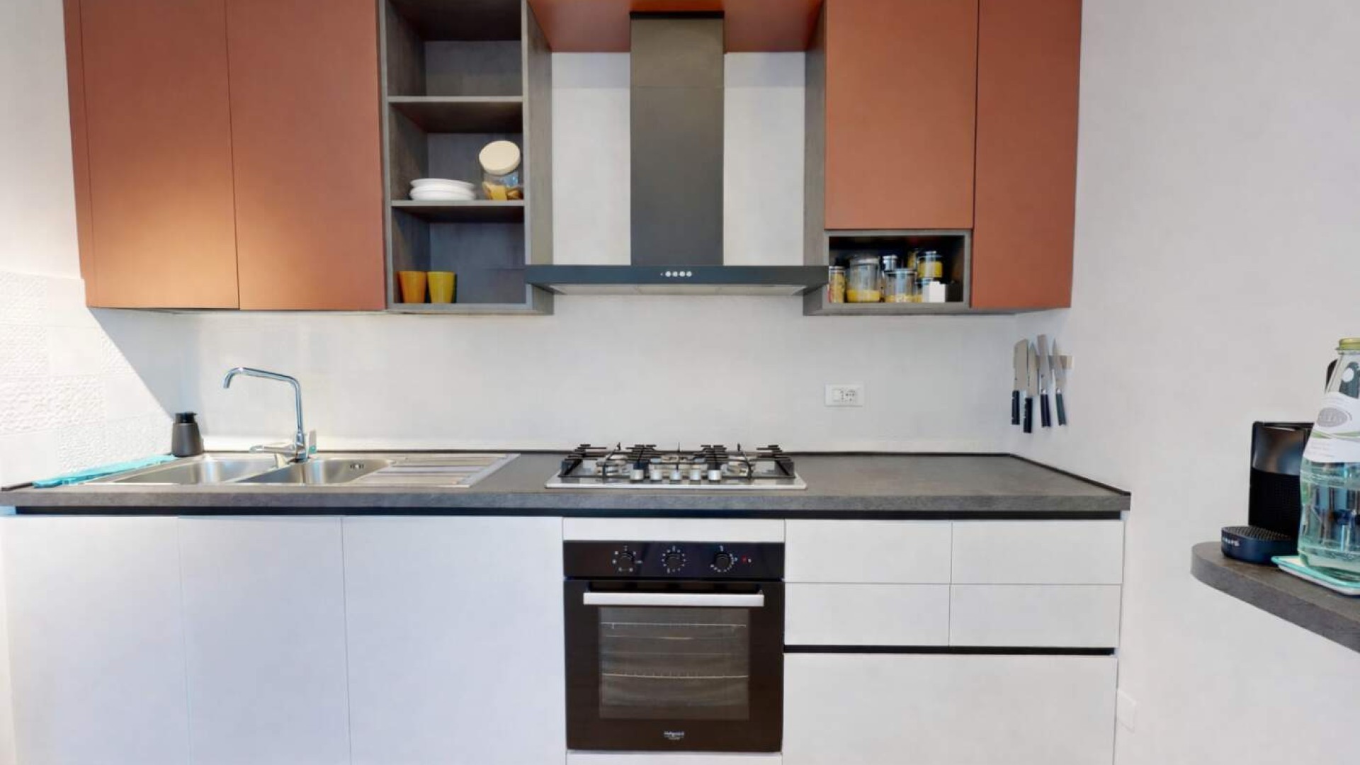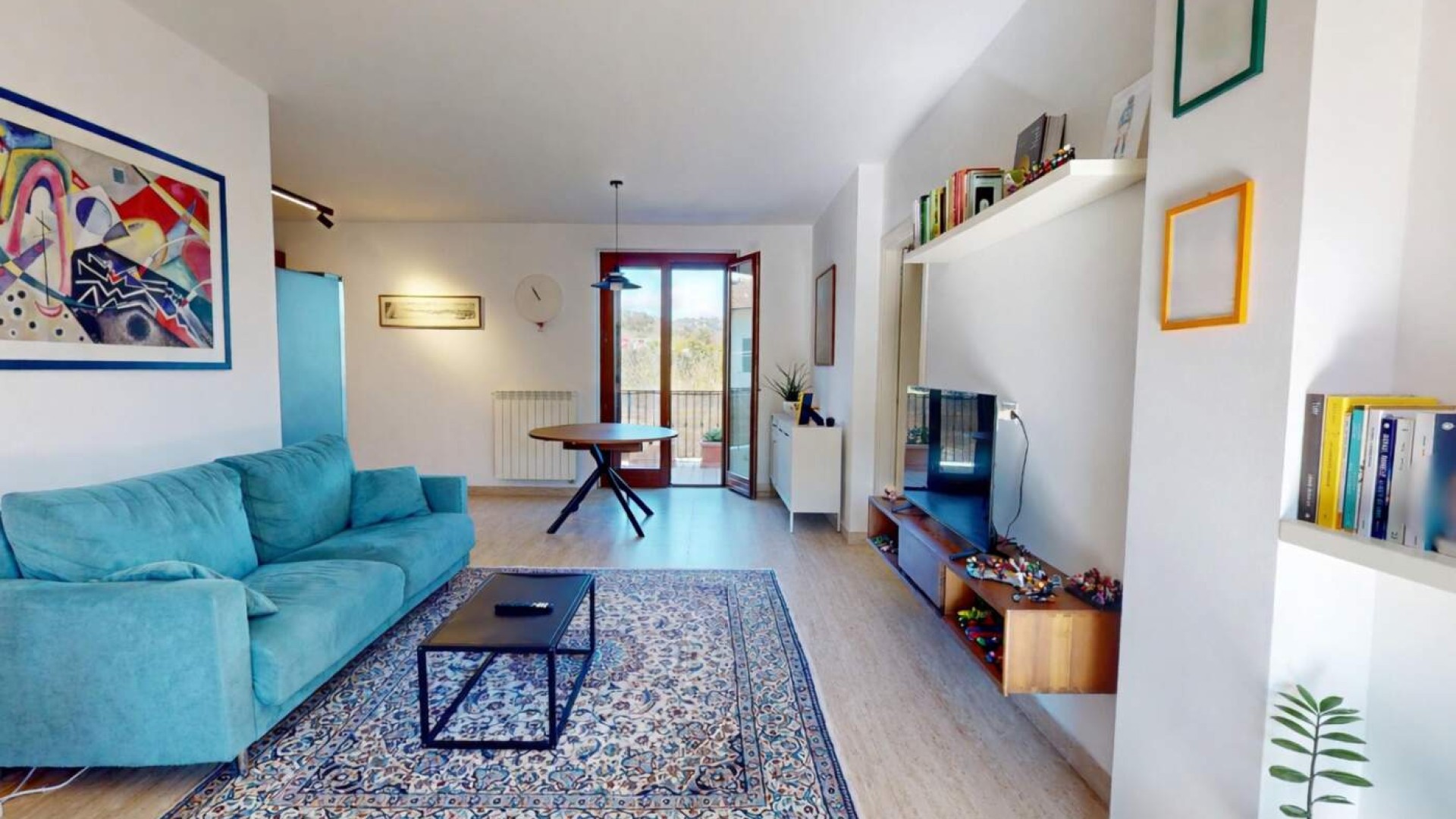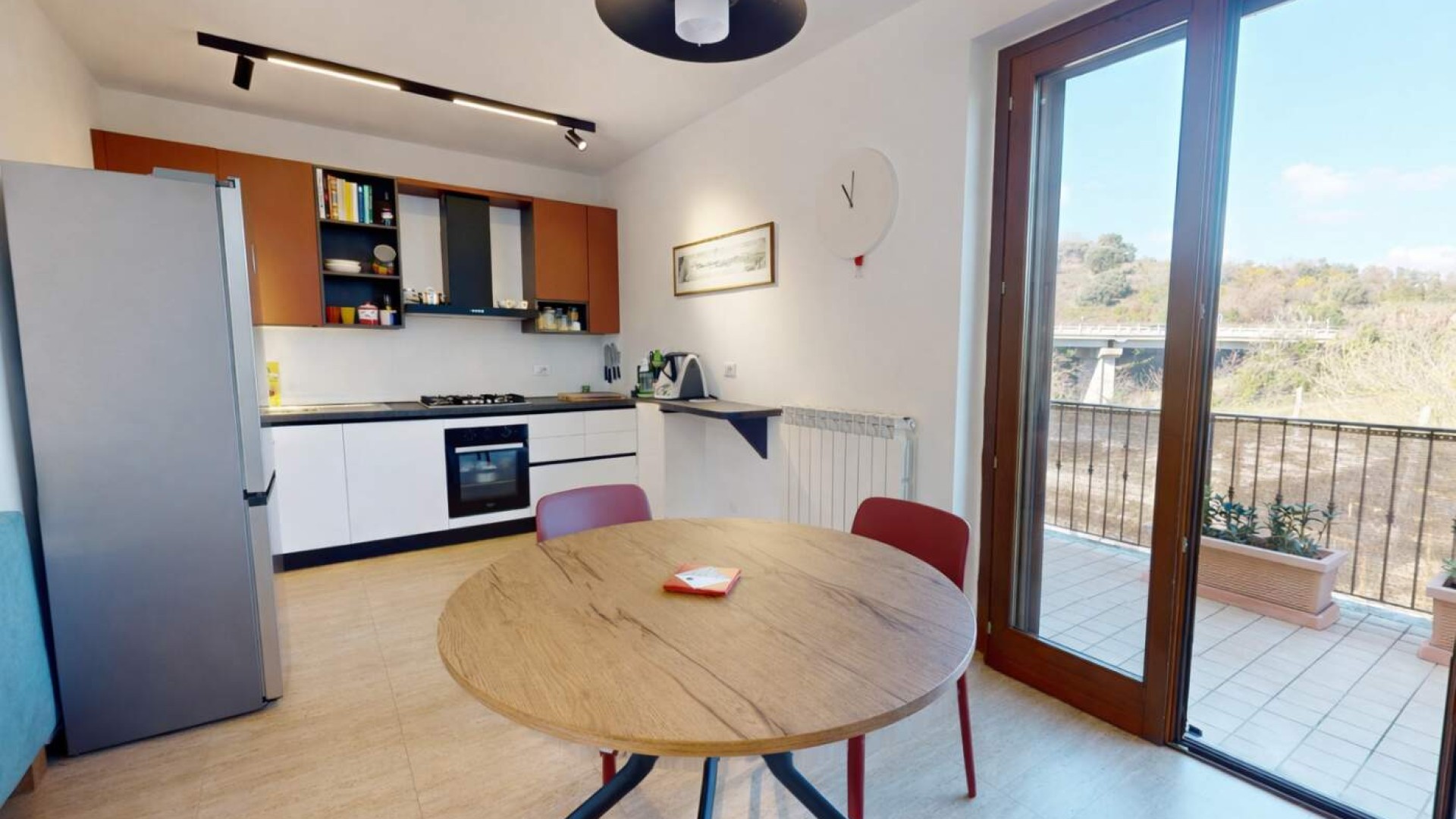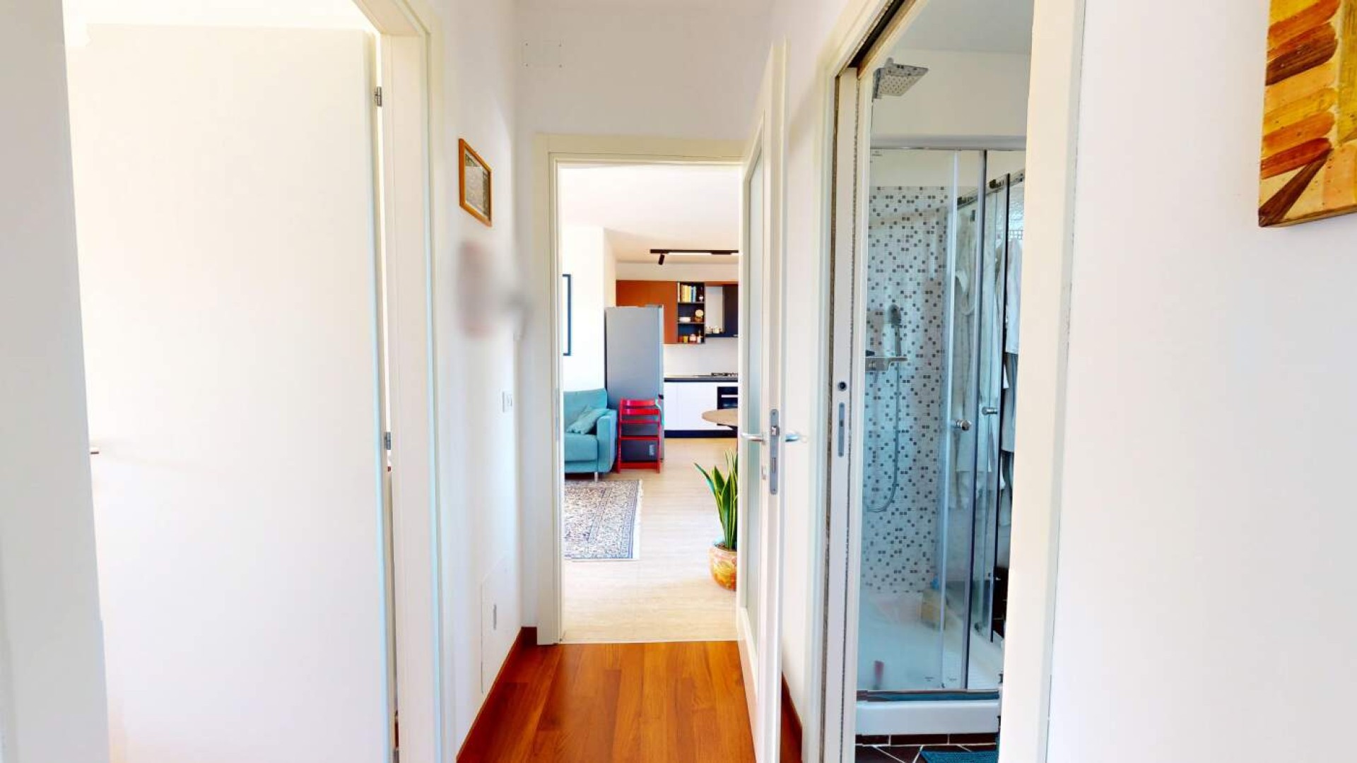 Varcata la porta blindata si apre un ampio e luminoso soggiorno con cucina a vista, uno spazio arioso e funzionale, ideale per vivere la quotidianità e accogliere ospiti.
