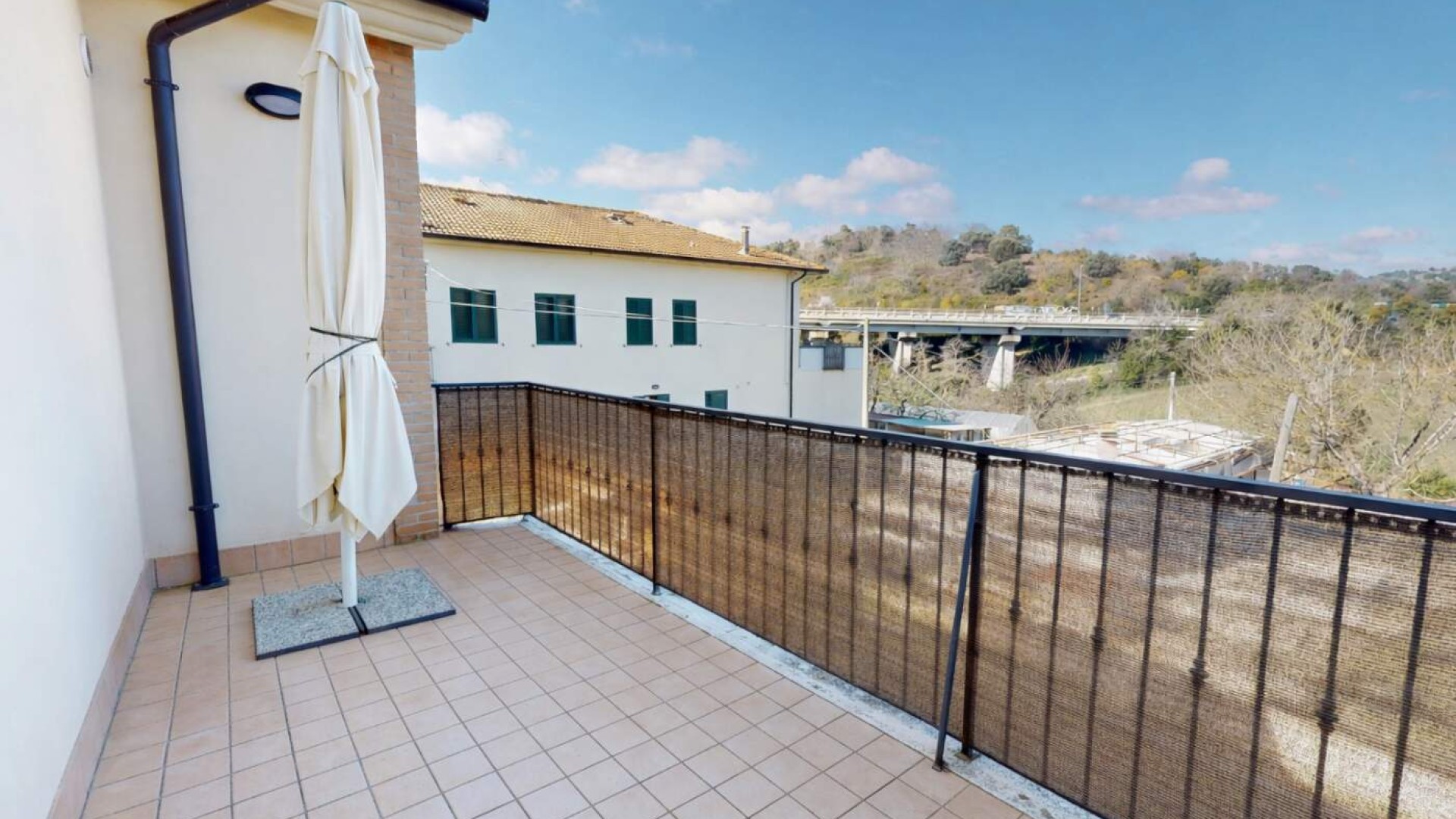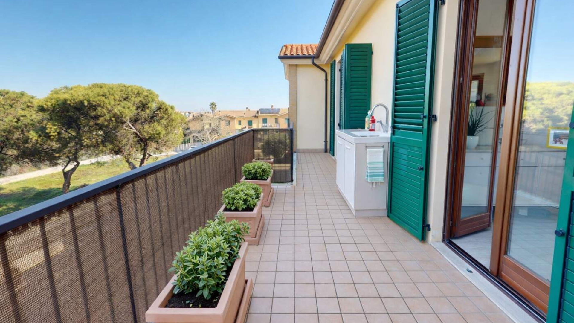 Da qui si accede a un comodo terrazzo abitabile esposto a Nord, perfetto per pranzi all’aperto e momenti di relax, dotato anche di lavandino esterno che ne aumenta la praticità.