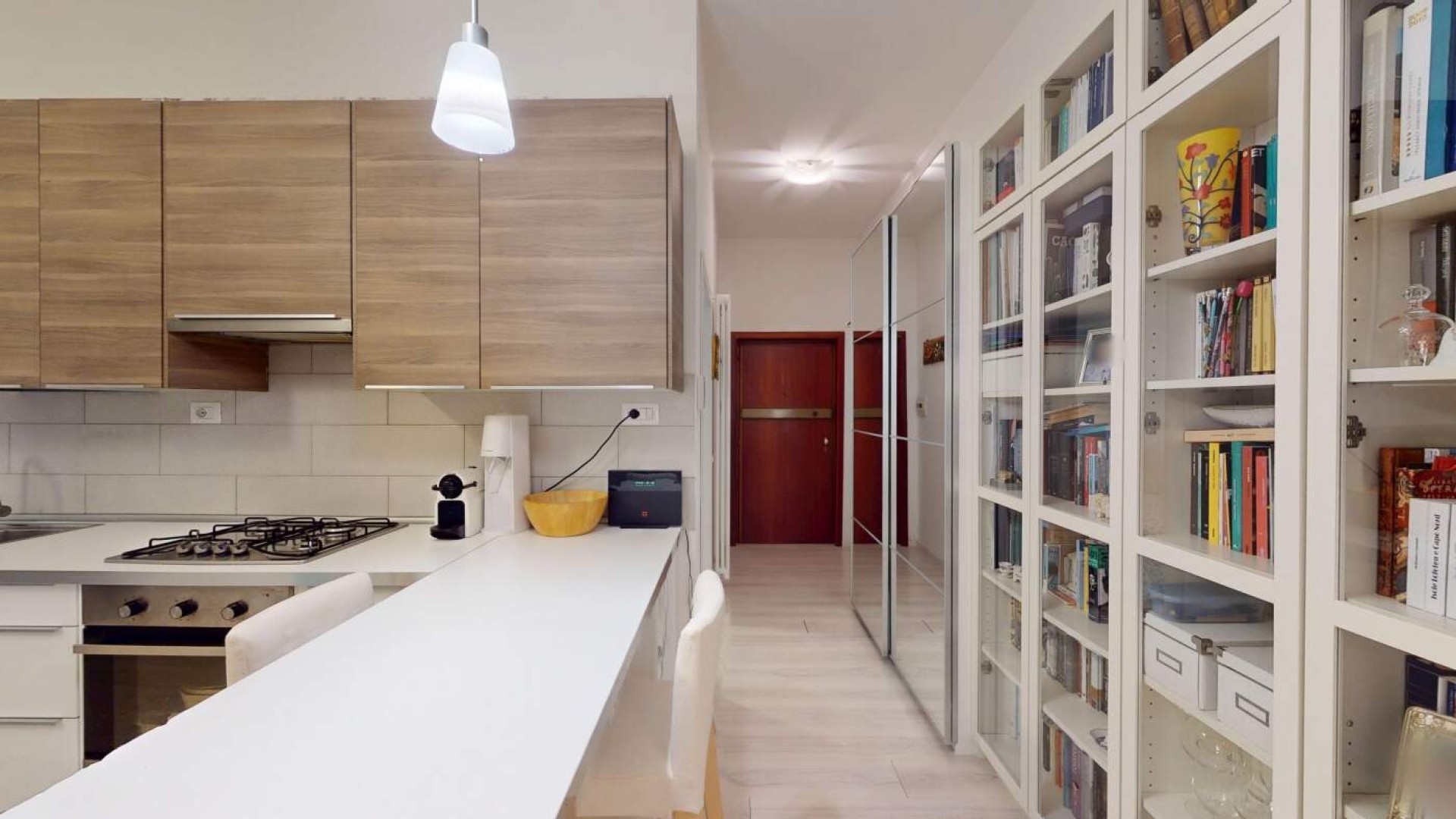 Un pratico ripostiglio, attualmente organizzato come zona lavanderia, completa la parte giorno con funzionalità e discrezione.