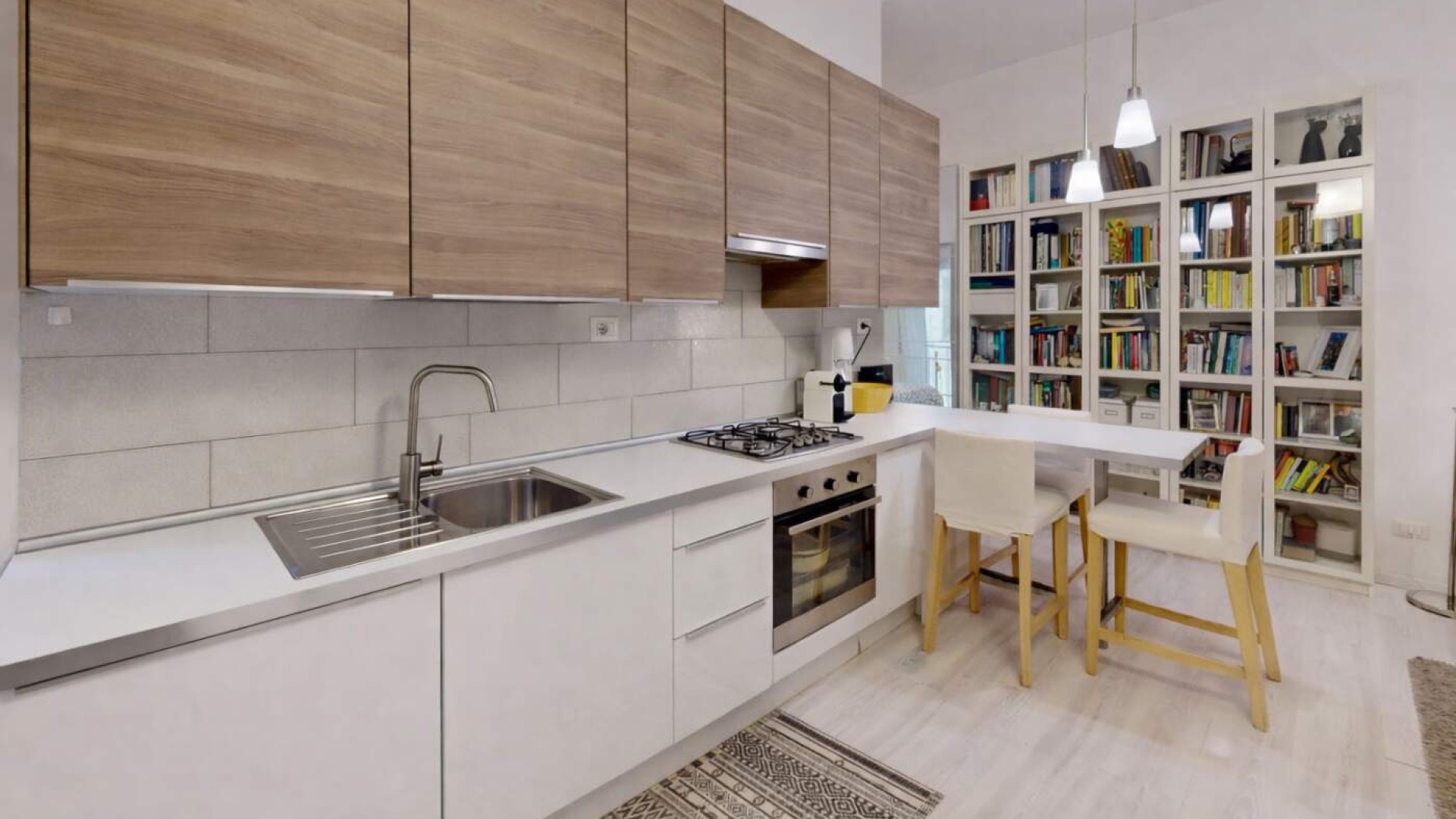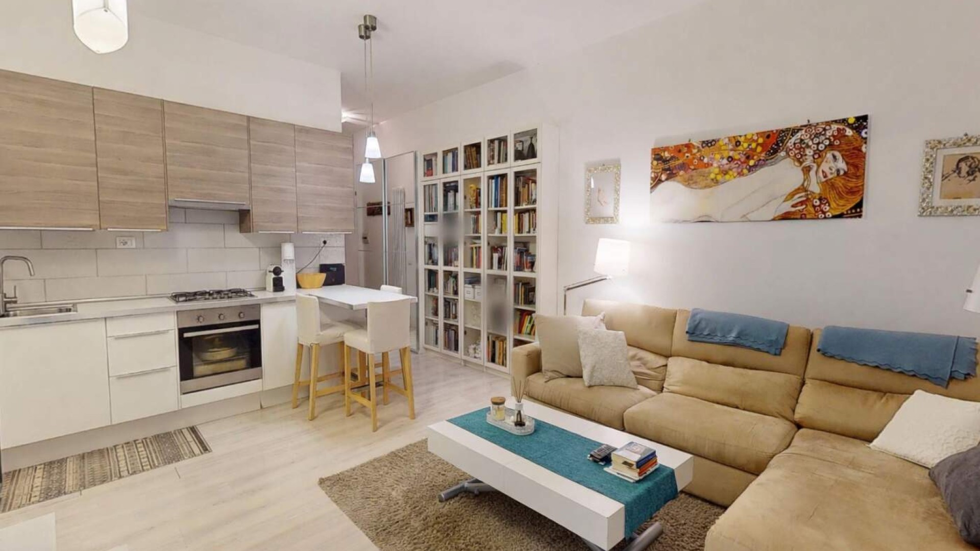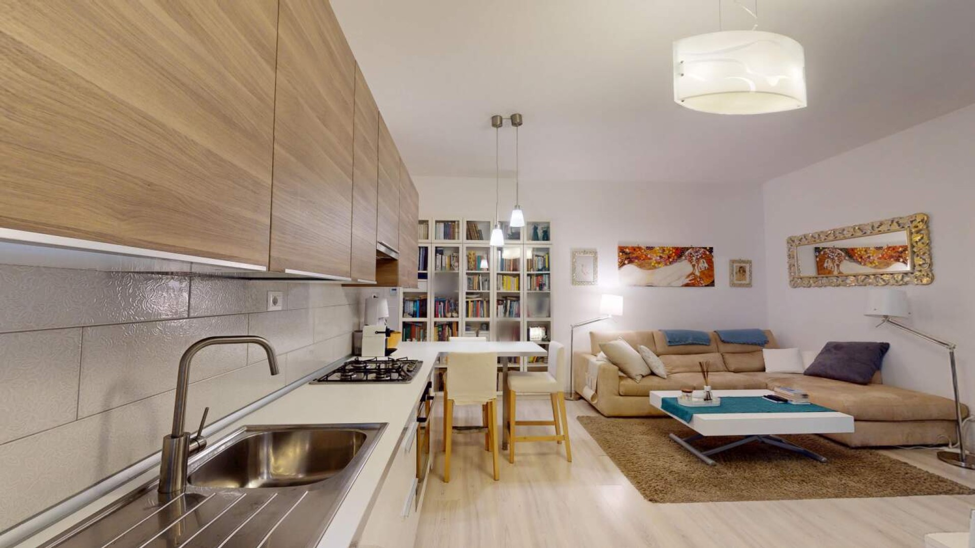 Il soggiorno, ampio e luminoso, si fonde con la cucina a vista creando un ambiente moderno e accogliente, perfetto per la vita quotidiana e per momenti di convivialità, anch’esso con affaccio sul balcone che dona ulteriore respiro e luce naturale agli ambienti.