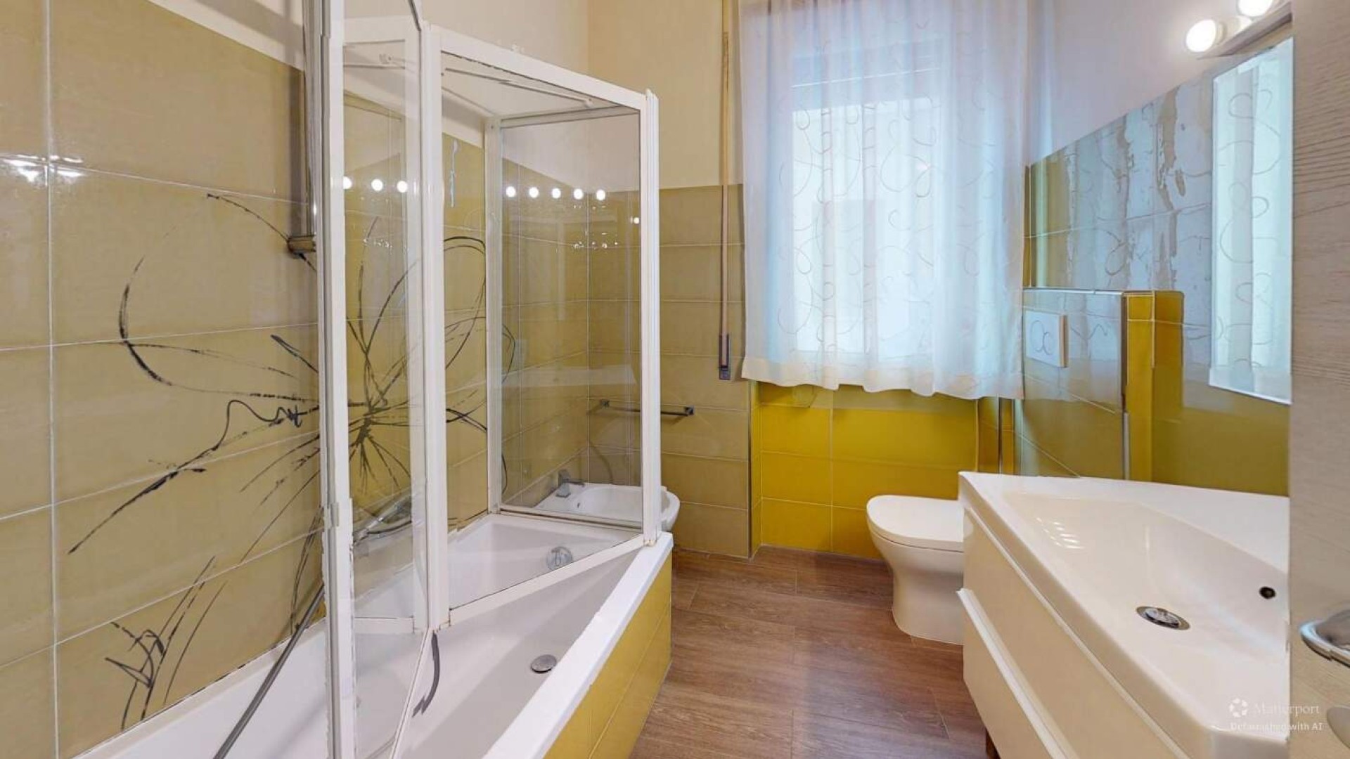 Il bagno finestrato con vasca è rifinito con gusto contemporaneo e materiali di qualità, in linea con il resto dell’abitazione.