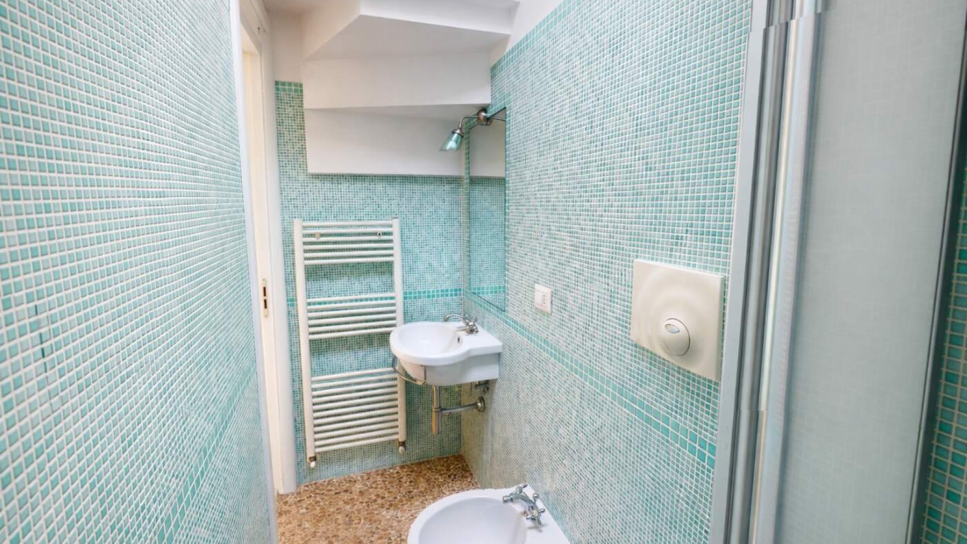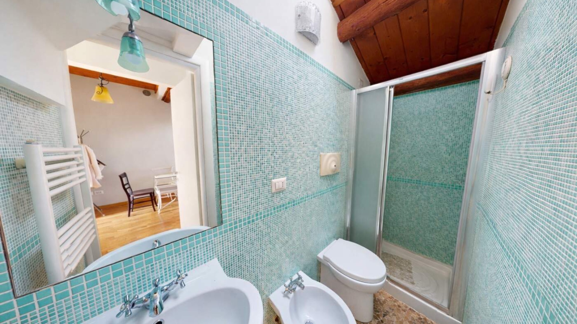 Un bagno finestrato con box doccia e finiture moderne completa il primo livello.