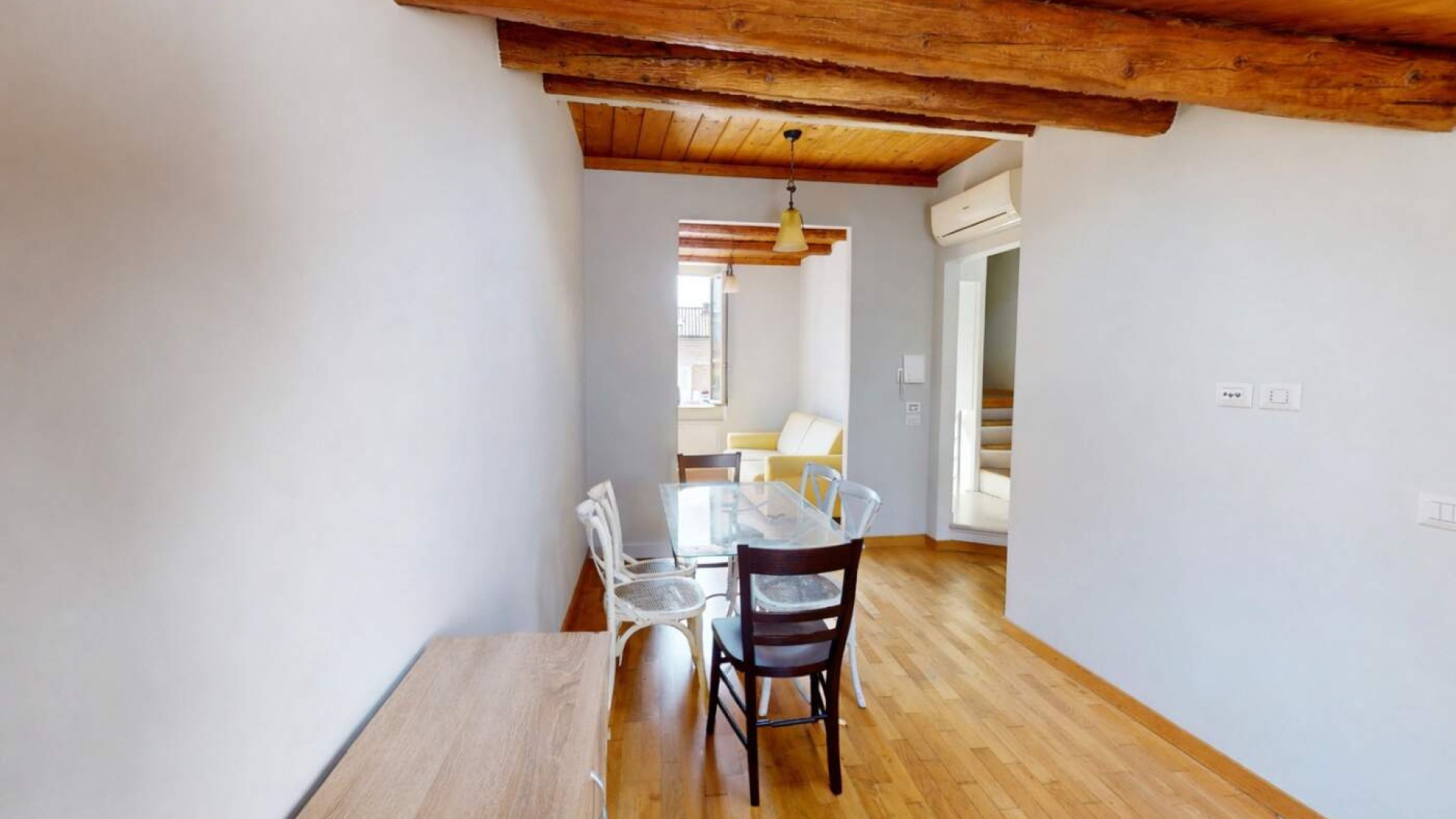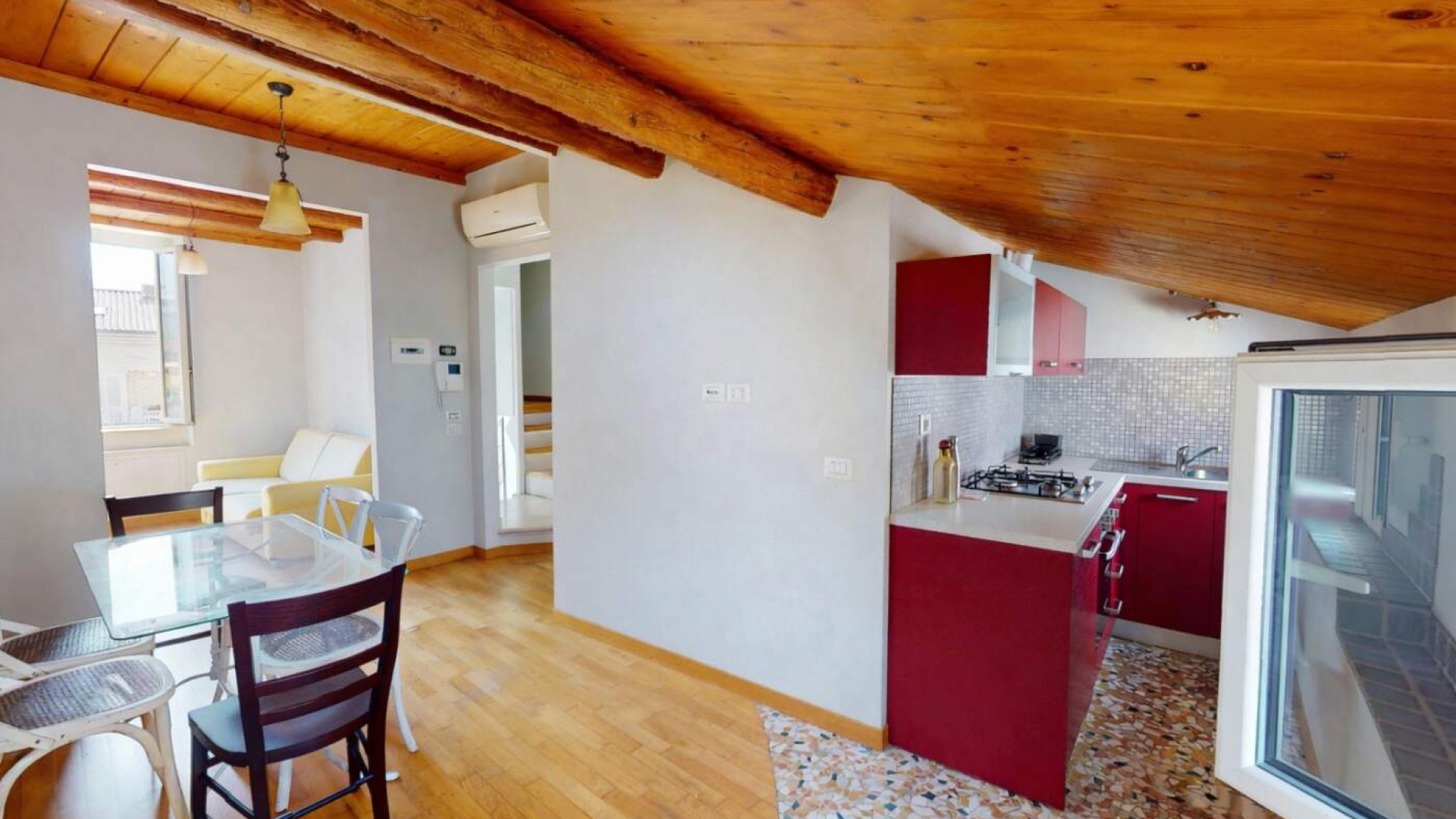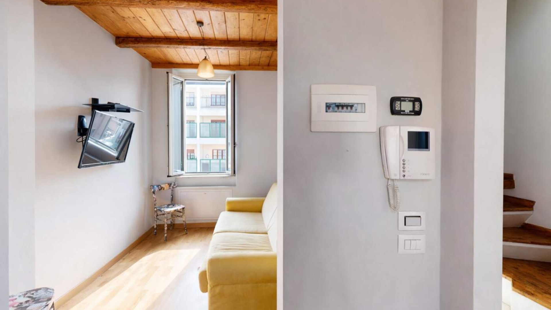 L’appartamento, di circa 55 mq, si sviluppa su più livelli con una distribuzione originale e funzionale degli spazi.