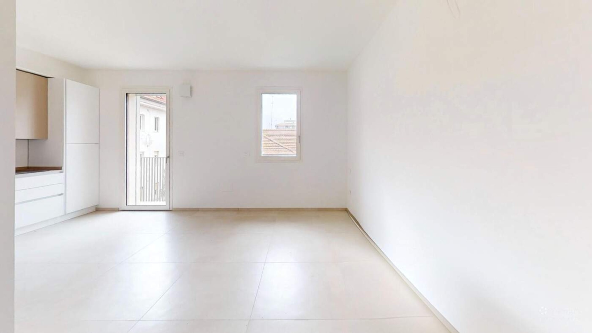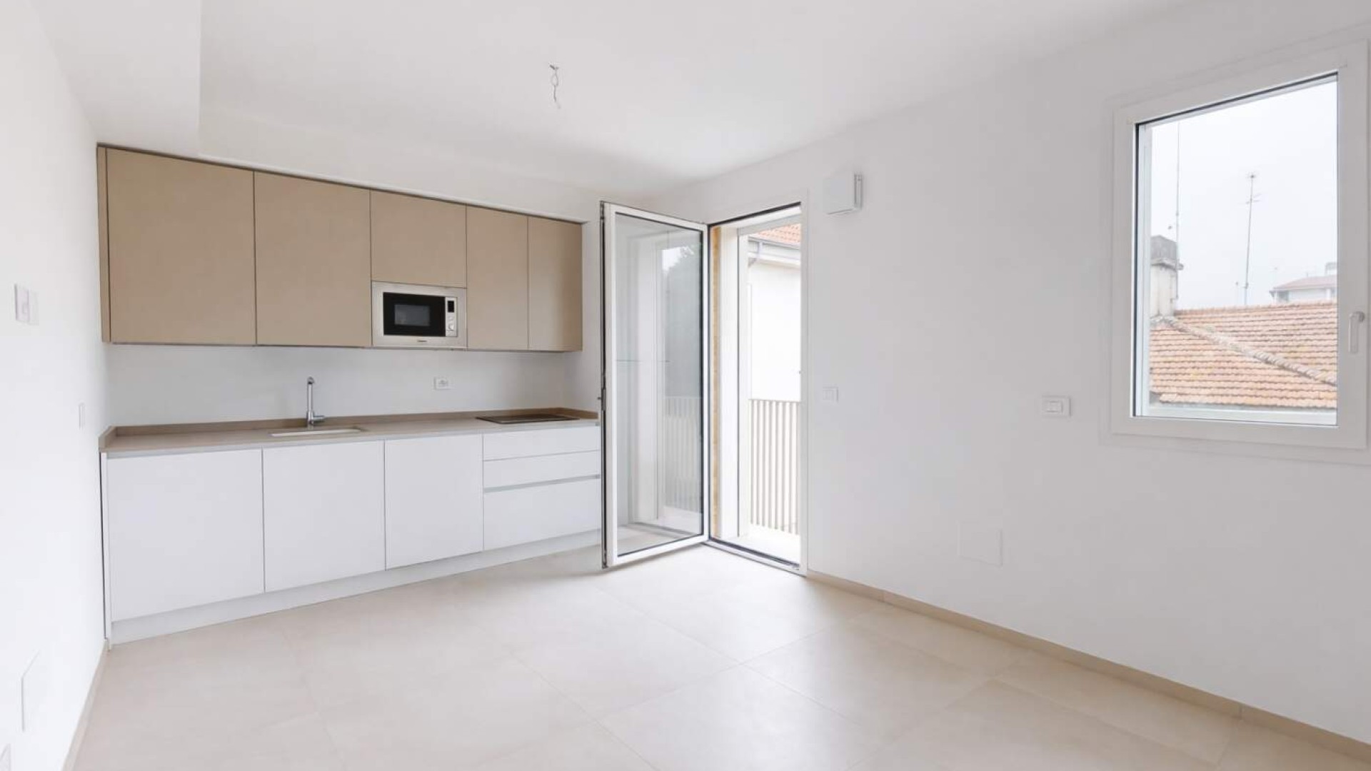 L’ingresso introduce in un ambiente unico accogliente e ben organizzato, con soggiorno e cucina a vista affacciati su un balcone alla francese che dona luce naturale all’intero spazio.