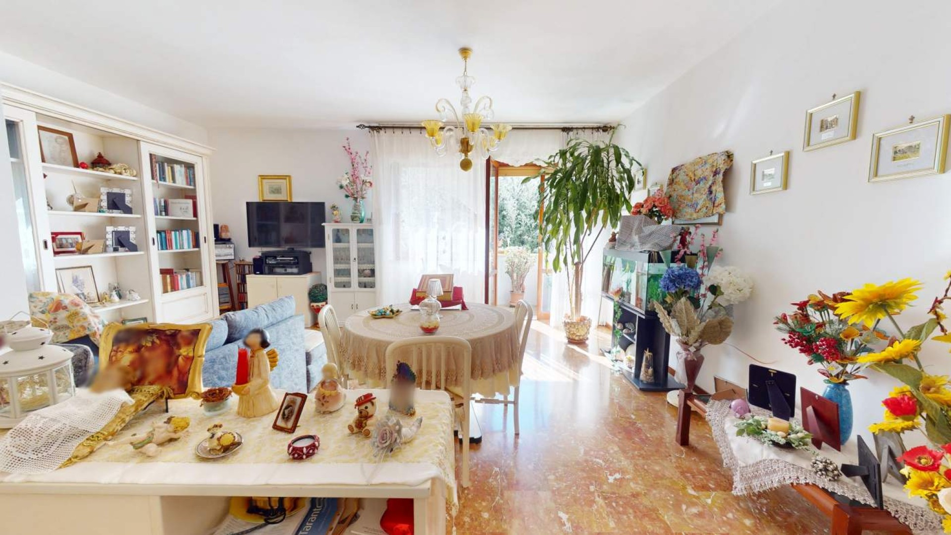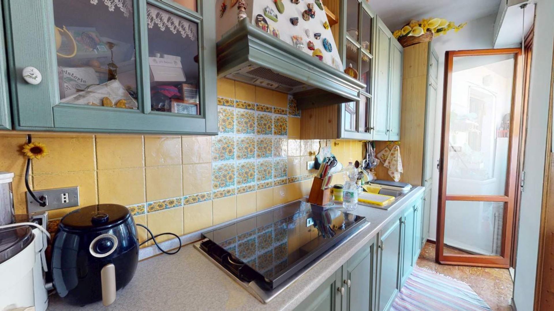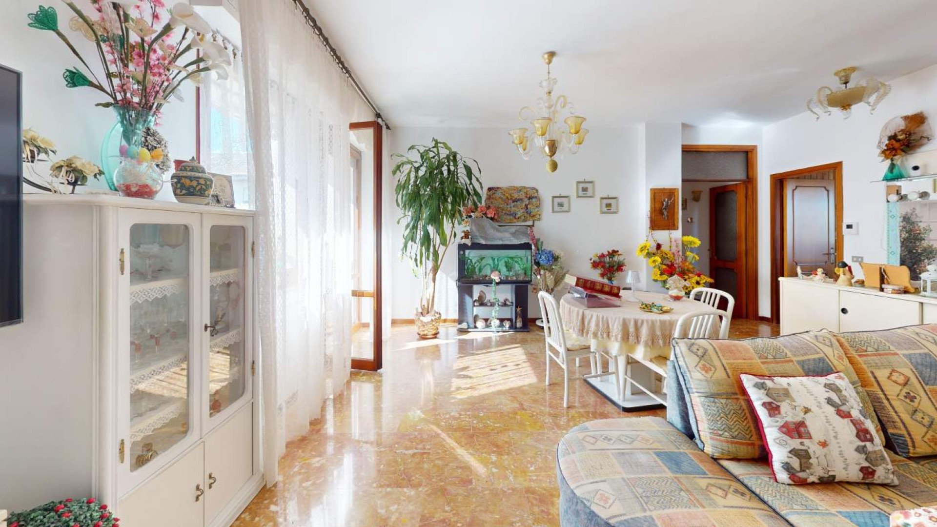 La zona giorno continua con una sala da pranzo separata, arricchita da una cucina a vista funzionale e ben organizzata, che si affaccia su un balcone verandato completo di zona lavanderia.