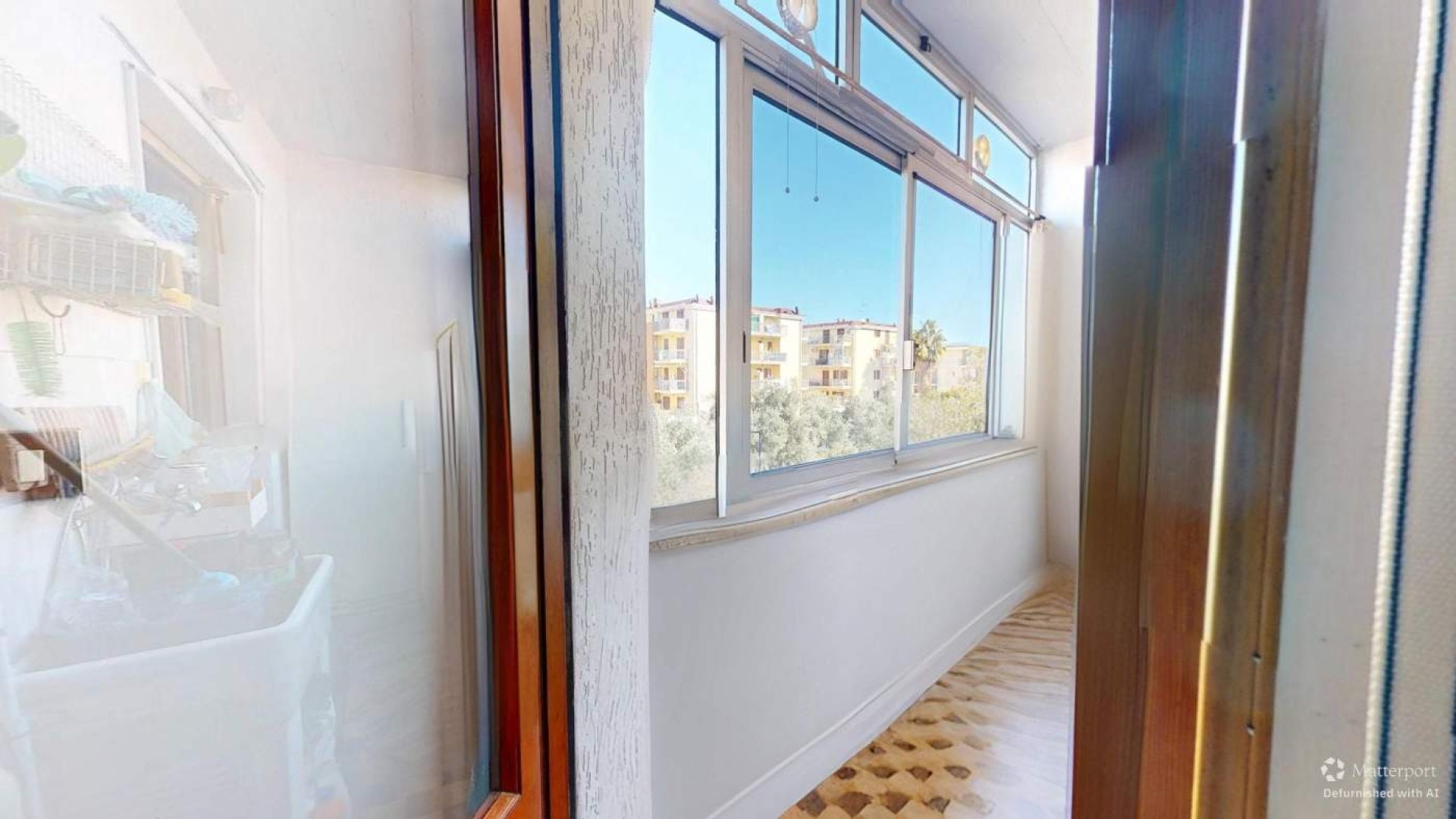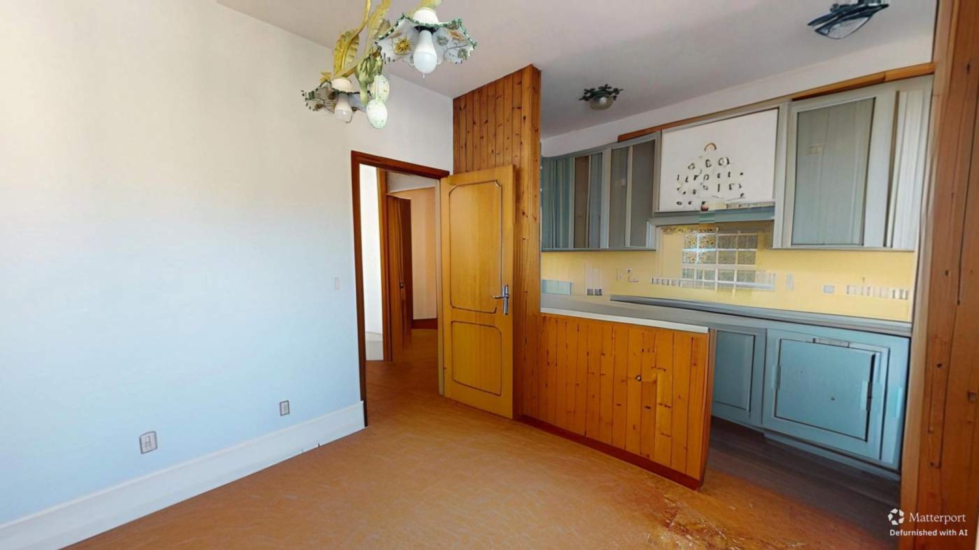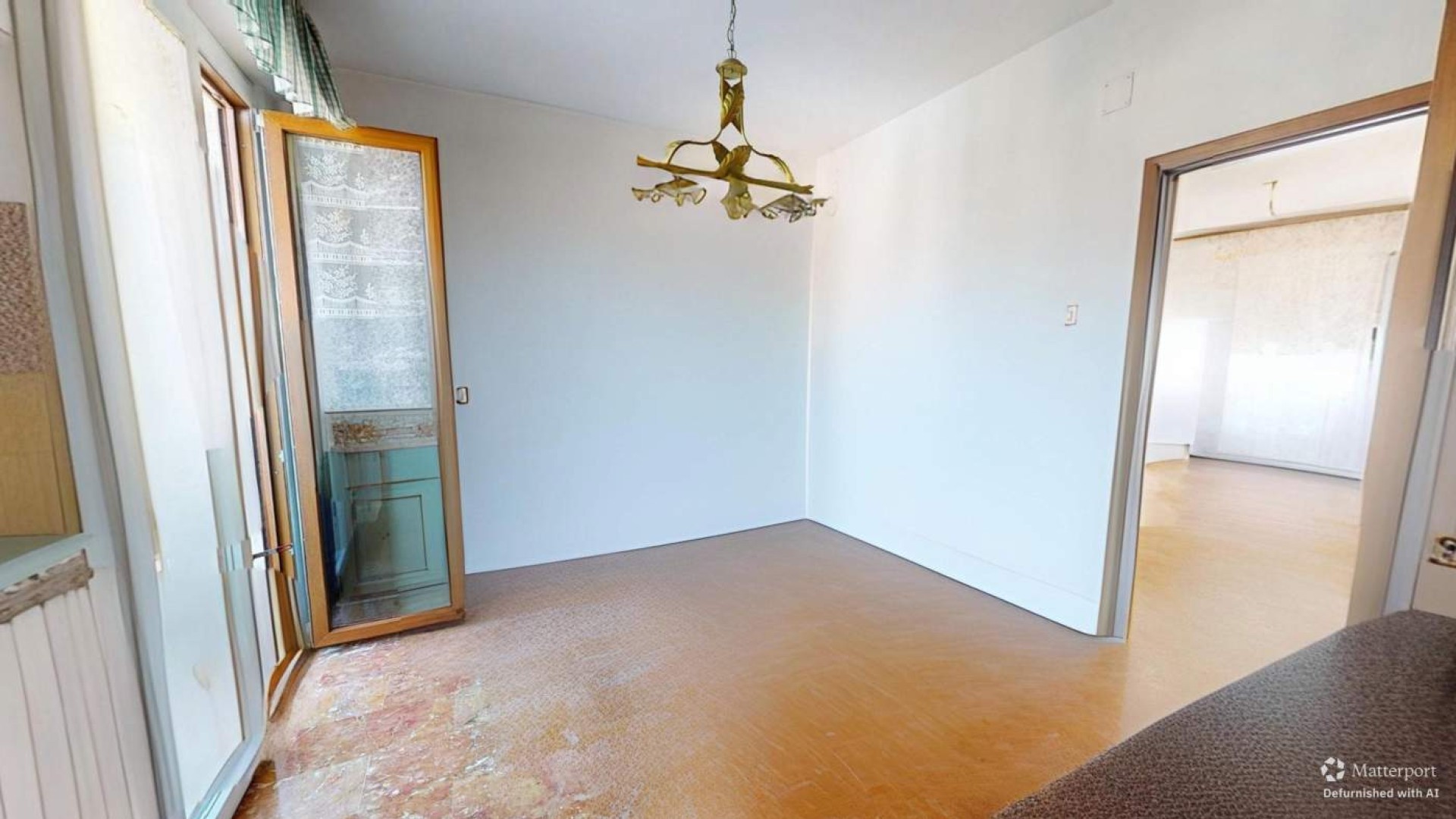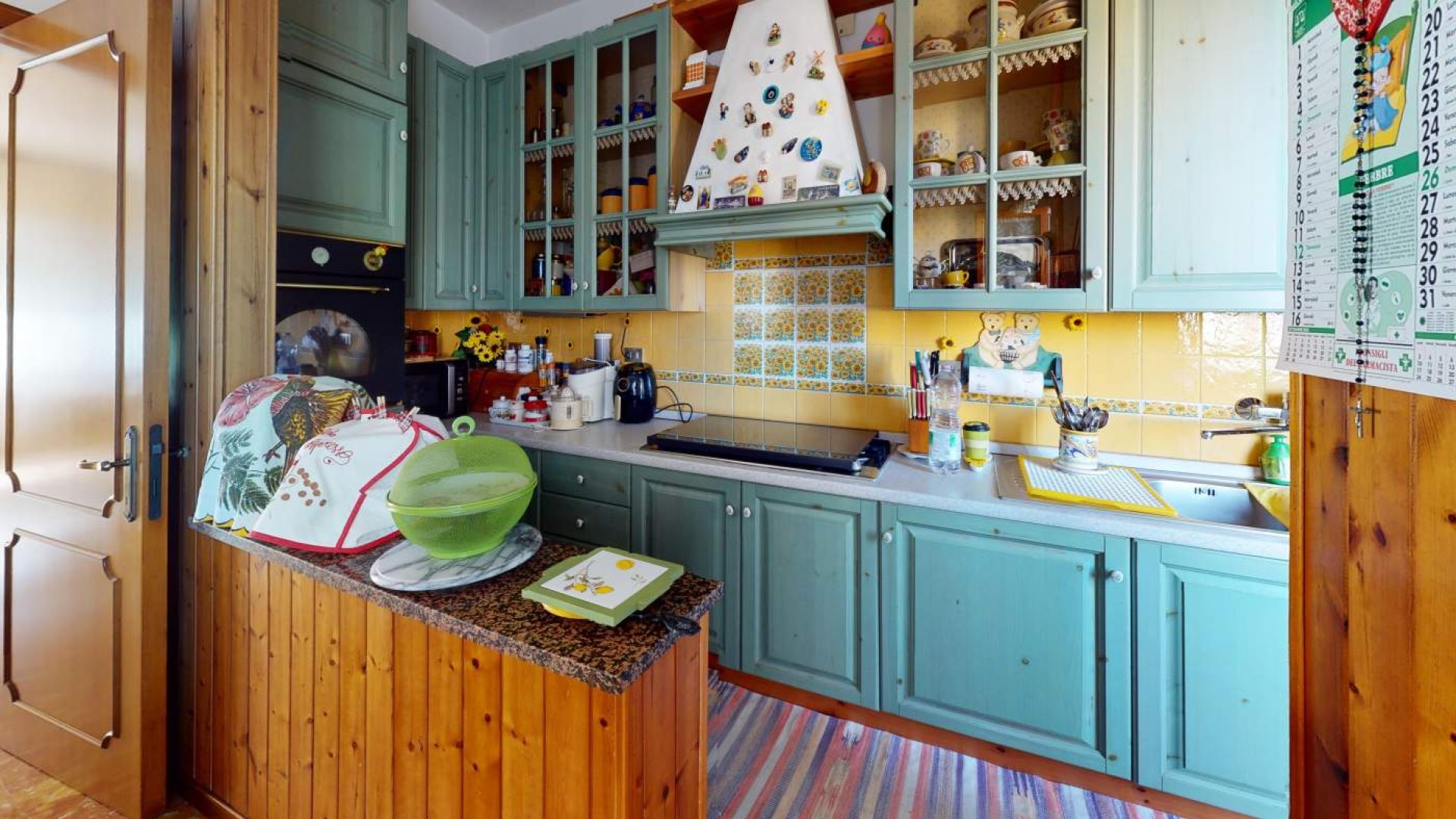 La zona giorno continua con una sala da pranzo separata, arricchita da una cucina a vista funzionale e ben organizzata, che si affaccia su un balcone verandato completo di zona lavanderia.
