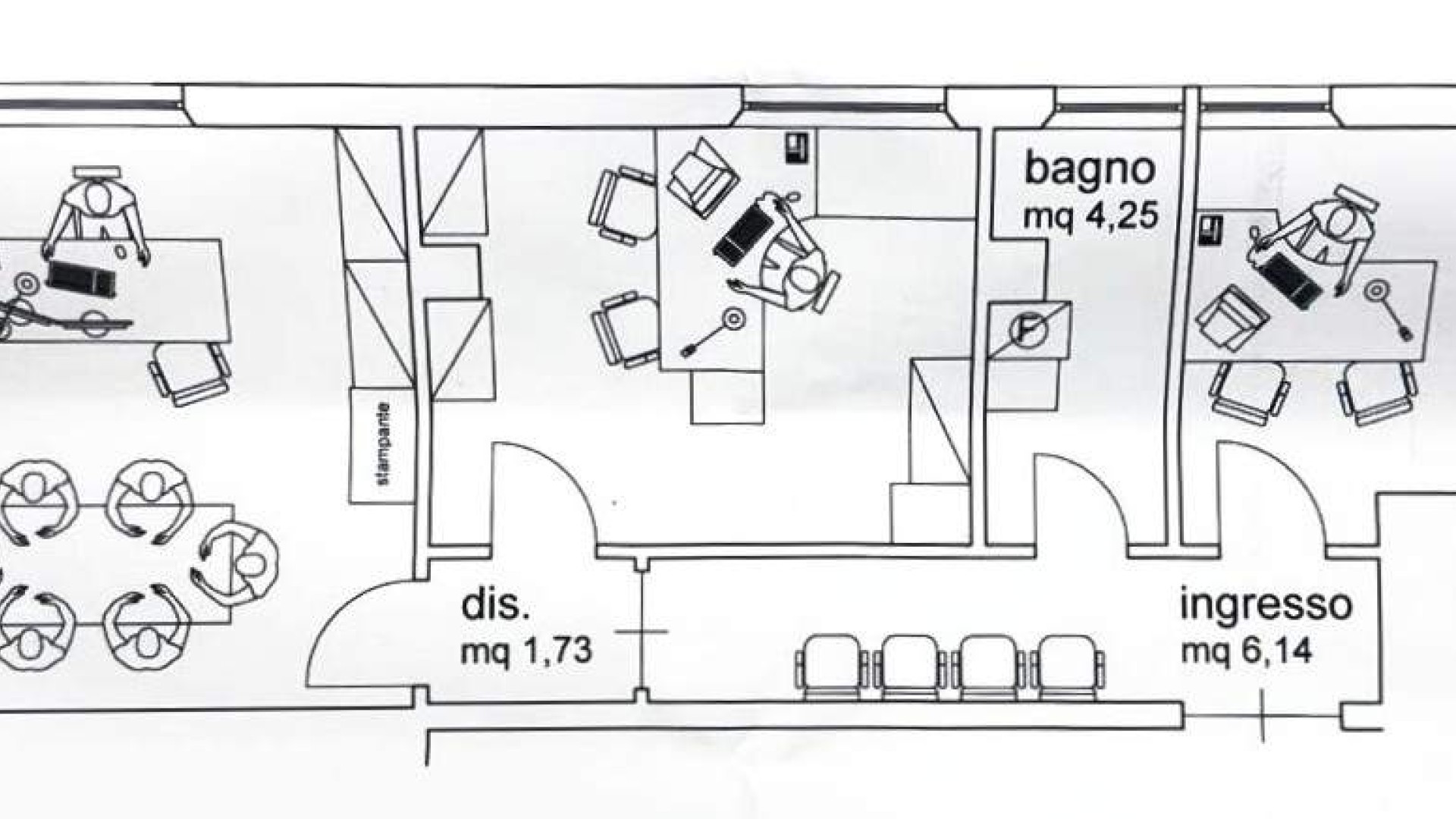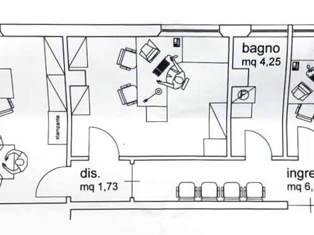 L’ingresso si apre su un pratico disimpegno che distribuisce armoniosamente gli ambienti, composti da due studi riservati, ideali per attività operative o consulenziali, e da una sala riunioni ampia e luminosa, perfetta per accogliere clienti e collaboratori in un contesto professionale e rappresentativo.
