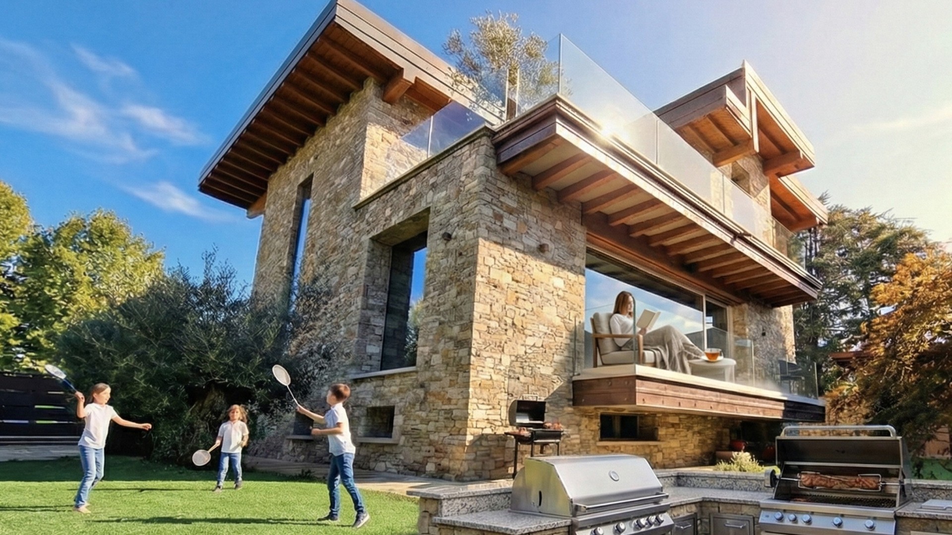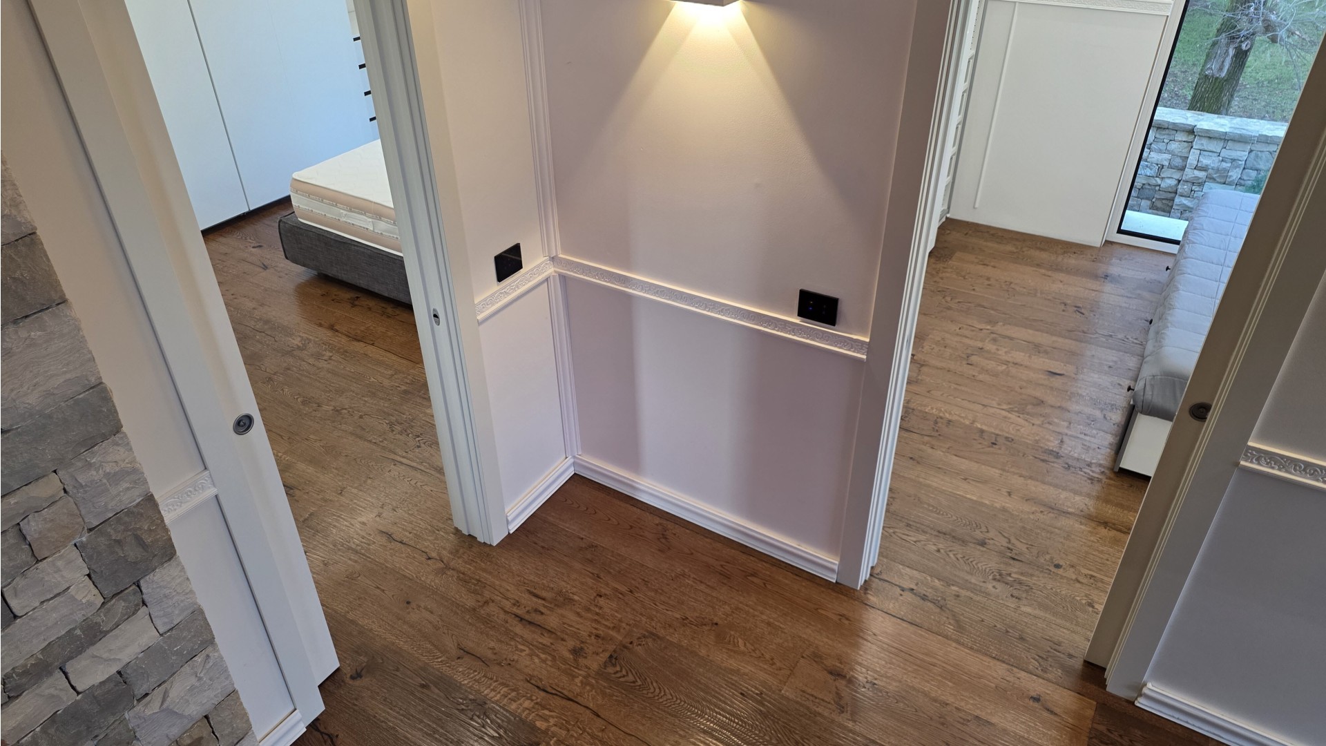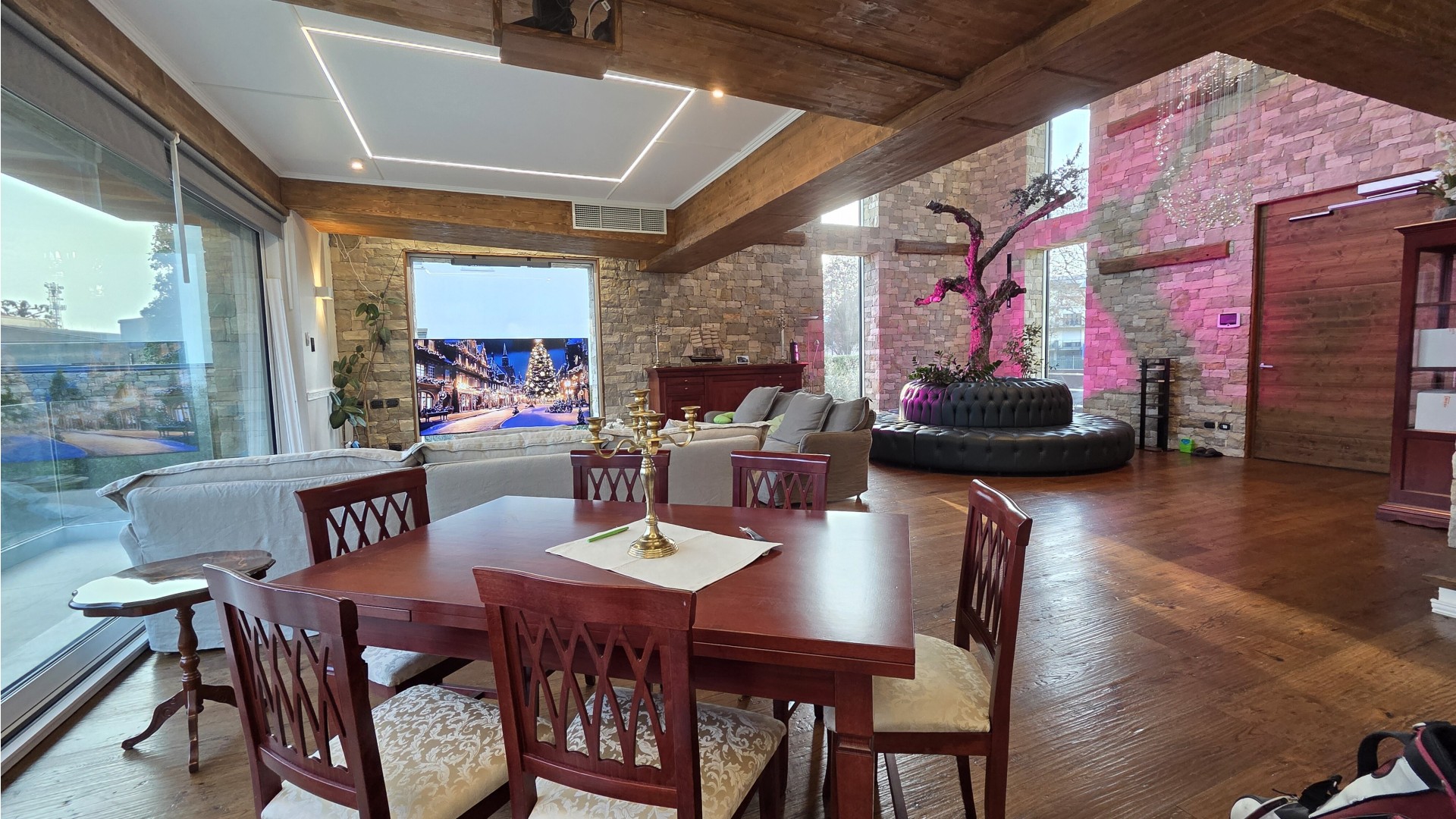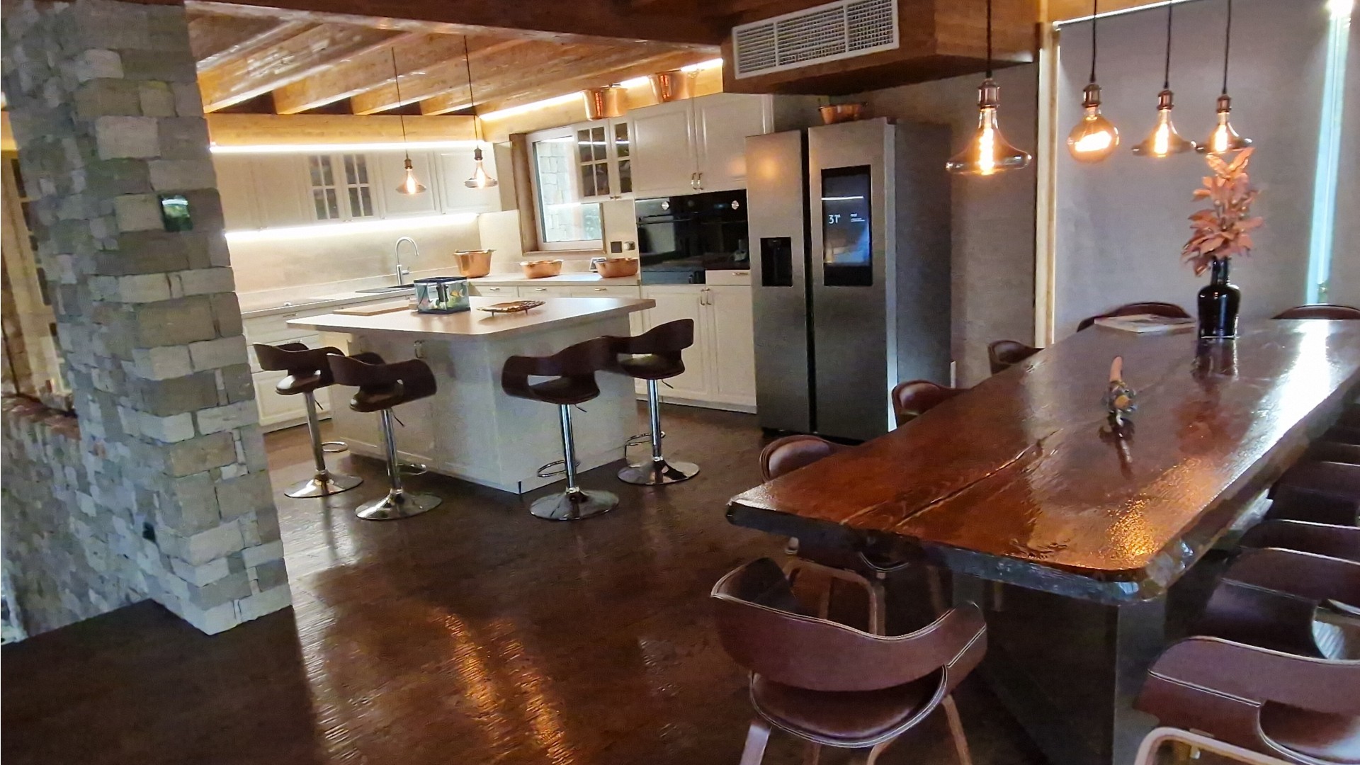 Il cuore della casa è rappresentato da un ampio soggiorno open space a doppia altezza, impreziosito da finiture di alto livello, parquet in rovere e dettagli in pietra naturale. La zona giorno prosegue con una cucina di design completamente attrezzata, zona pranzo e area living/TV, spazi ideali sia per la vita quotidiana sia per momenti di convivialità.