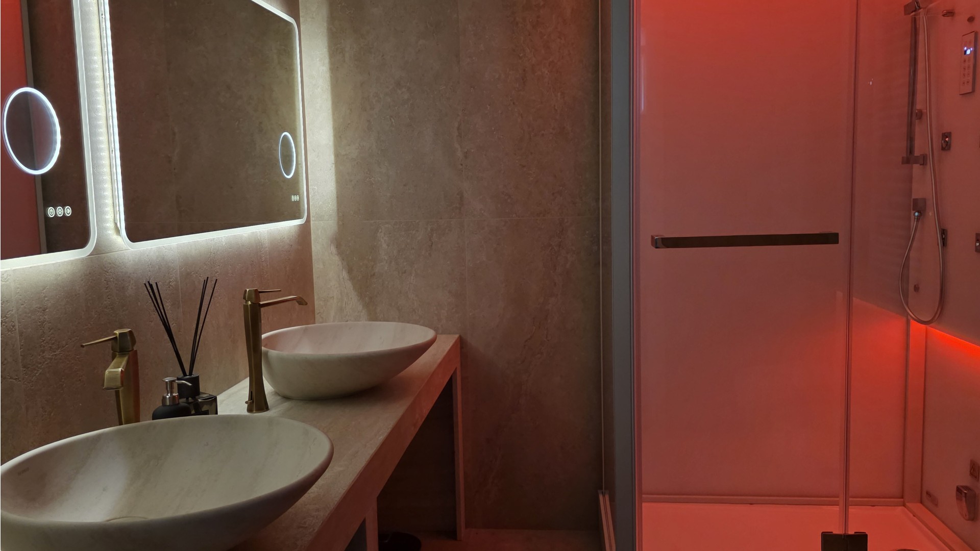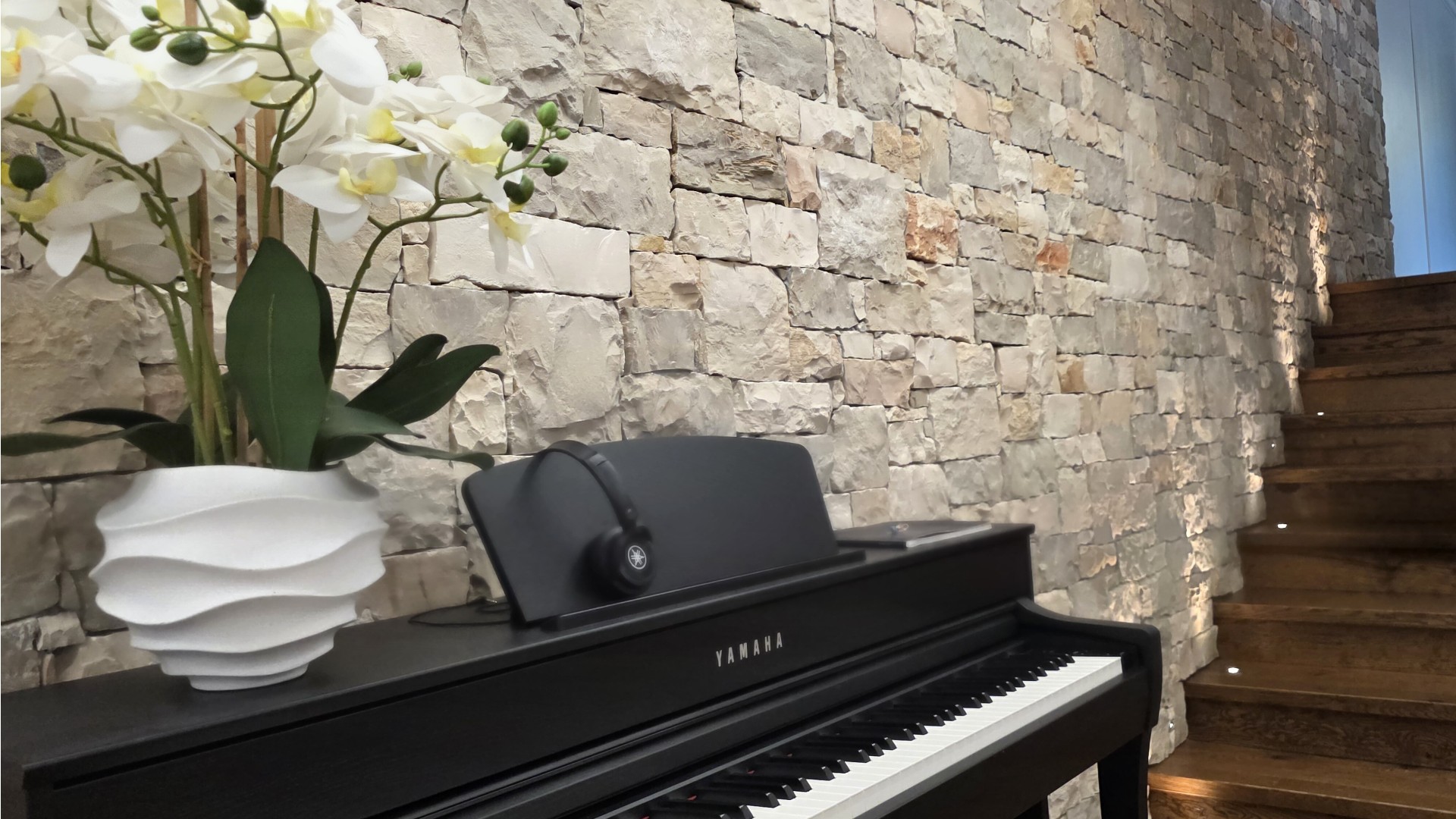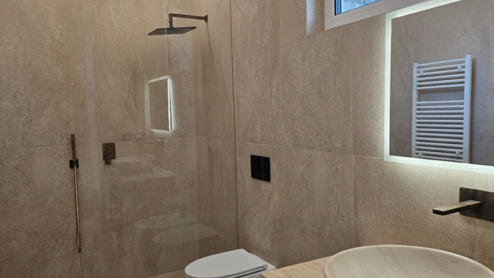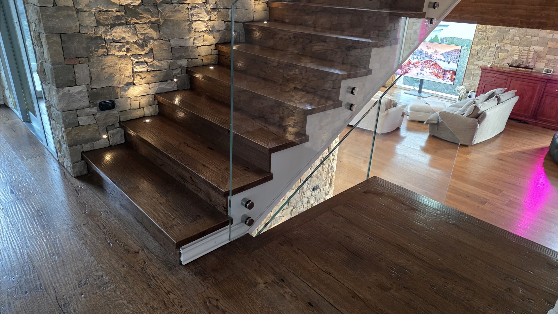 Il cuore della casa è rappresentato da un ampio soggiorno open space a doppia altezza, impreziosito da finiture di alto livello, parquet in rovere e dettagli in pietra naturale. La zona giorno prosegue con una cucina di design completamente attrezzata, zona pranzo e area living/TV, spazi ideali sia per la vita quotidiana sia per momenti di convivialità.