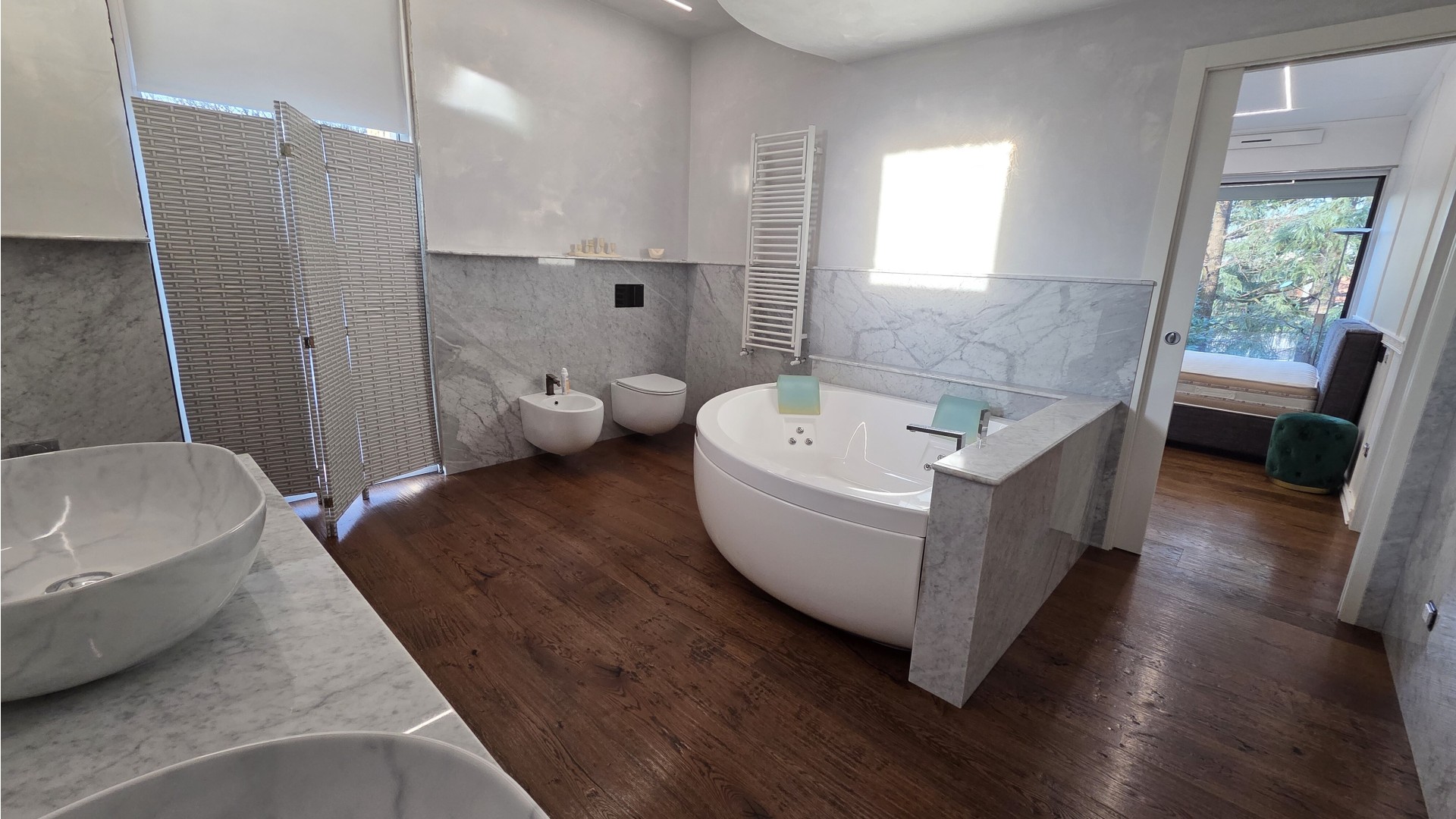 La master suite offre una raffinata cabina armadio e un bagno en suite con vasca idromassaggio. La proprietà dispone inoltre di ulteriori camere da letto con servizi dedicati e spazi pensati per il massimo comfort.